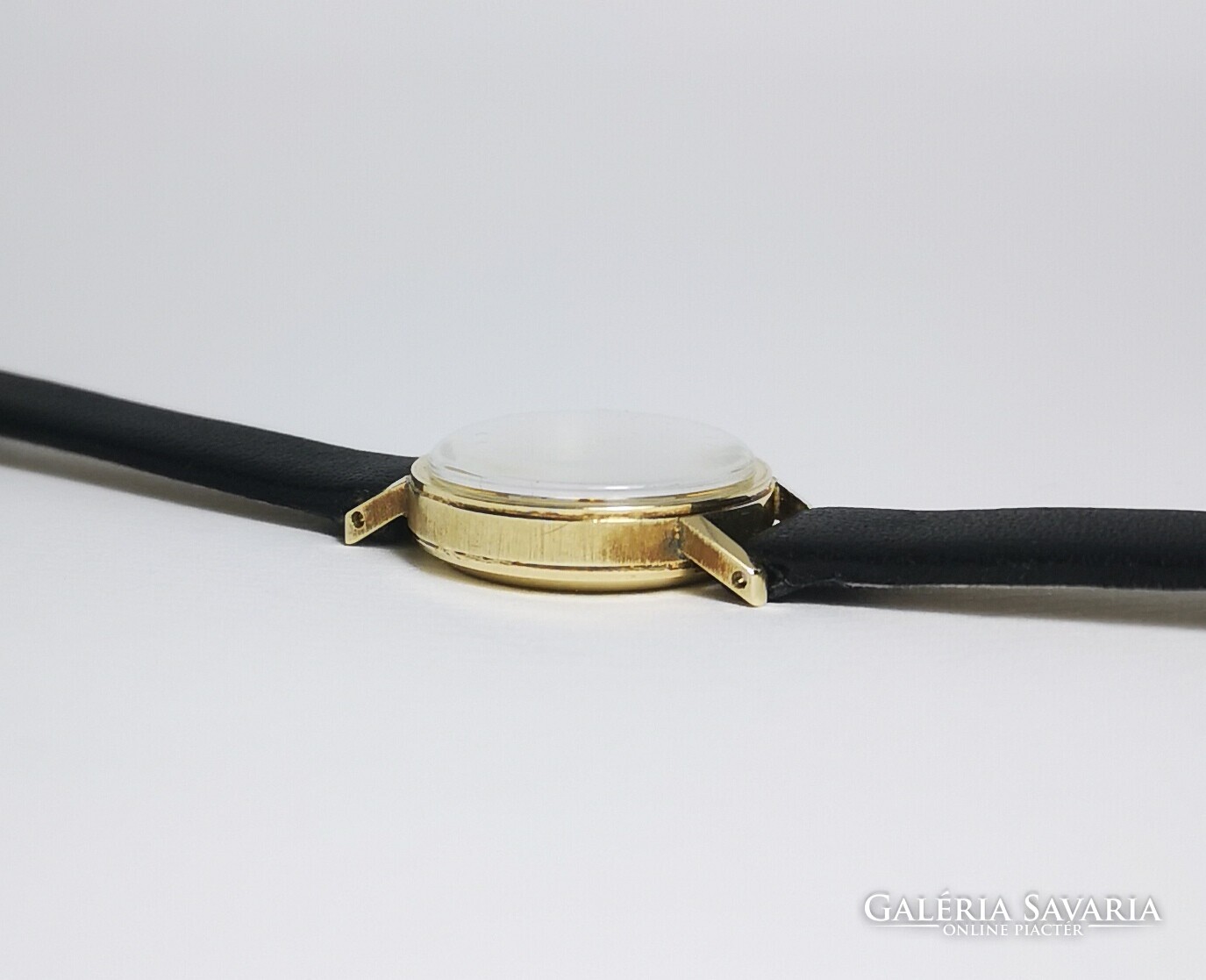 A karóra számlapja letisztult és elegáns, finom arany tónusú felülettel, amely tökéletesen harmonizál a 14 karátos arany tokkal.