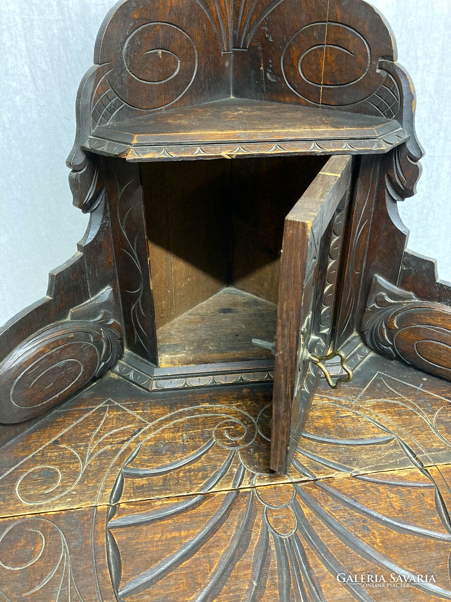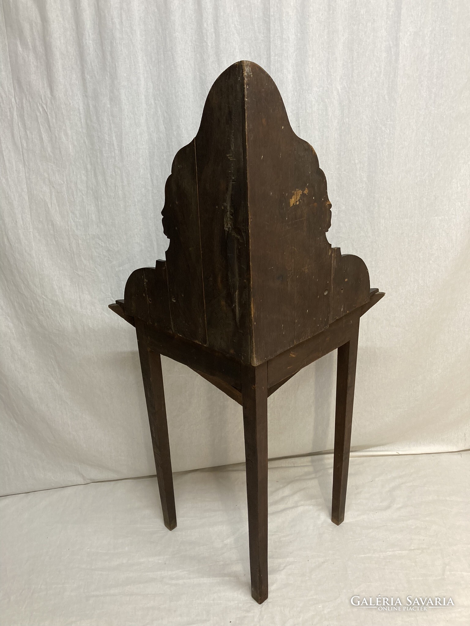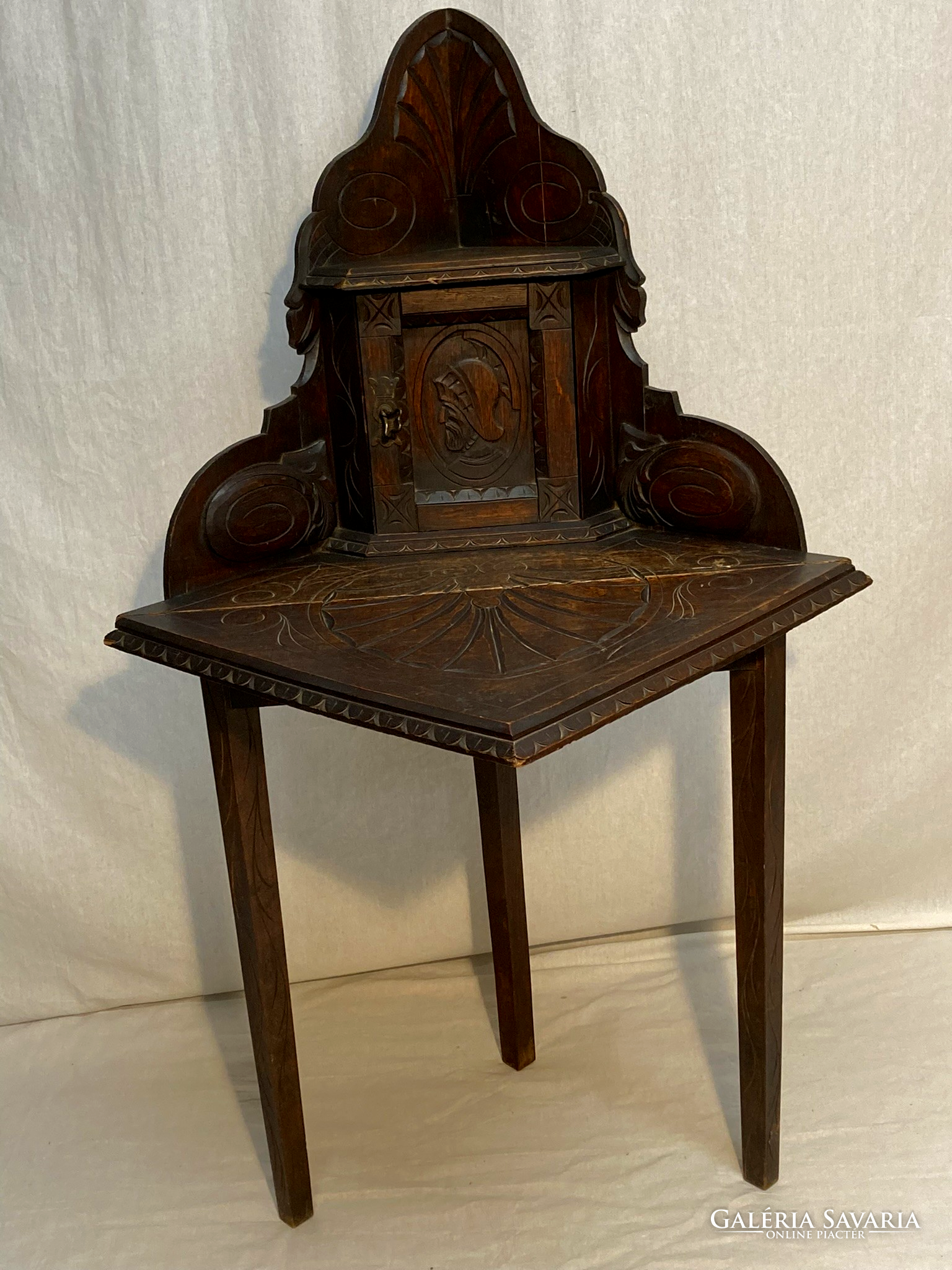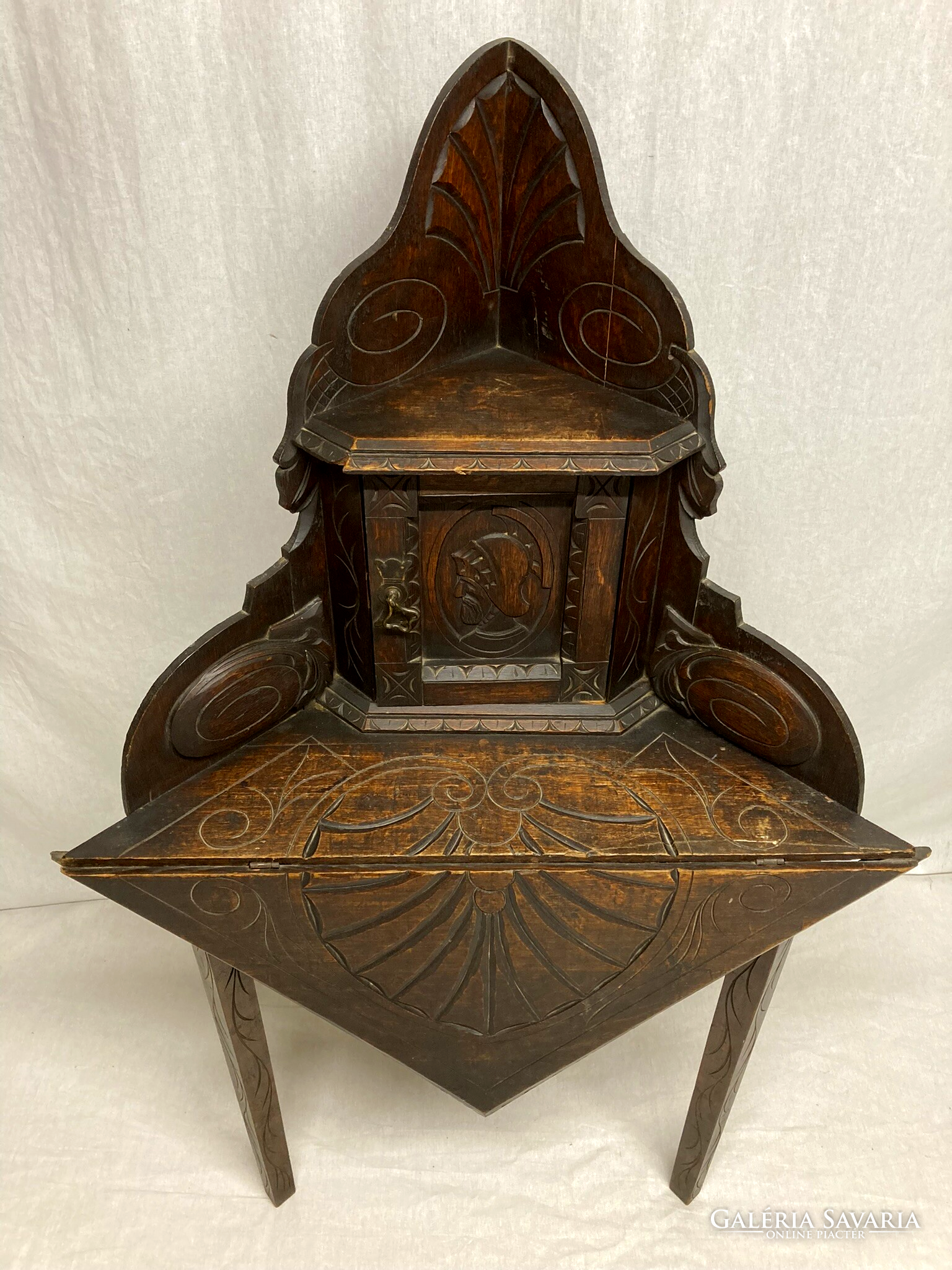 Gótikus sarok asztal, dohány,biblia tároló kis szekrénnyel, az ajtón sisakos lovagfej ábrázolással. Az asztal lapját,(mely lenyitható) vésett motivumok diszitik ,a lábakon végigfutó inda faragással. A bútor szerkezetileg stabil, korához képest szép állapotú.Anyaga tölgy. Igazán ritka antik darab!