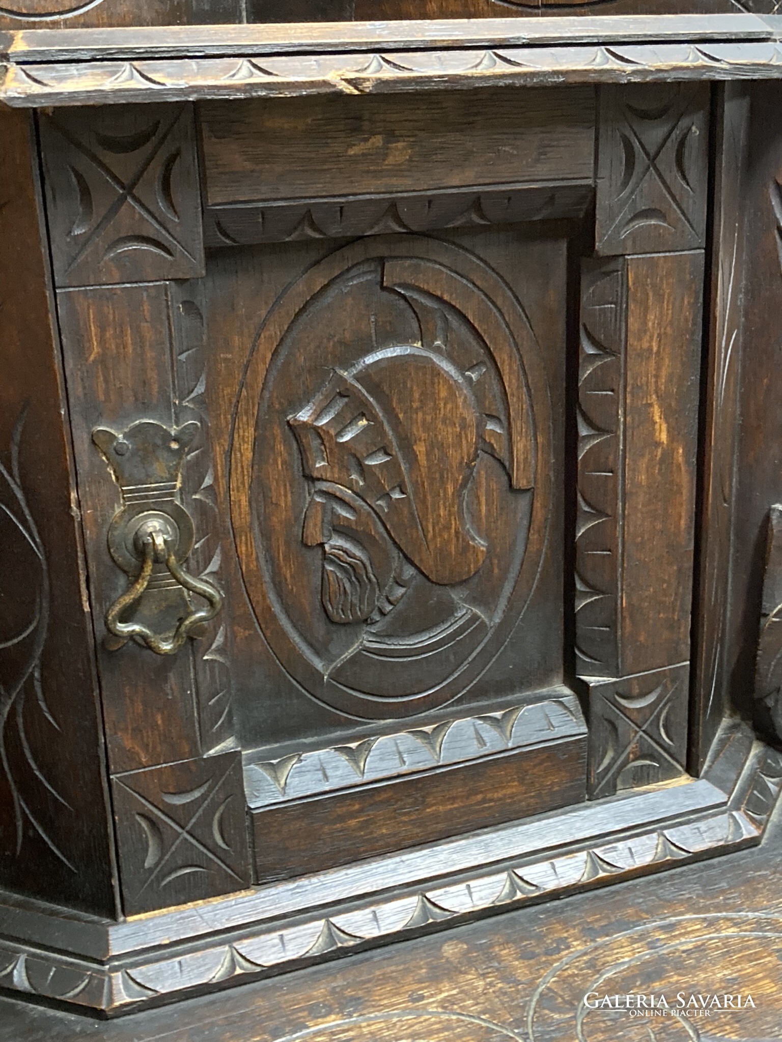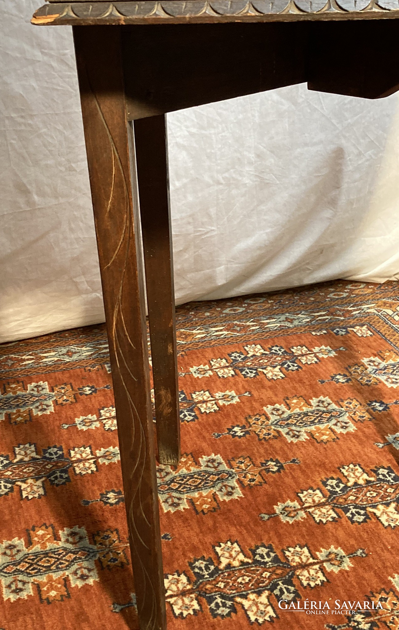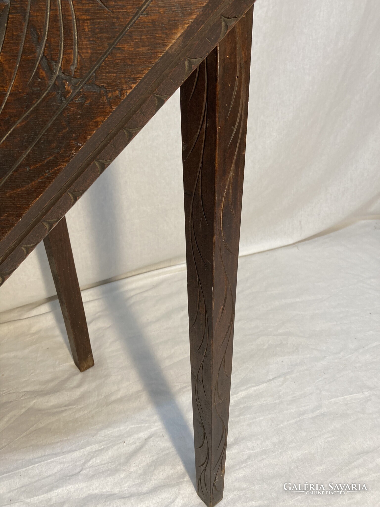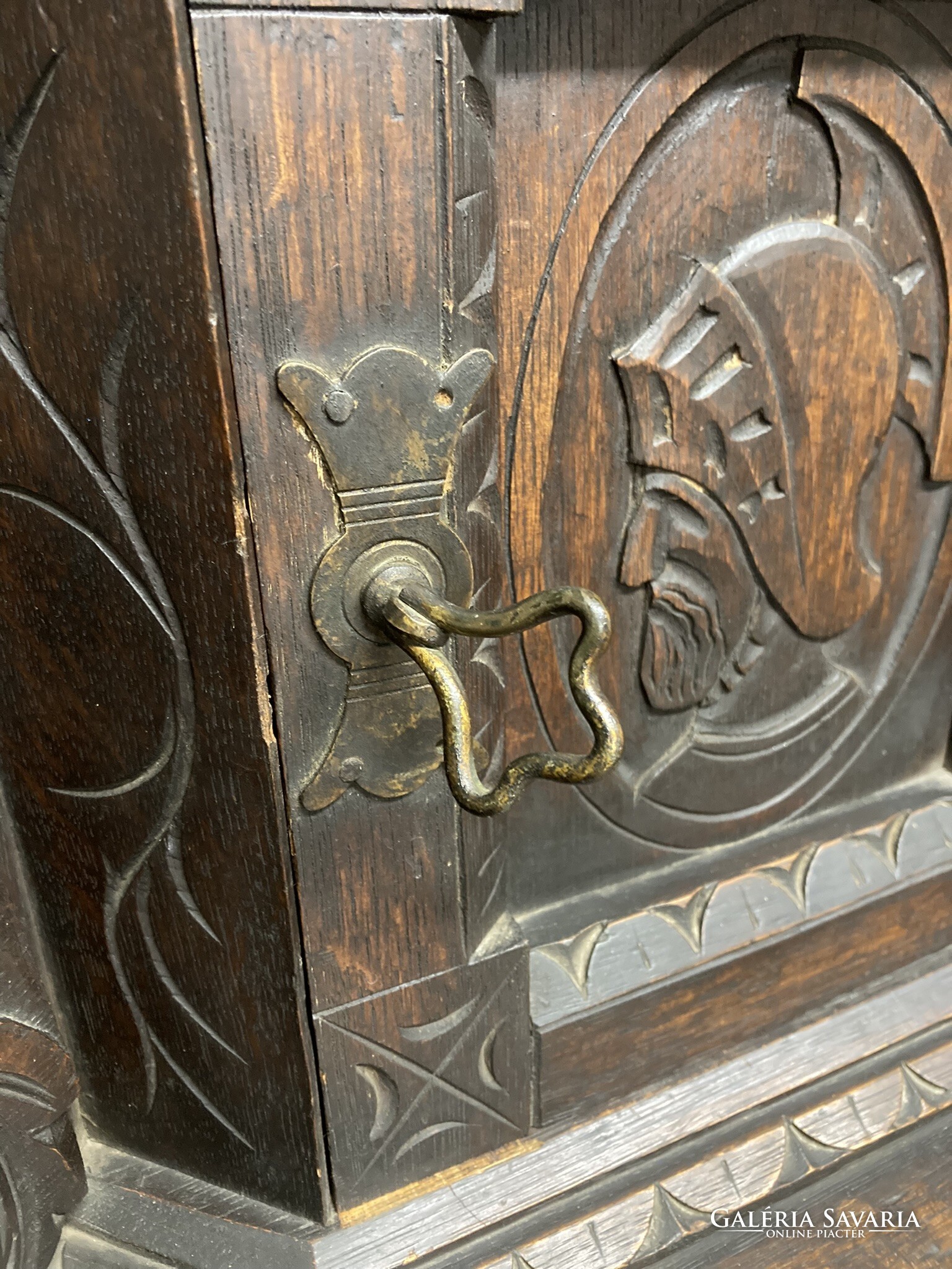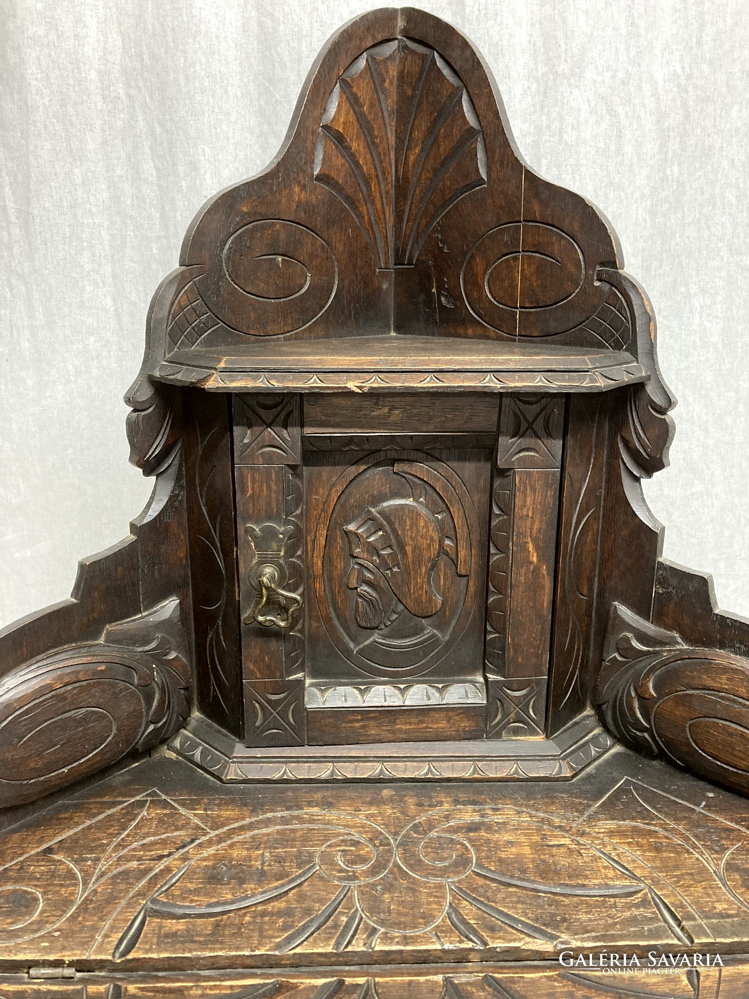 Gótikus sarok asztal, dohány,biblia tároló kis szekrénnyel, az ajtón sisakos lovagfej ábrázolással. Az asztal lapját,(mely lenyitható) vésett motivumok diszitik ,a lábakon végigfutó inda faragással. A bútor szerkezetileg stabil, korához képest szép állapotú.Anyaga tölgy. Igazán ritka antik darab!