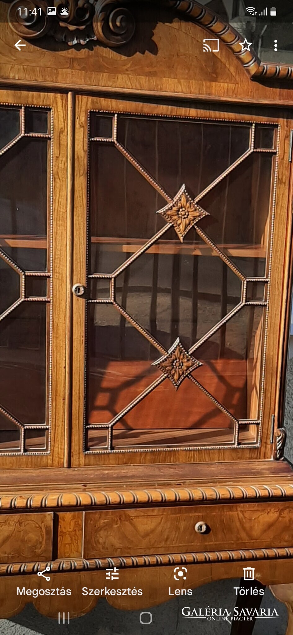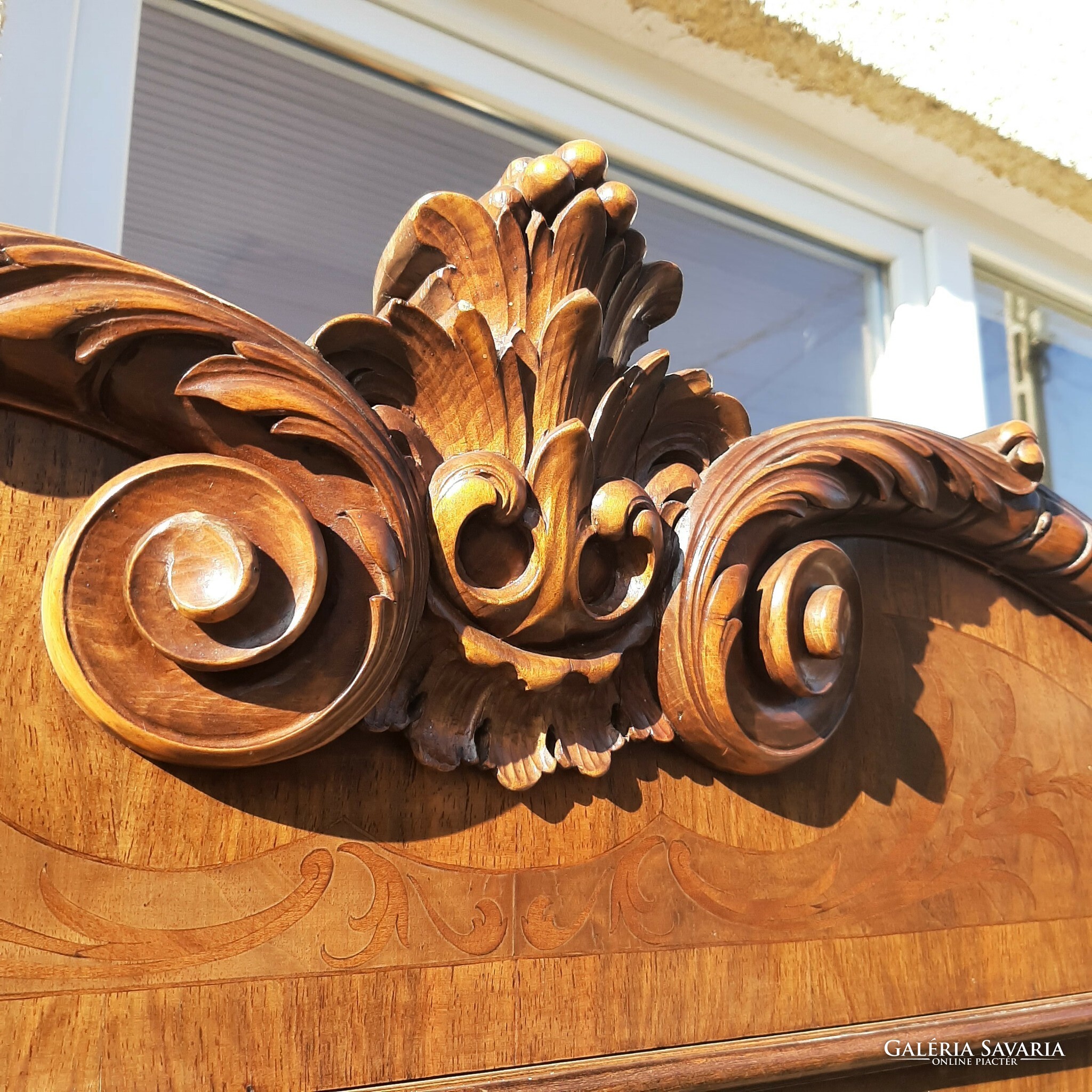 Eladó egy antik csodás faragásos impozáns nagy vitrines két fiókos szekrény. Pontos korát nem tudom, sok évtizedes. Megkímélt. A felső része levehető. Két polcos a felső része.128cm széles, 48 cm mély és 2 méter magas,kettévéve nem túl nehéz,csak a szélte miatt két emberes. Pécelen lehet átvenni,2-3km-re az M0 autópályától. Postázni nem tudom.