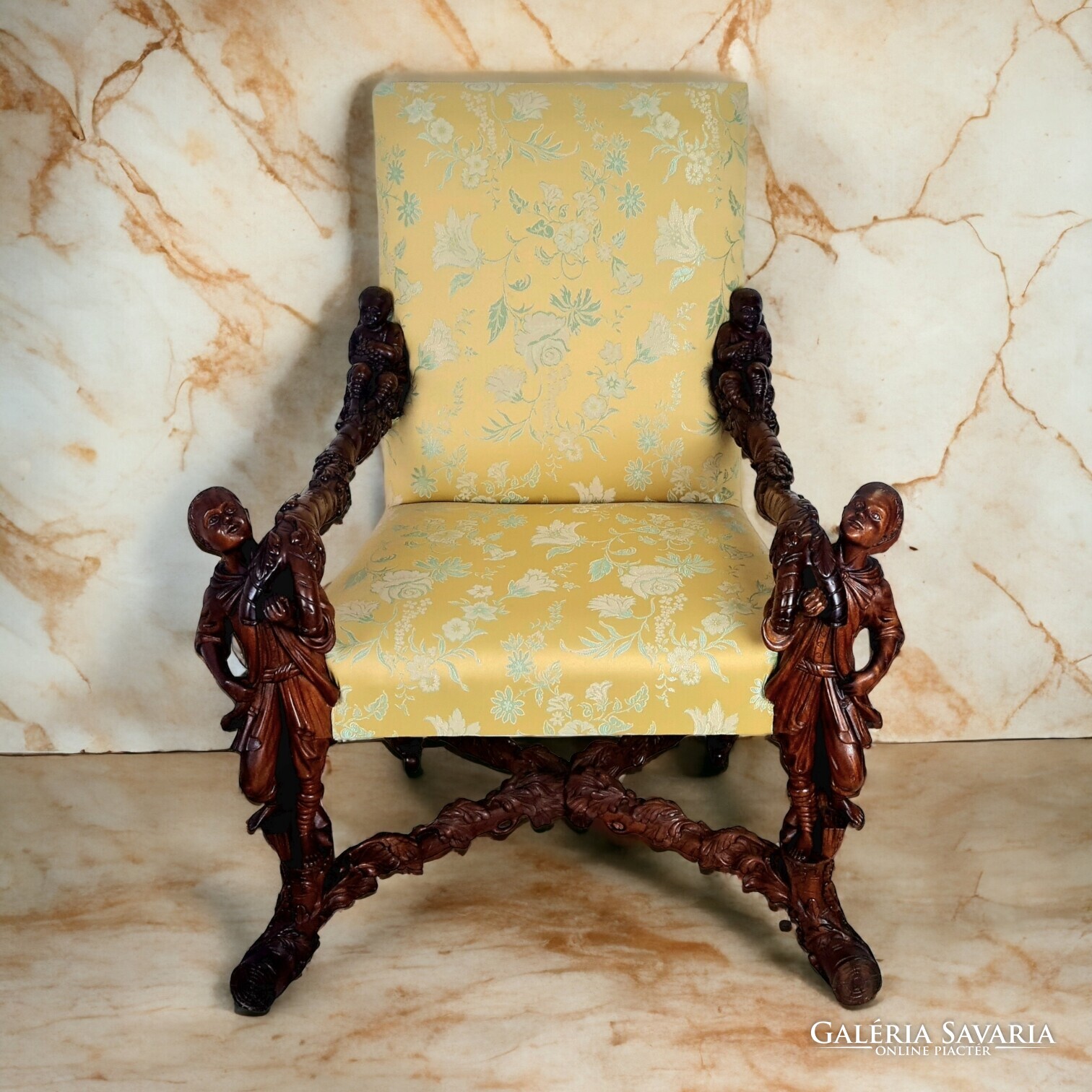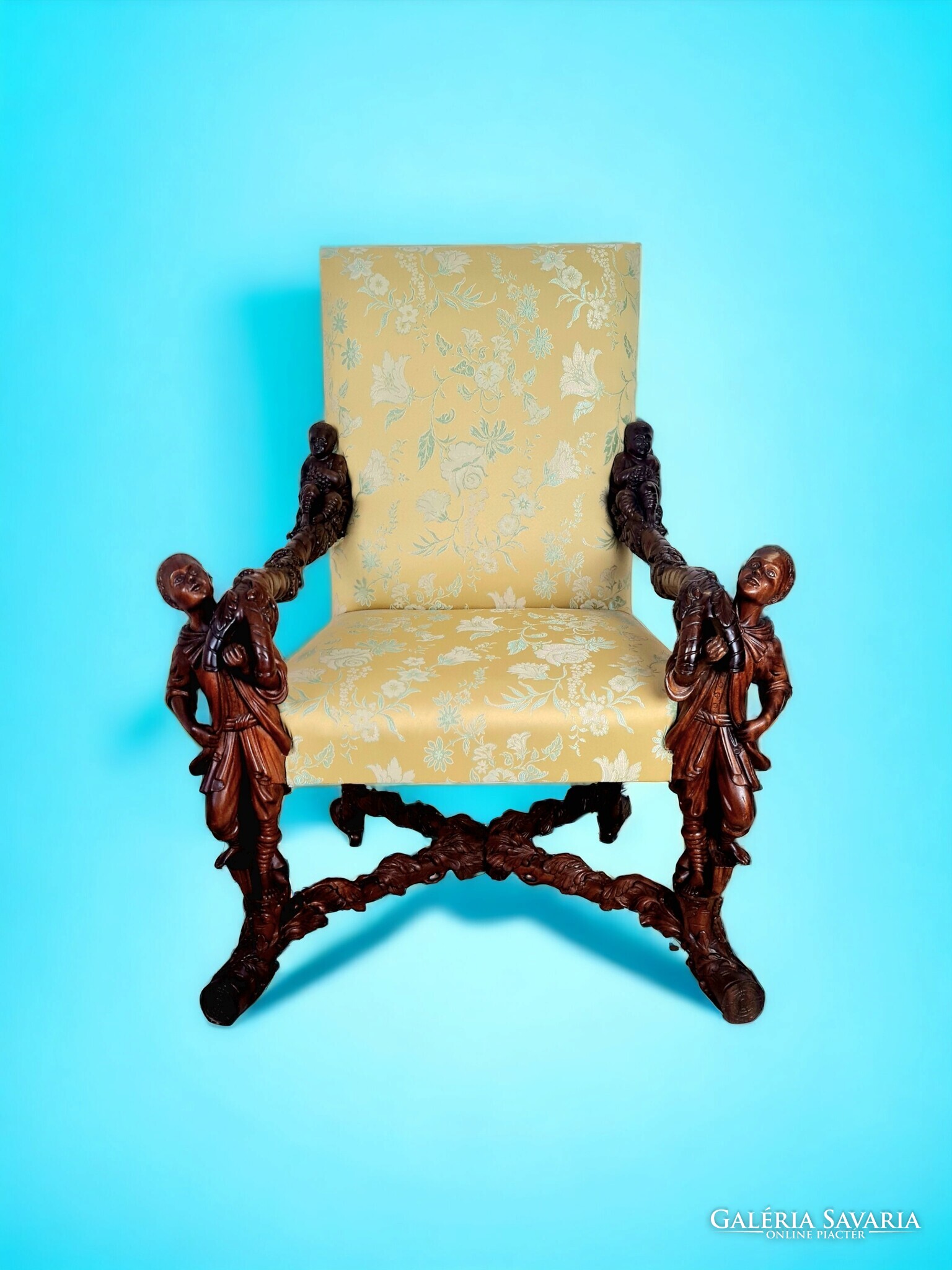 - Négy emberi alak (valószínűleg mór vagy keleti figurák) támasztja a fotel szerkezetét