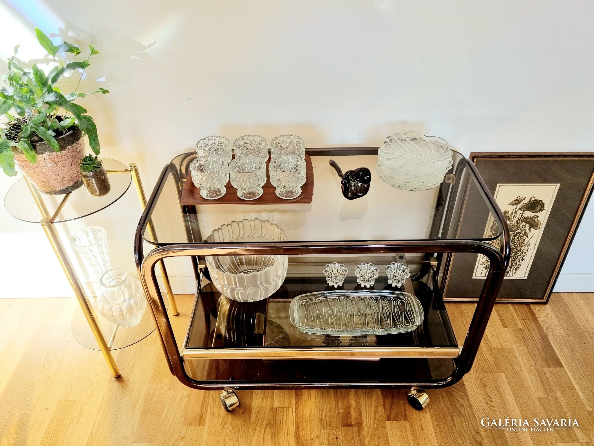 Elegáns mid-century gurulós állvány különleges színben. Az egyik uveglap két sarka lepattant, a vázon használati nyomok (fotók). Szélessége 83 cm, mélysége 42 cm, magassága 62 cm.