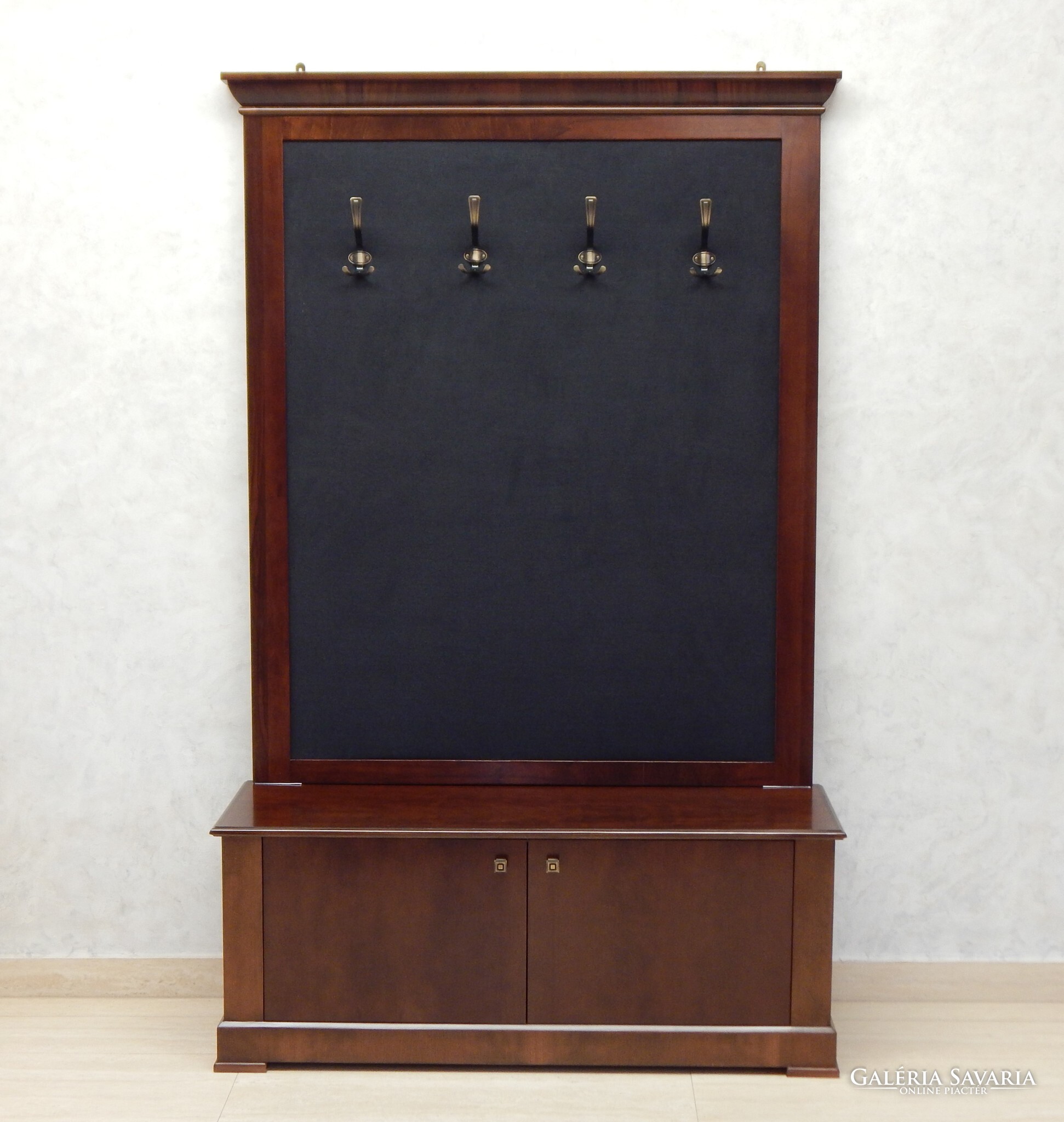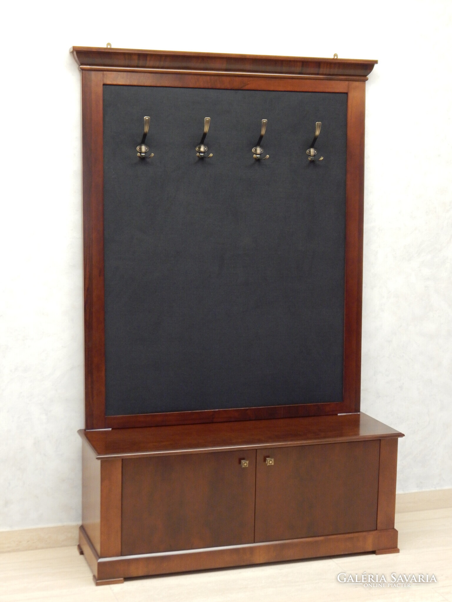 Diófa, vagy cseresznyefa borítással, bézs színű textilbőr kárpitozással,eloxált réz fogassal.
