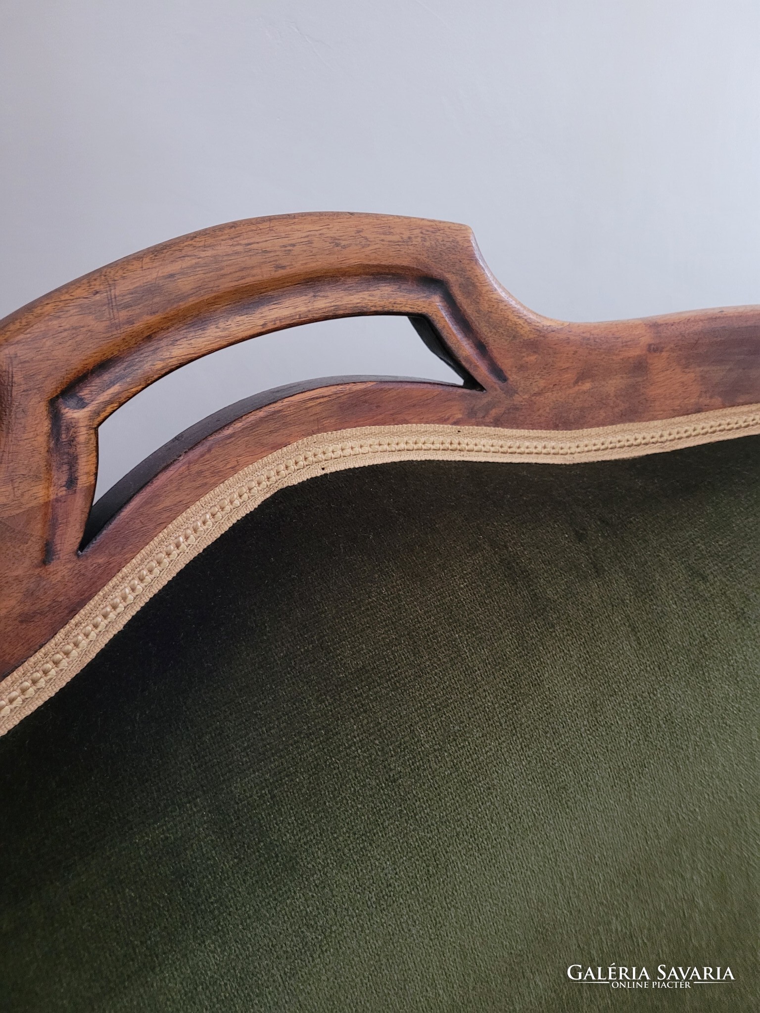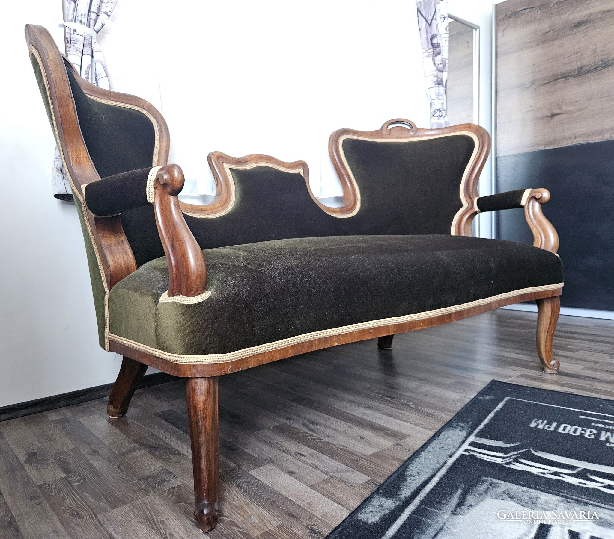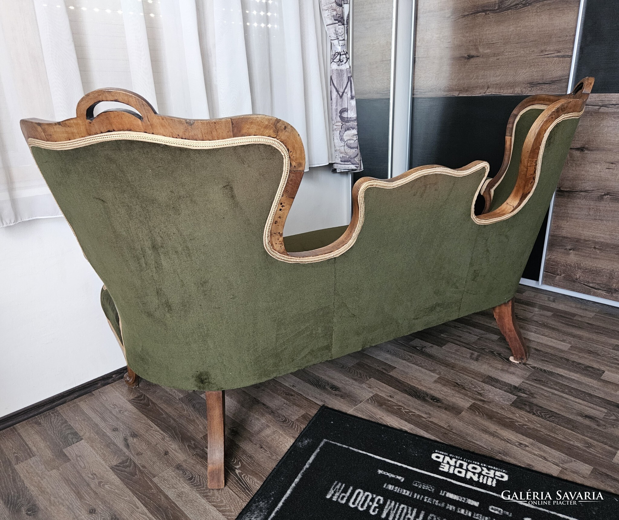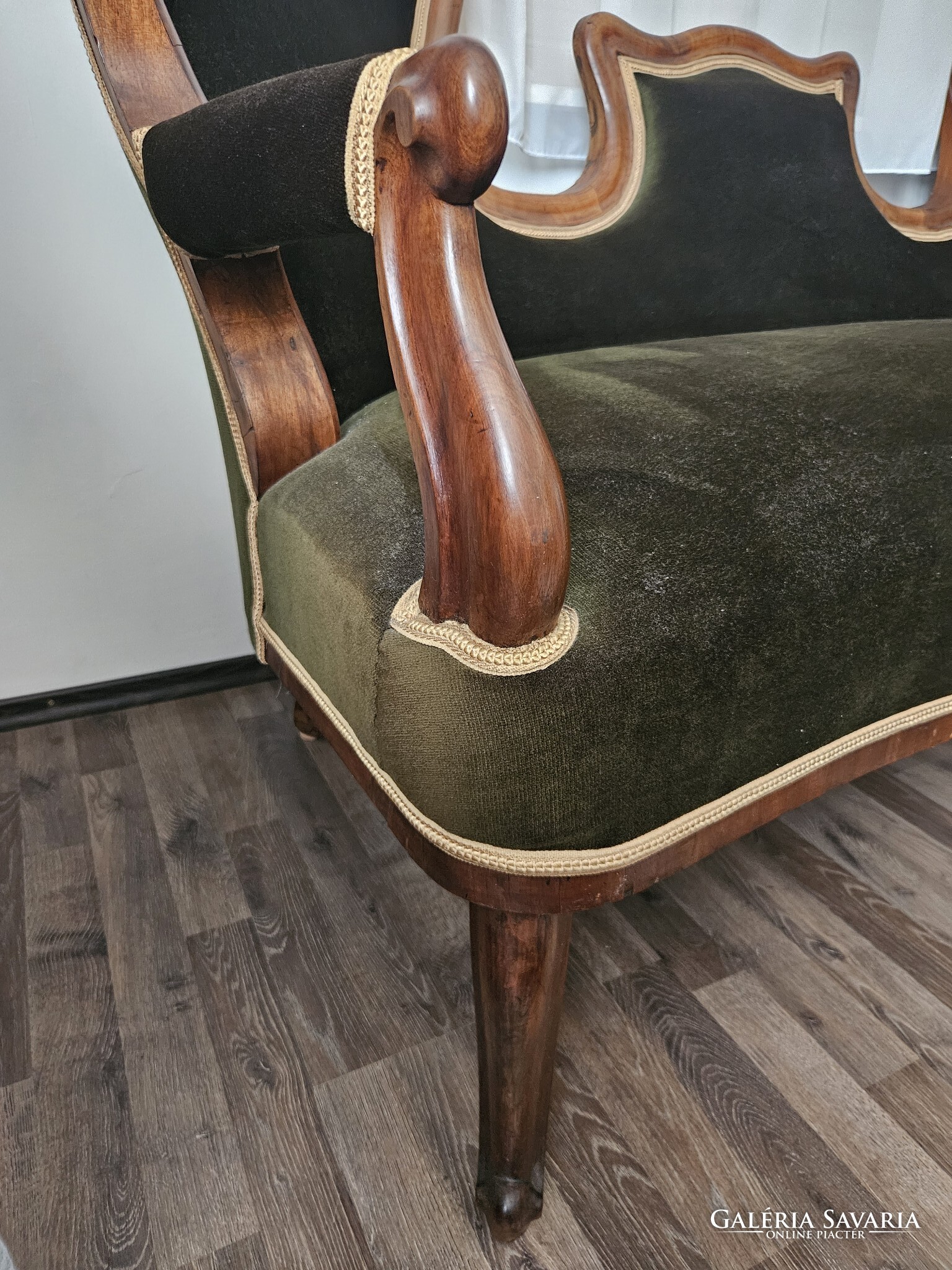 Kanapé: Magas háttámla hármas osztású, felül két oldalt áttört, letisztult, ívelt faragással díszített. Hátul ívelt, elöl szépen faragott lábakon áll.