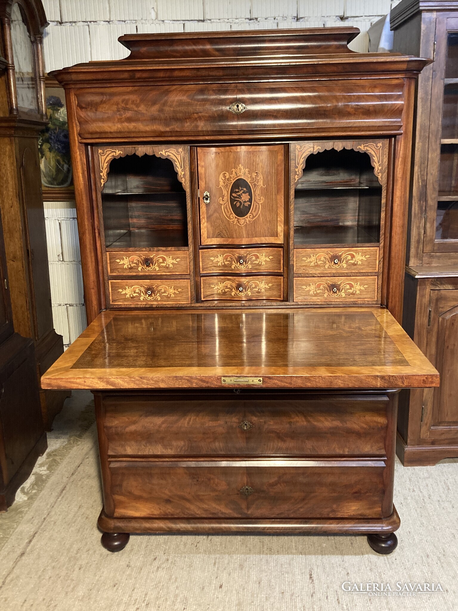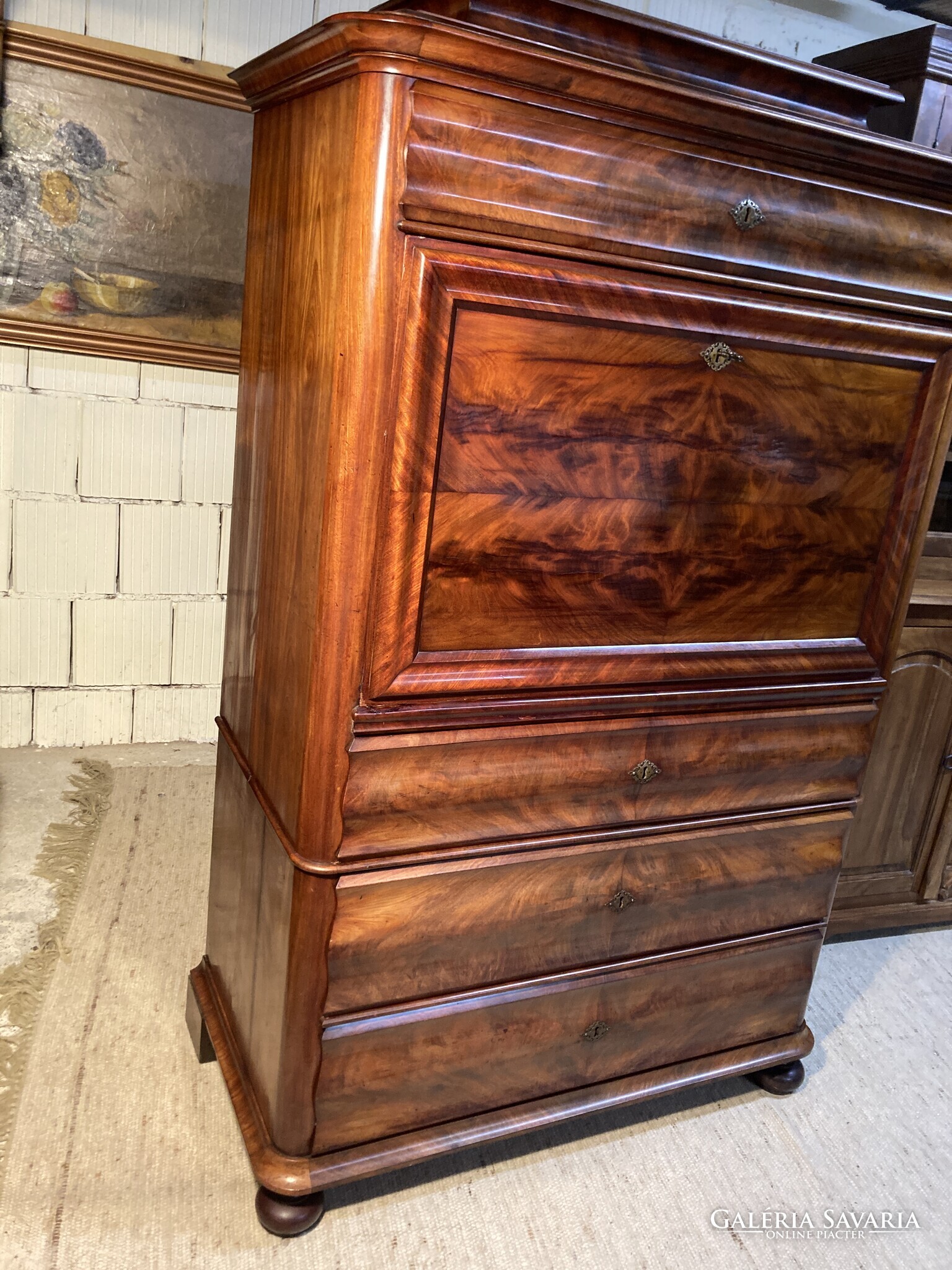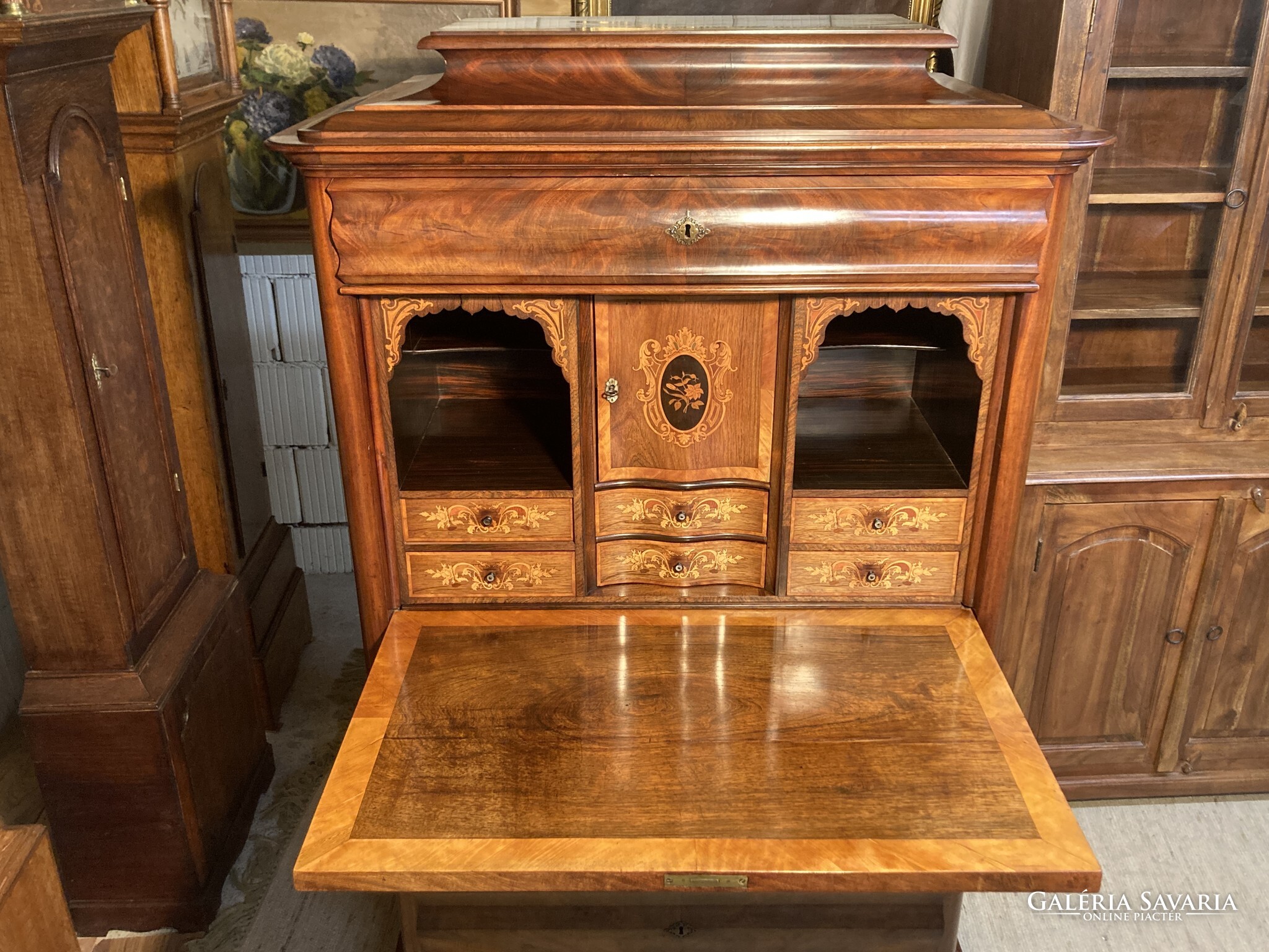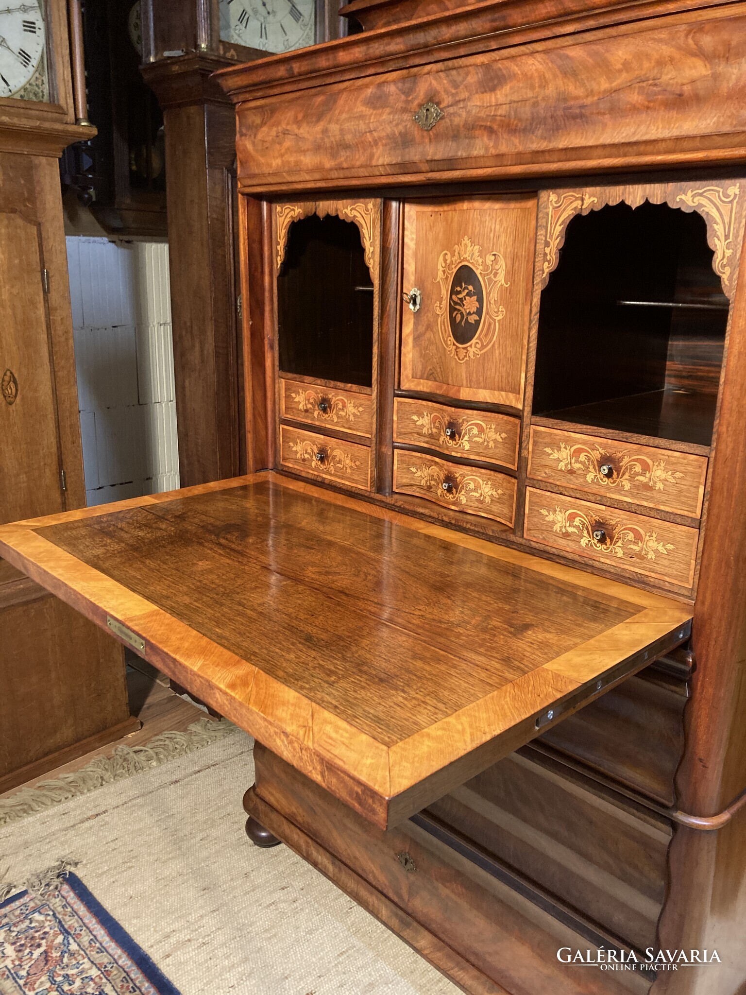 Eladásra kínálom ezt a gyönyörű állapotban megőrzött, 19. századi Biedermeier stílusú írószekretert.A bútordarab valódi mestermunka: gondosan megmunkált dió furnér, elegáns intarziás díszítések. Praktikus lehajtható írólap, és több fiók biztosítja a tárolási lehetősséget. A belső rész gazdagon díszített, korabeli stílusjegyeket visel magán. Az alsó rész íves fiókjai szintén tipikusak a Biedermeier időszakra. Főbb jellemzők: kora 1830-1860, Stílus: klasszikus bécsi Biedermeier.Anyag: dió furnér, intarziás díszítések. Állapota. kiválóan megőrzött.