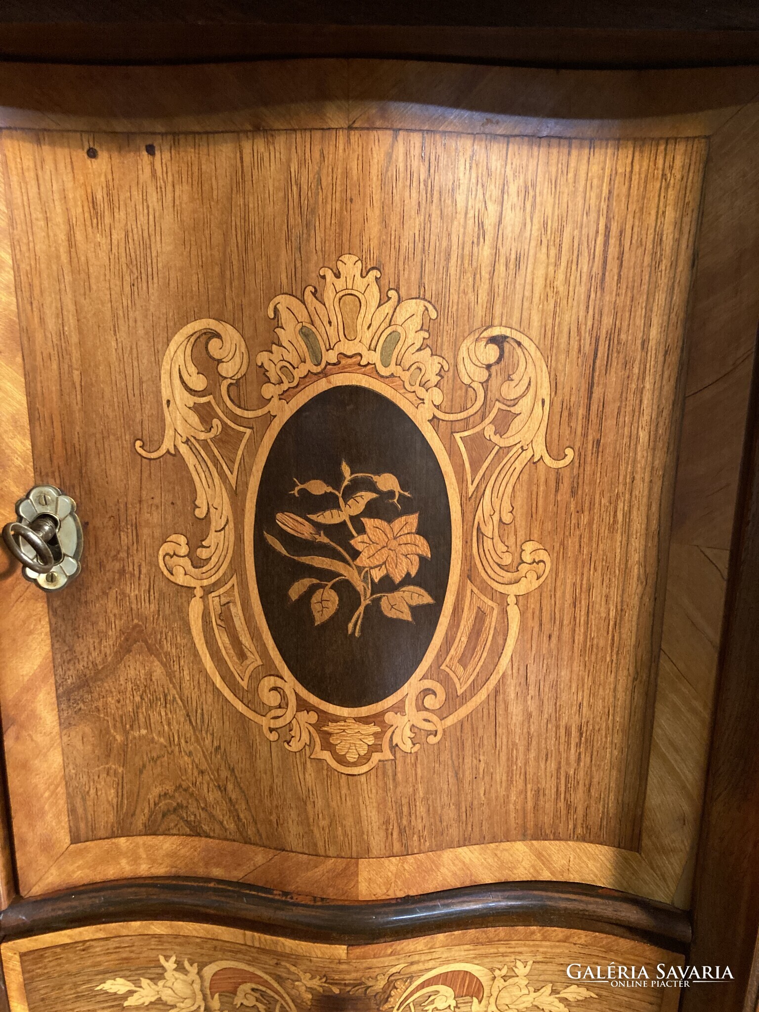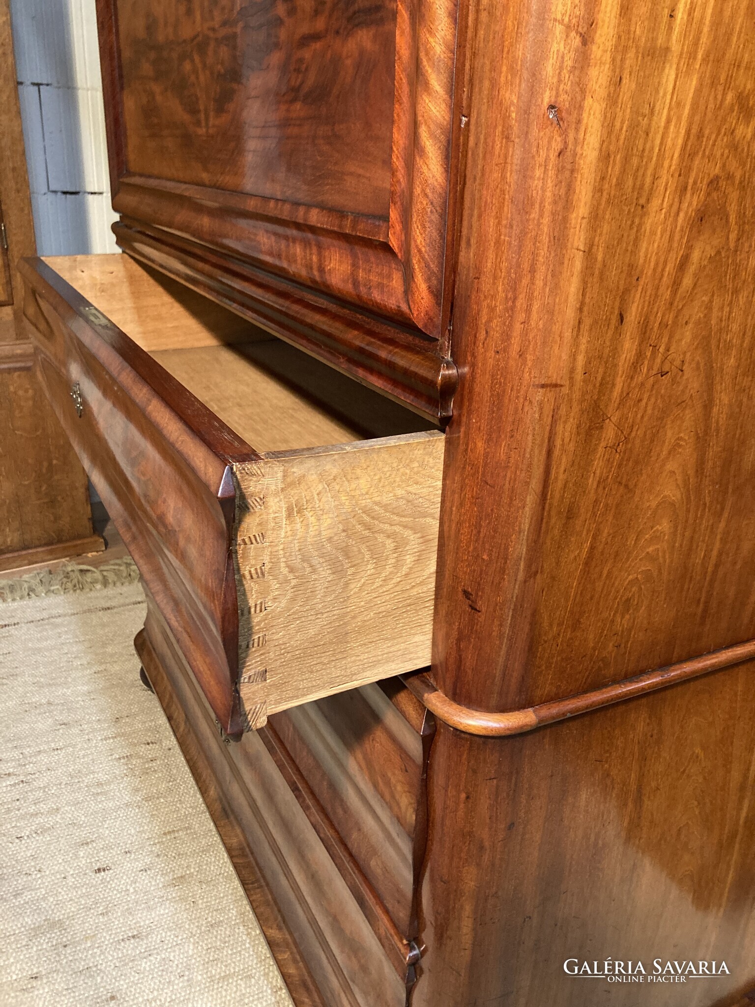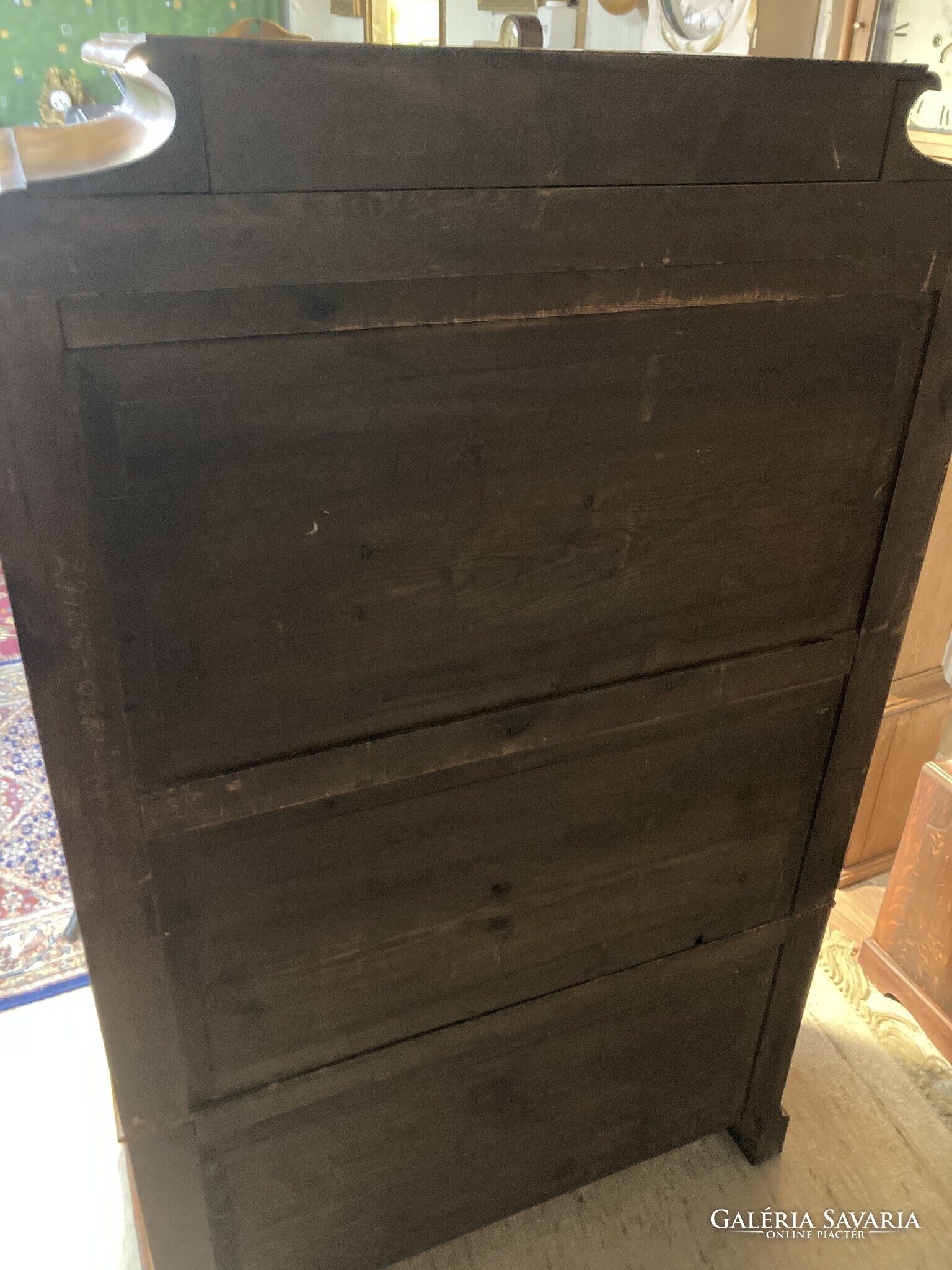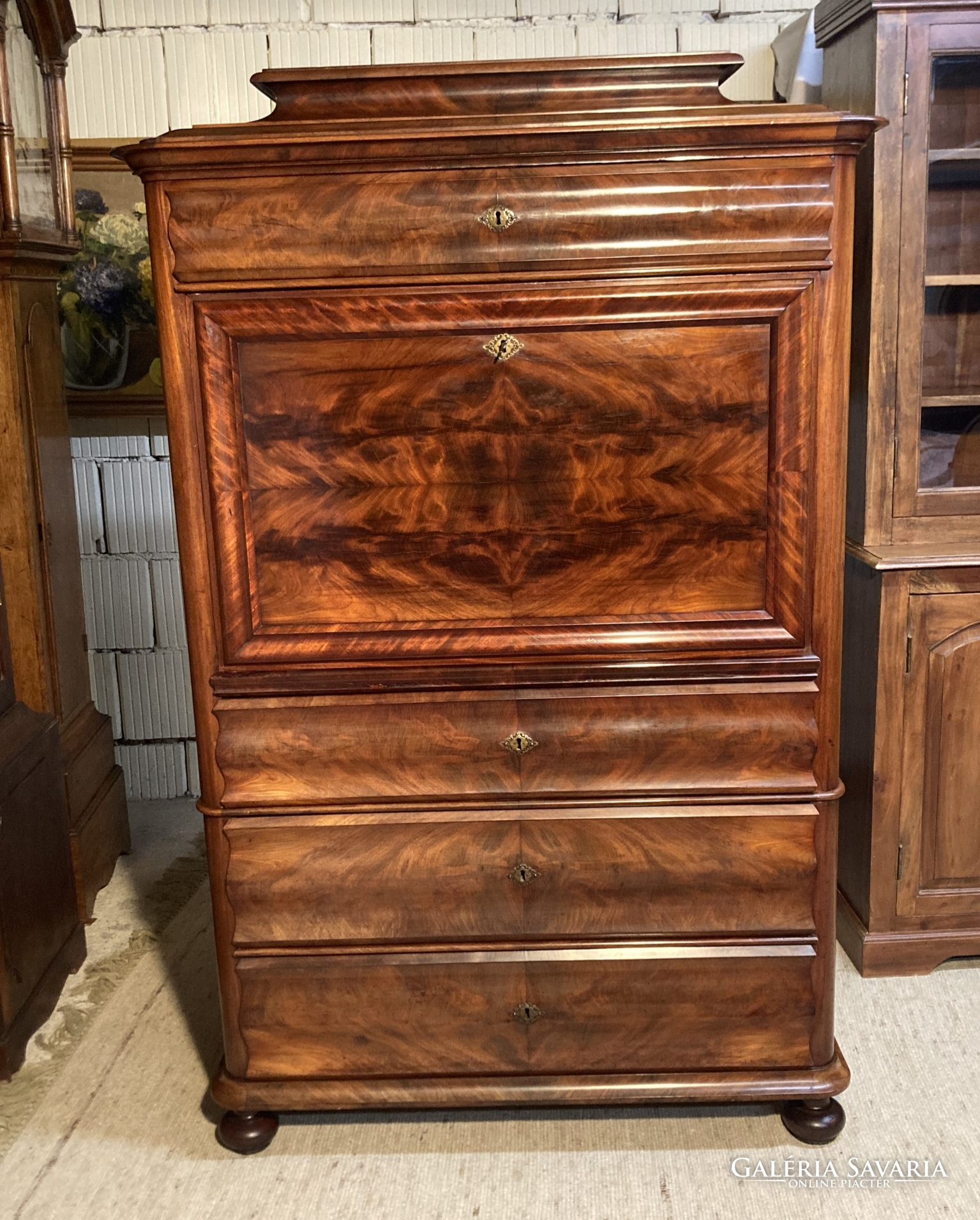 Eladásra kínálom ezt a gyönyörű állapotban megőrzött, 19. századi Biedermeier stílusú írószekretert.A bútordarab valódi mestermunka: gondosan megmunkált dió furnér, elegáns intarziás díszítések. Praktikus lehajtható írólap, és több fiók biztosítja a tárolási lehetősséget. A belső rész gazdagon díszített, korabeli stílusjegyeket visel magán. Az alsó rész íves fiókjai szintén tipikusak a Biedermeier időszakra. Főbb jellemzők: kora 1830-1860, Stílus: klasszikus bécsi Biedermeier.Anyag: dió furnér, intarziás díszítések. Állapota. kiválóan megőrzött.