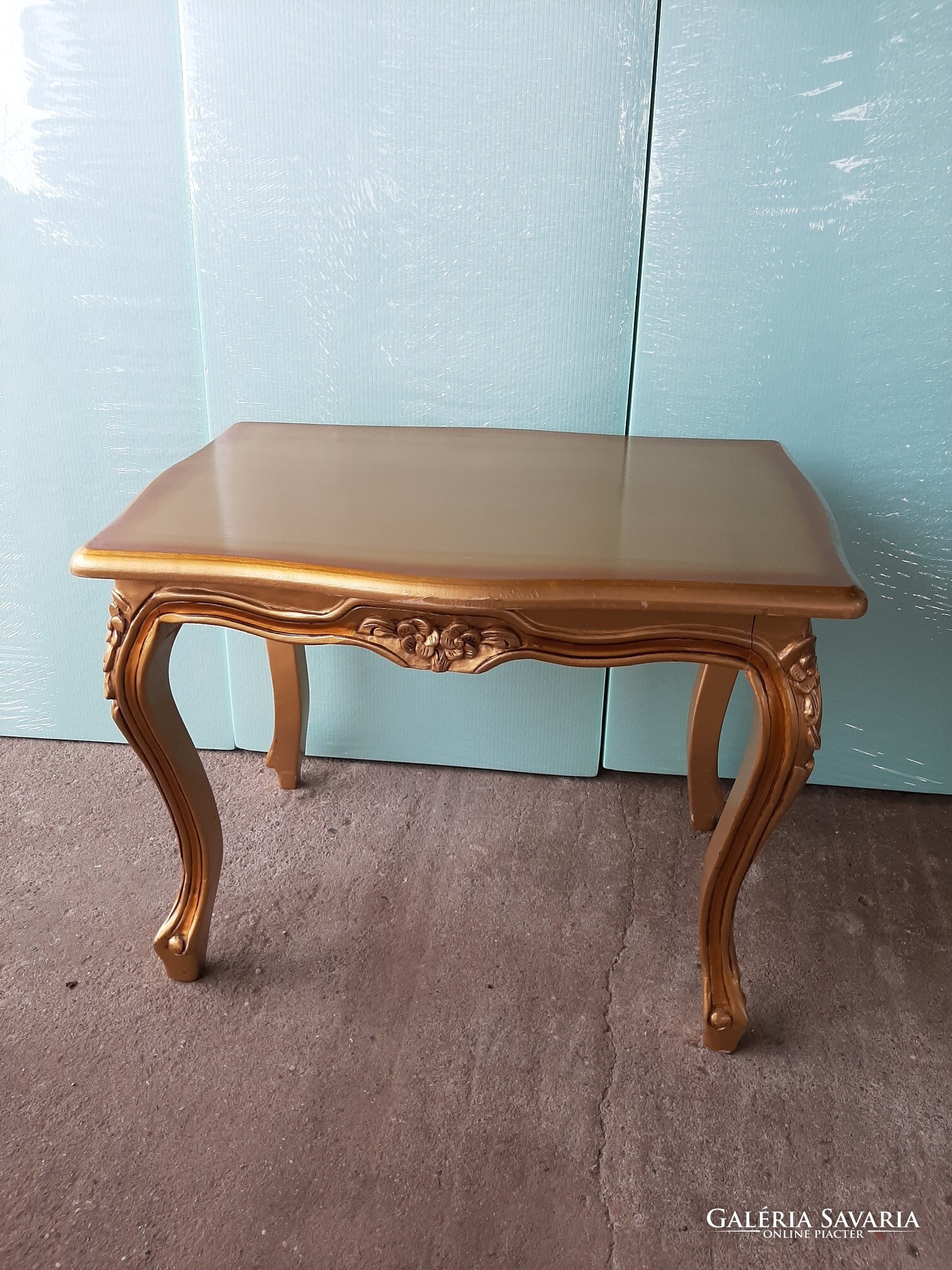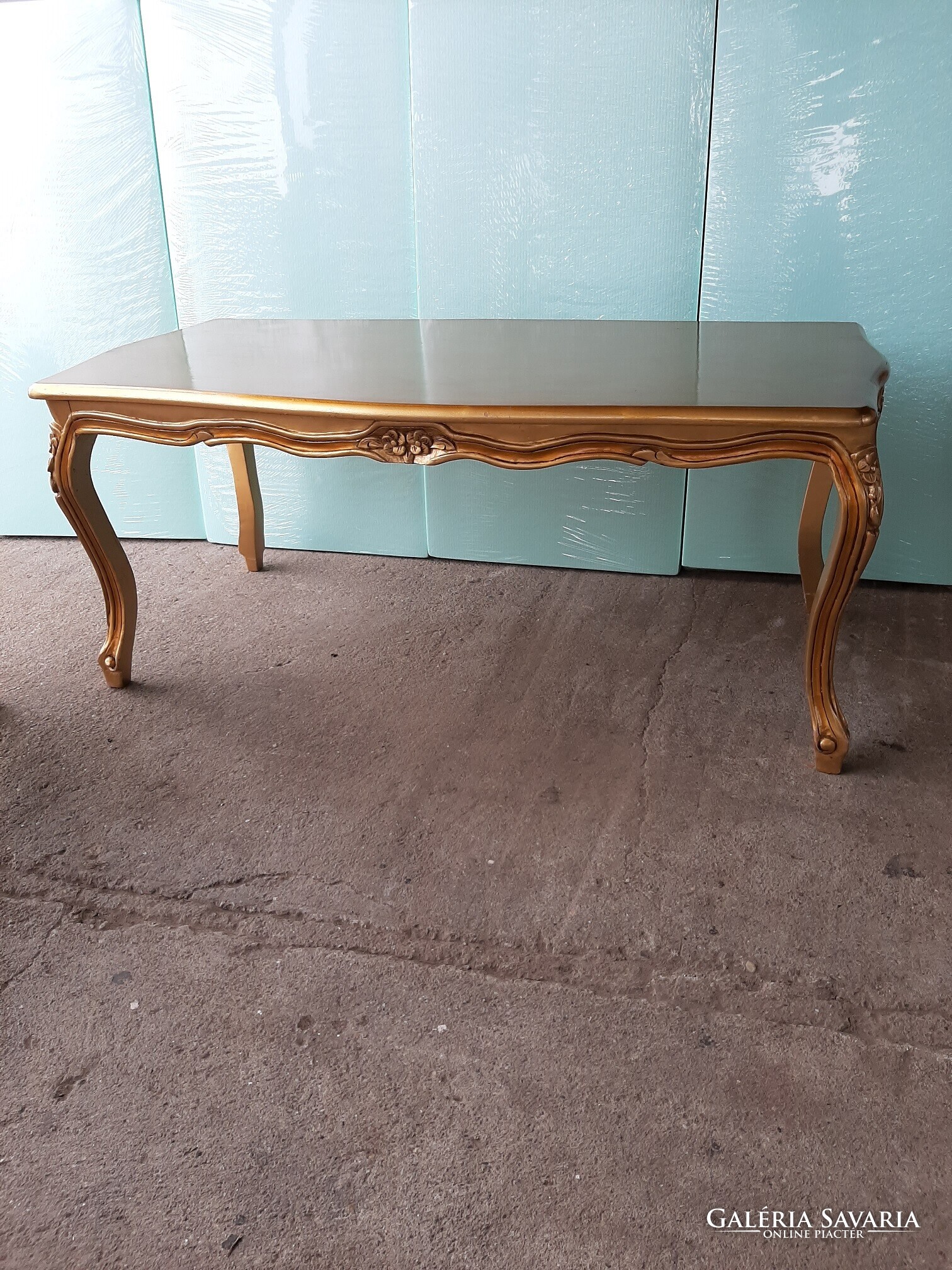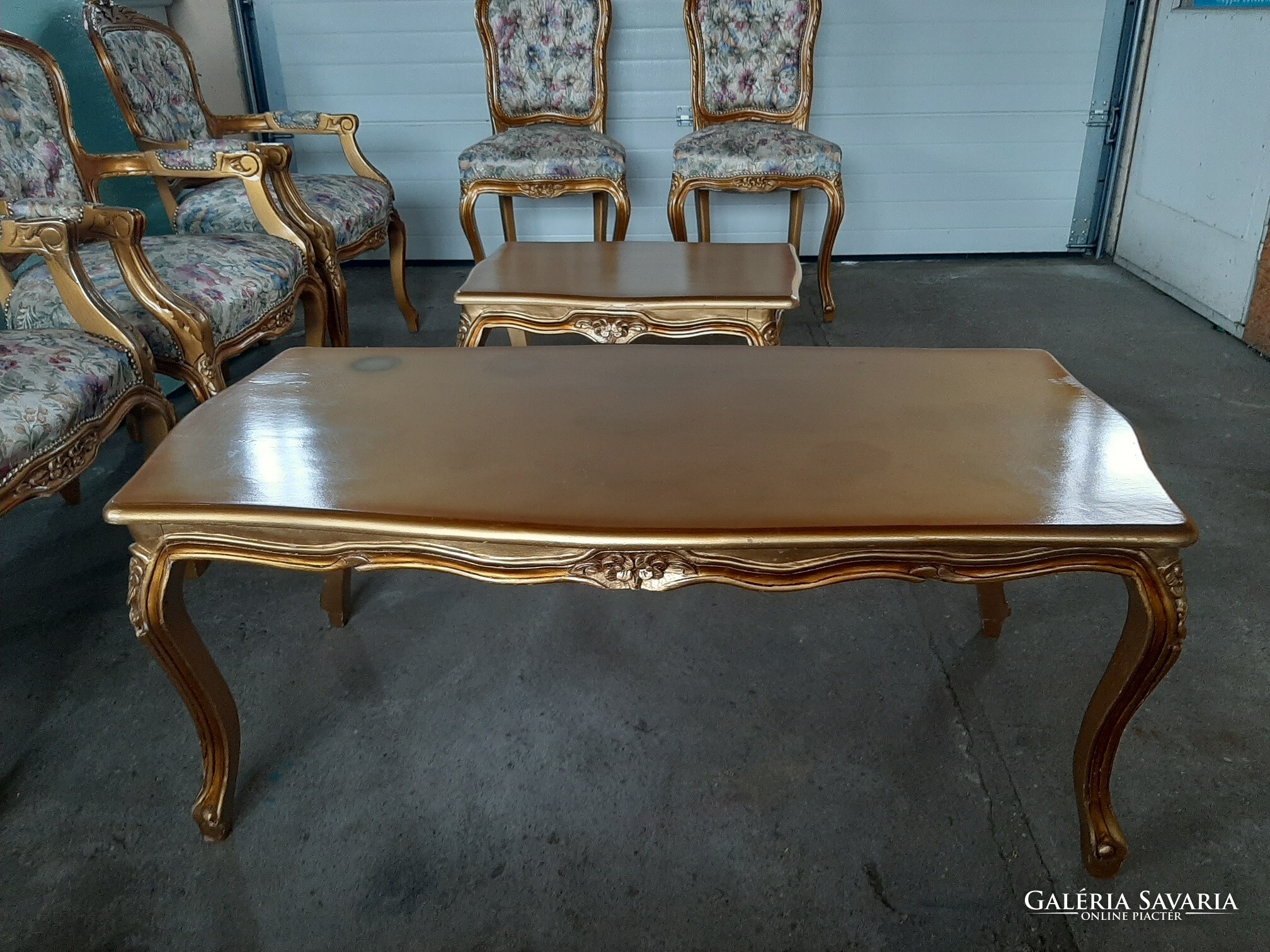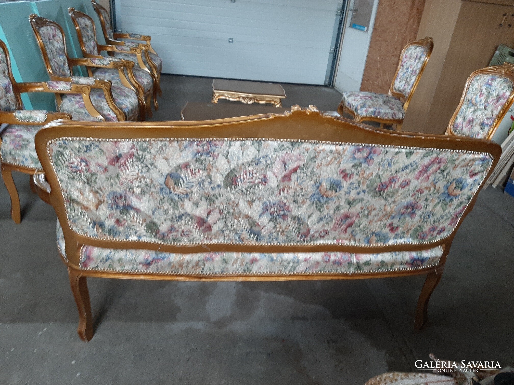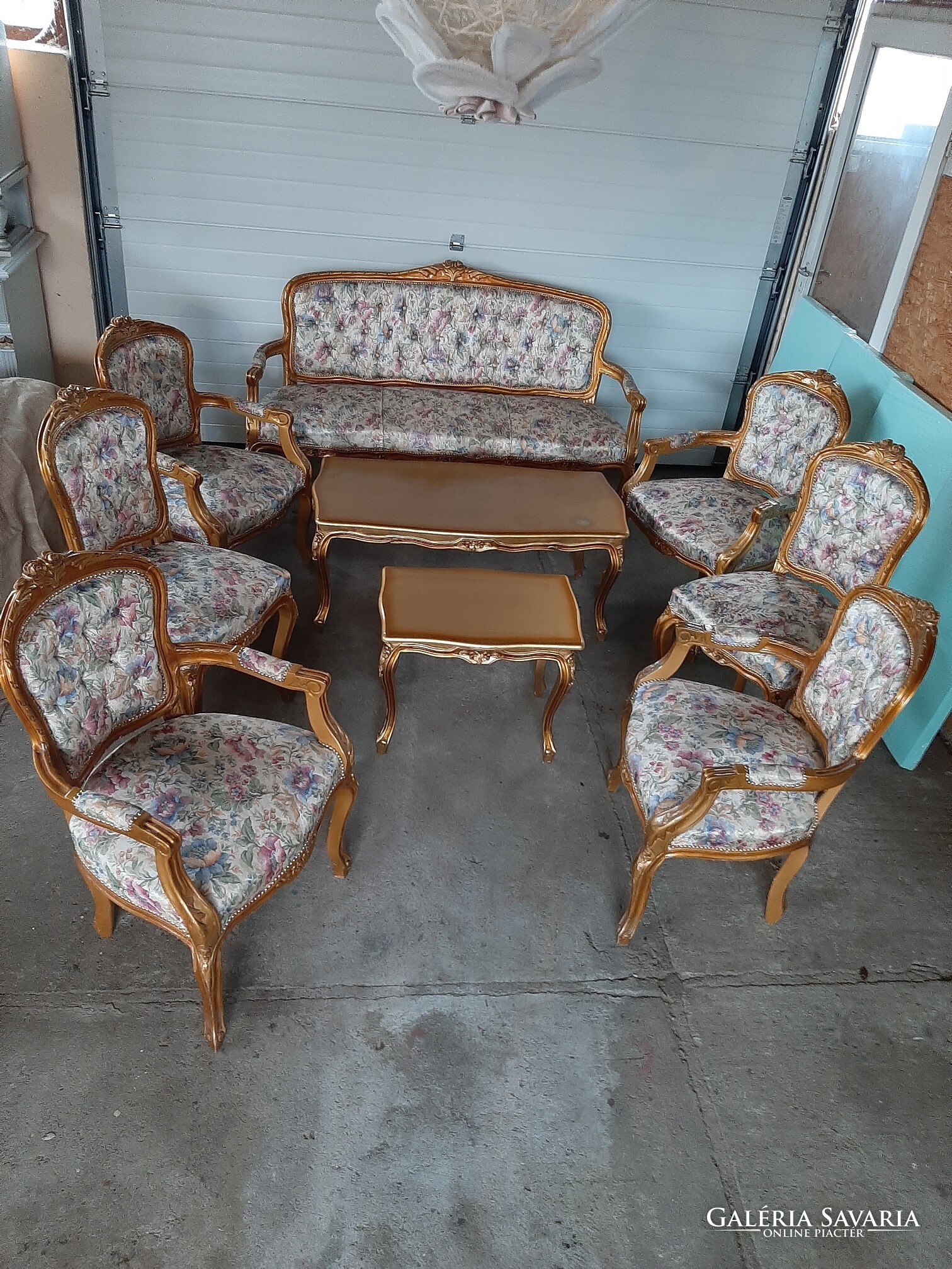 A neobarokk stílusban készült szalon ülőgarnitúra faragott díszítéssel a XX. század első felében készült. Az ülőgarnitúra 9 darabból áll:1 db kanapé 165 cm hosszú, 4 db fotel 65cm széles, 2 db szék 53 cm széles, 1 db asztal, lapmérete 105x50 cm, 1db kisebb asztal, lapmérete 60x40 cm. Valamennyi, kitűnő állapotú, hibátlan kárpitozású.Faragott faszerkezete arany színű. A szállításban segíteni tudok.