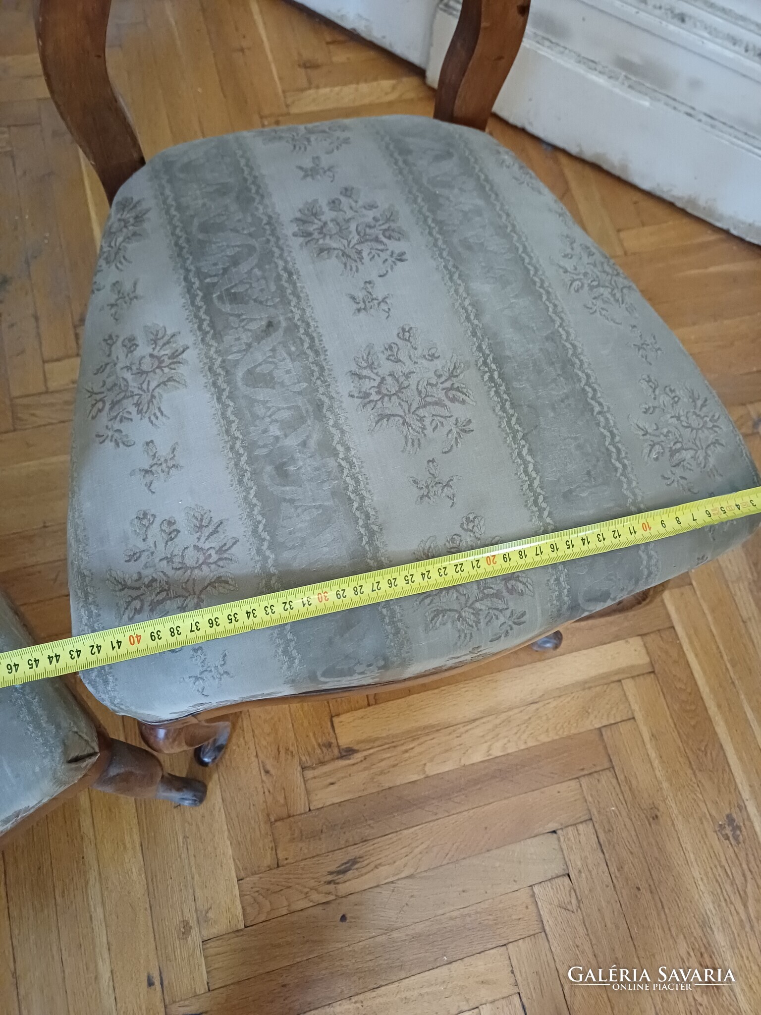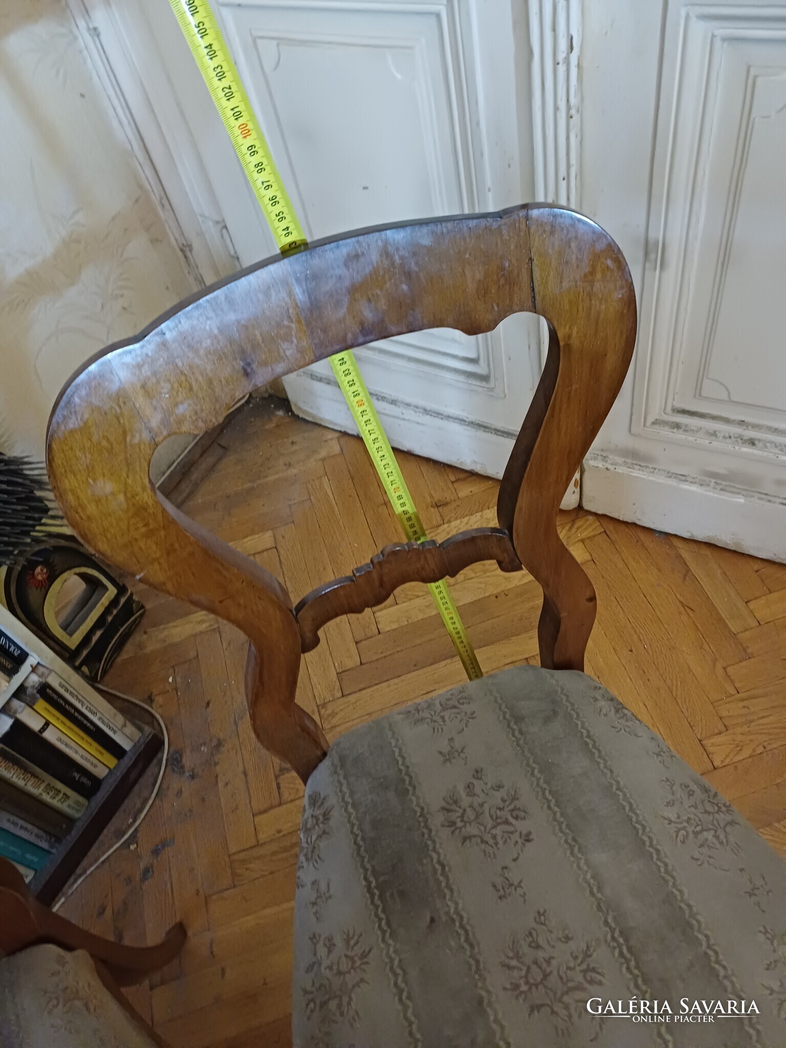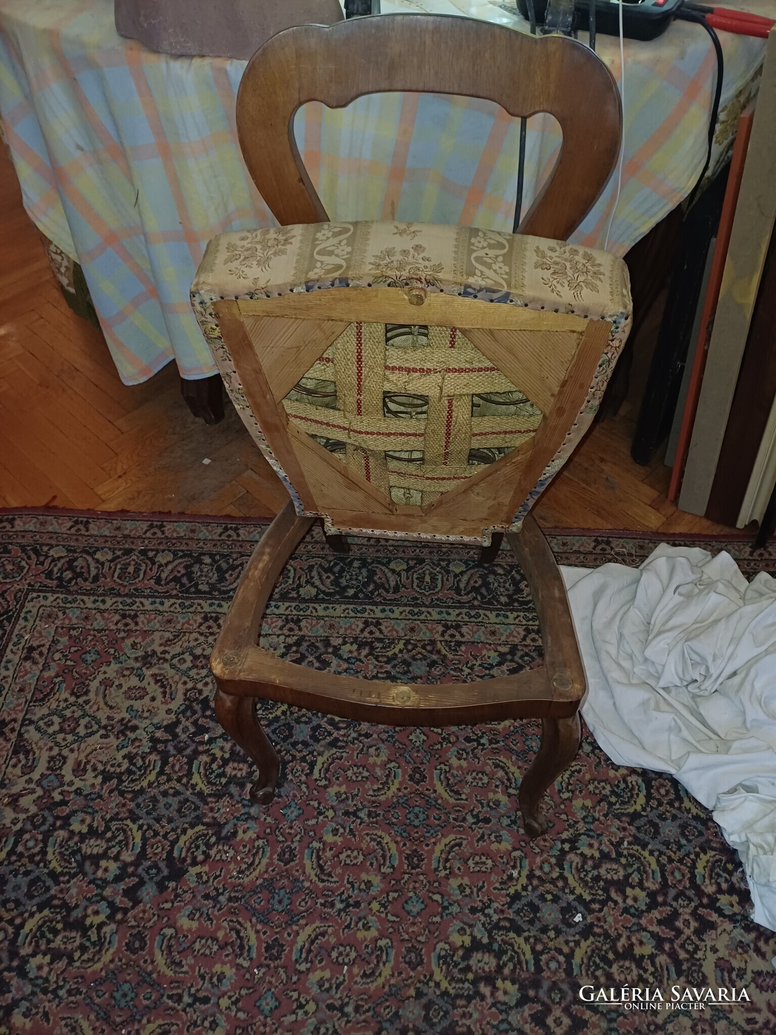 Állapot: szerkezetileg használható, de a felület több helyen kopott; a kárpit foltos/kopott, újrahúzás javasolt. Az egyik támlán hajszálrepedés/javításnyom látható (fotózva).