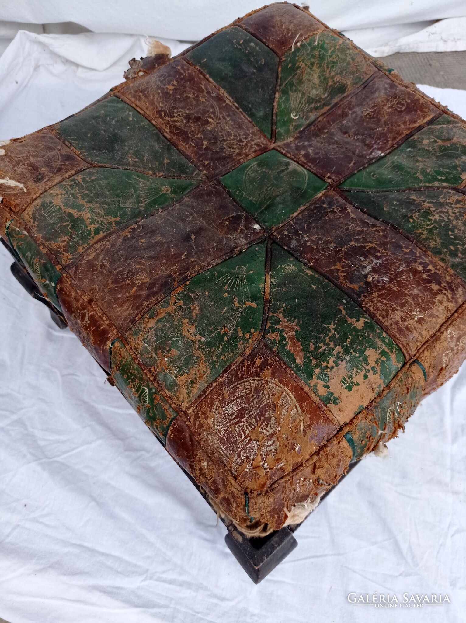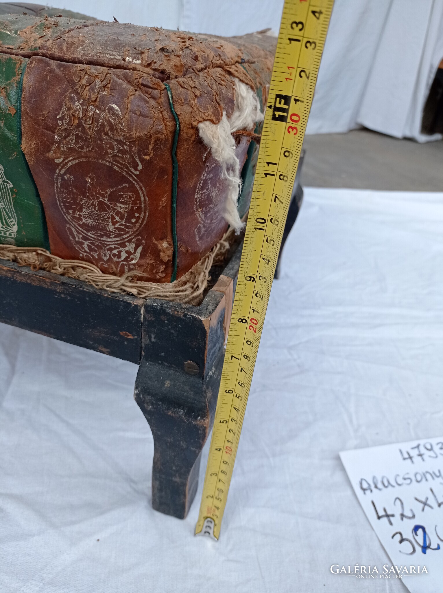 Valószínűleg régi lábtartó, melynek fa része, íves lábai jó állapotúak. A bőrrel borított felső rész igen viseltes. Abban sem vagyok biztos, hogy egybe tartozó darabok, de felújítás után karakteres, mutatós darab lehet.