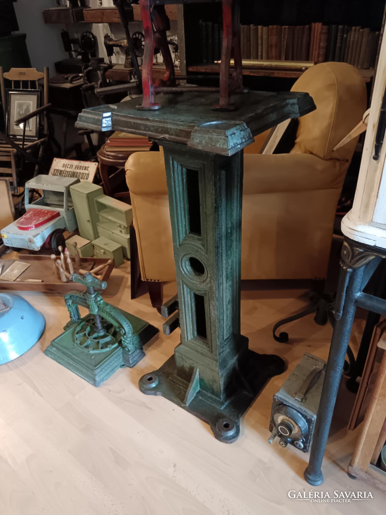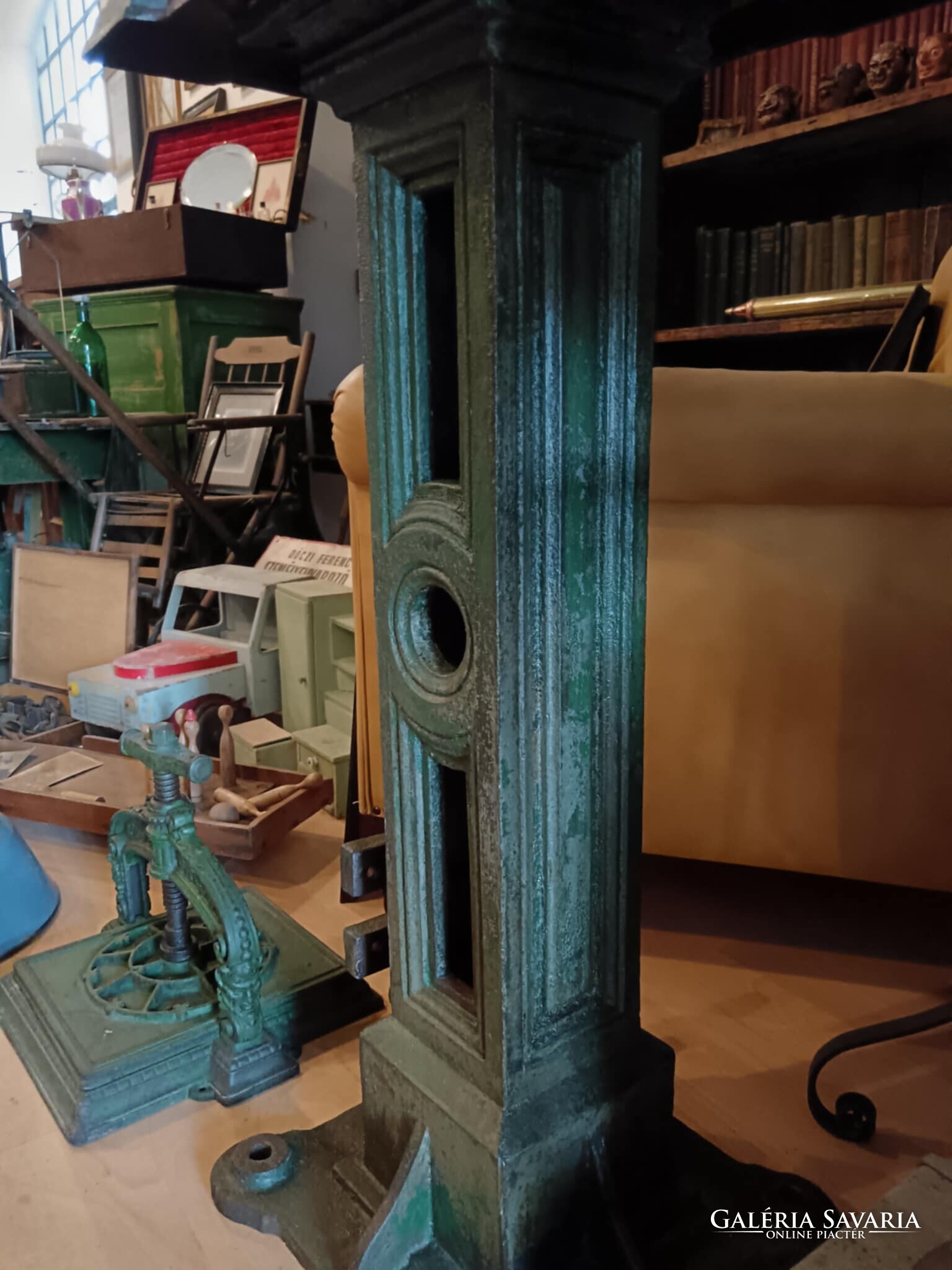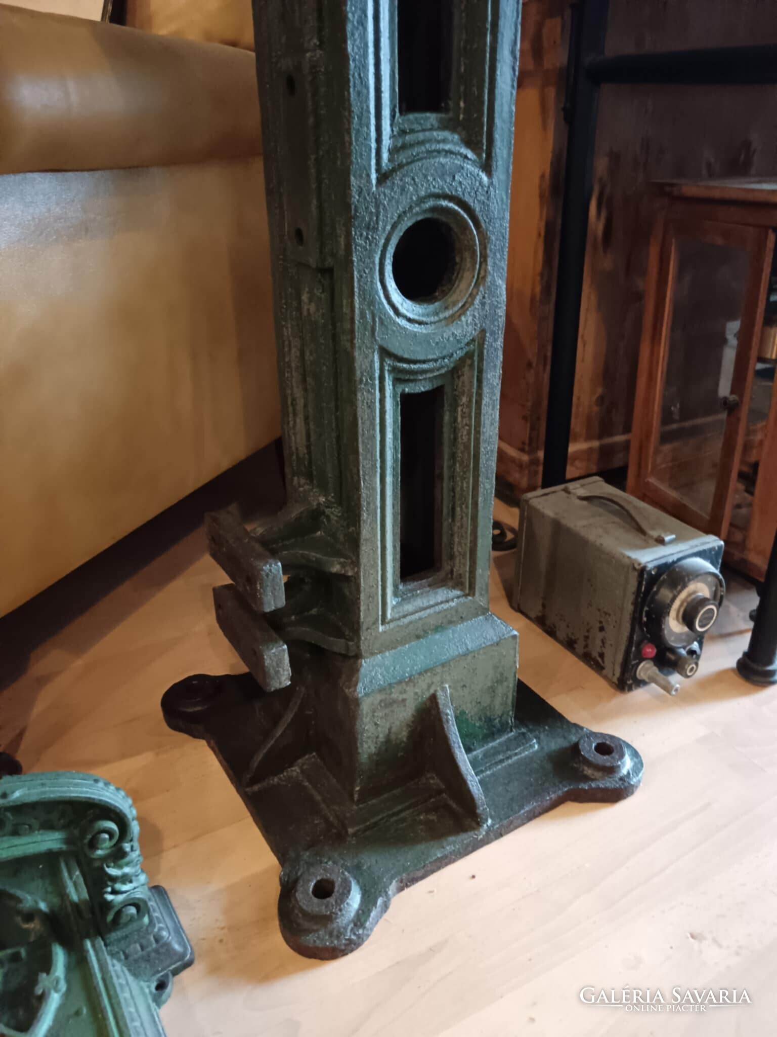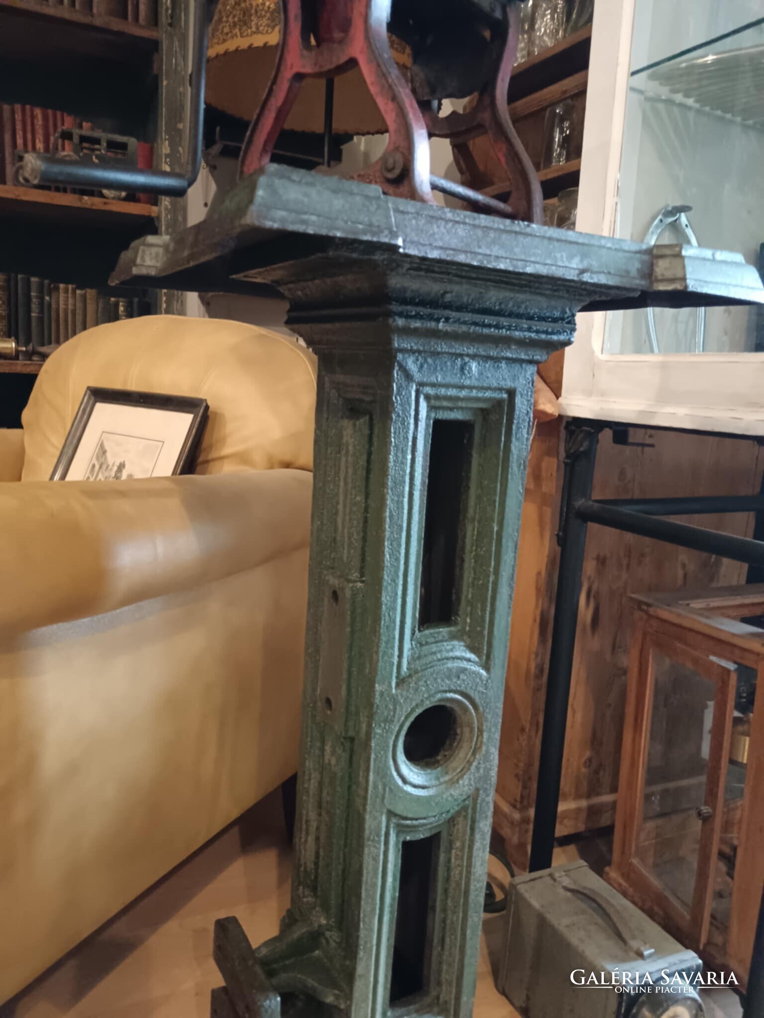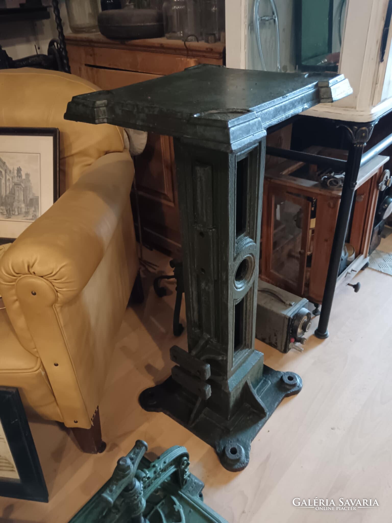Eladó ez a nagyon masszív, komoly súlyú ipari stílusú posztamens. Régi gép lába vagy egy kandeláber alsó része lehet, de újra gondolva egy posztamensként tudtam elképzelni, esetleg egy jó könyöklő is lehet belőle... A szín eredeti szép patinás zöld, kezeltem és lakkoztam. Jelenleg egy öntöttvas kályha alsó védő lemeze van rajta, mert véleményem szerint színben és formában is illik hozzá, de ezen lehet változtatni. Nincs hozzá erősítve. Ára: 179.990.-
