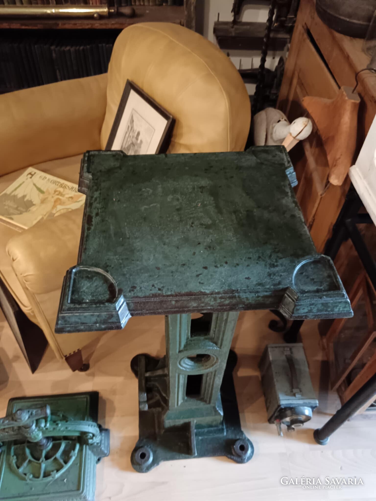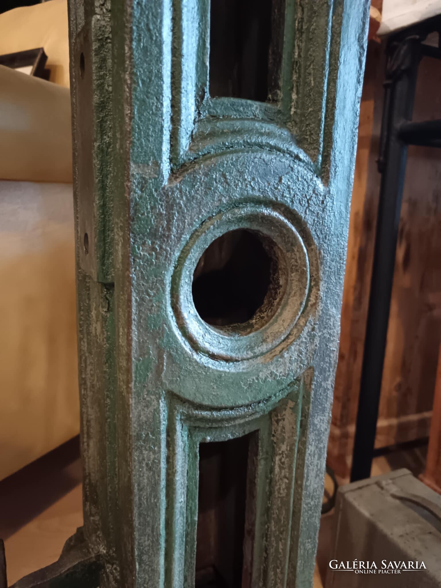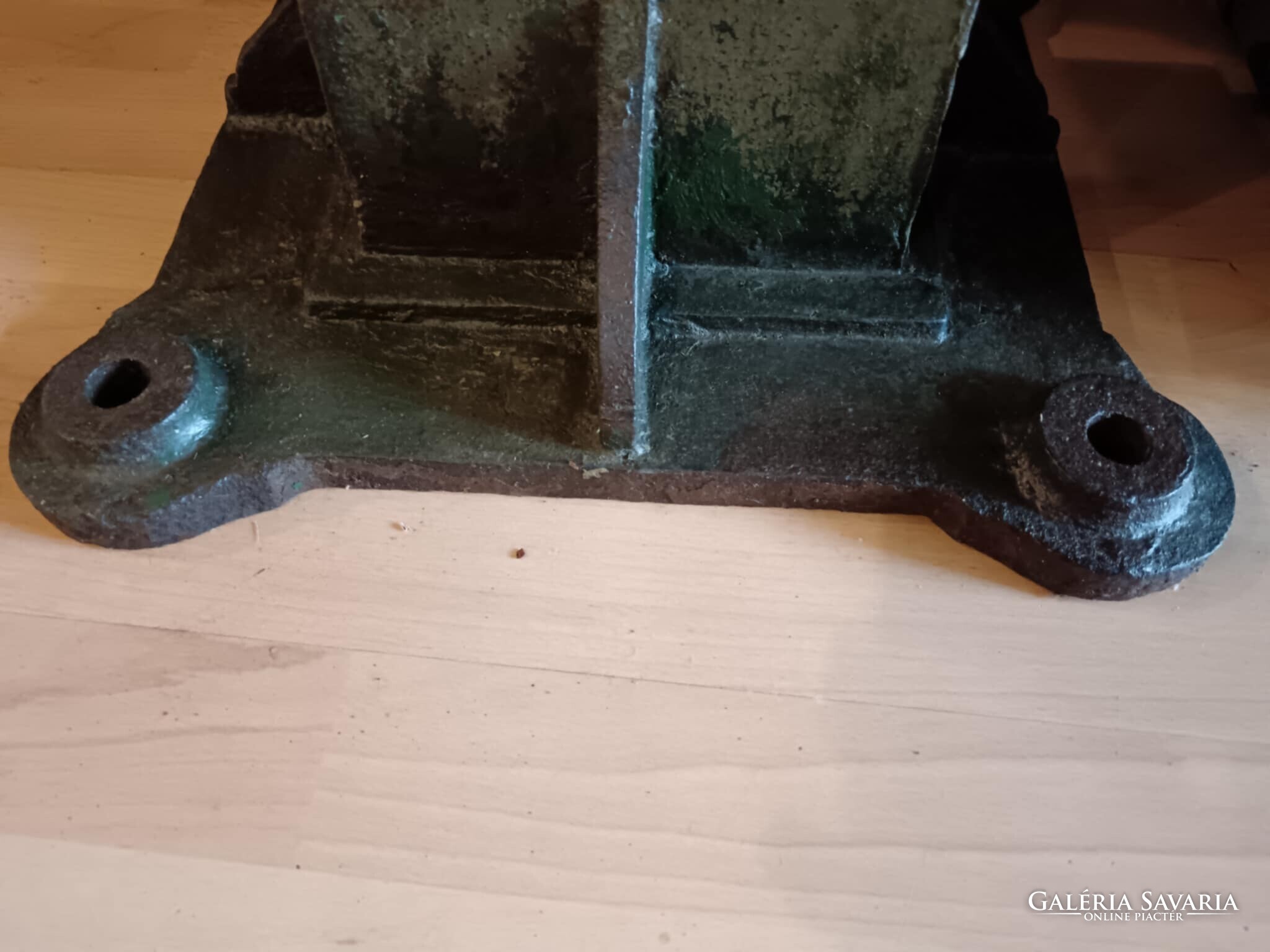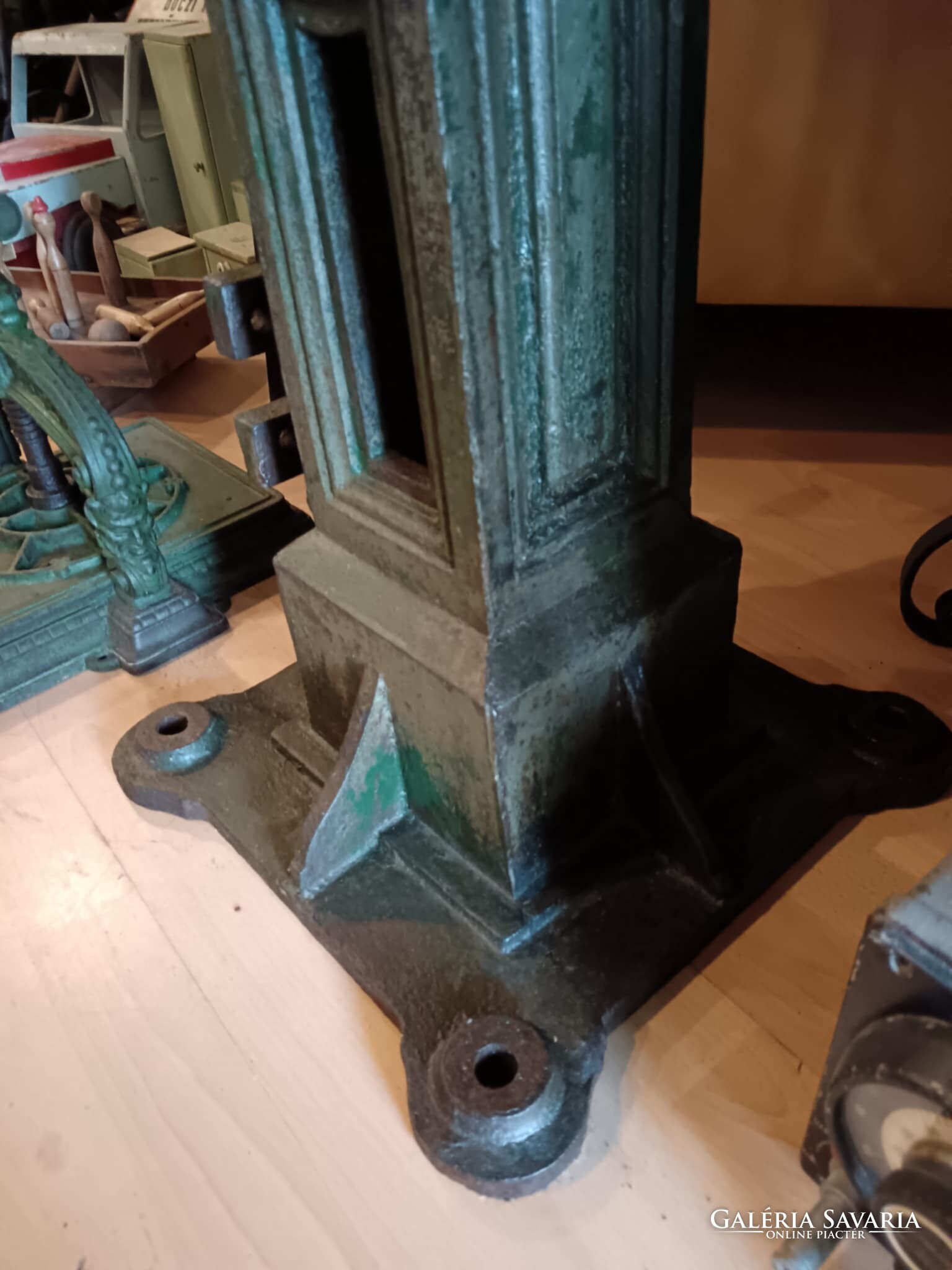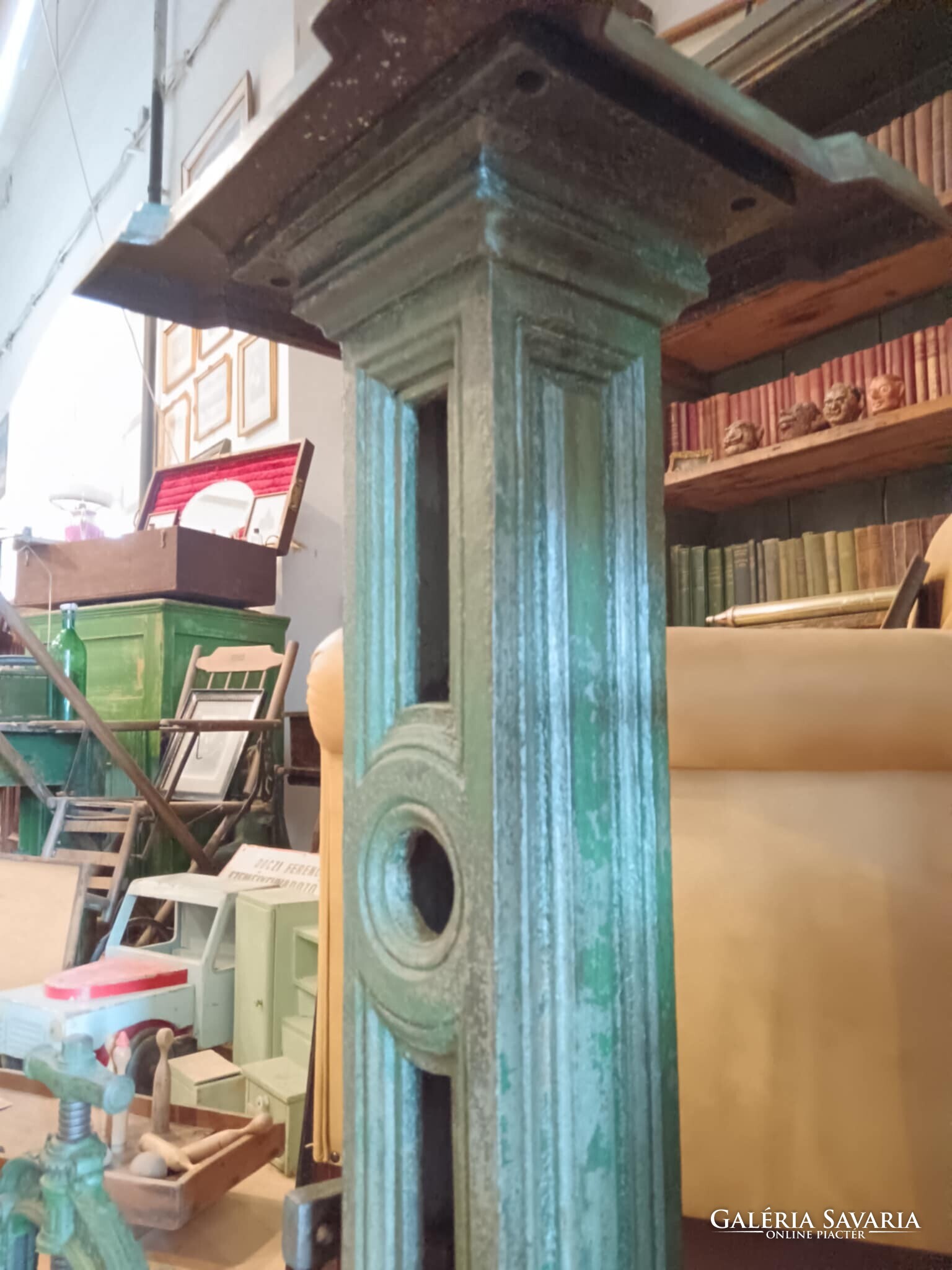 Eladó ez a nagyon masszív, komoly súlyú ipari stílusú posztamens. Régi gép lába vagy egy kandeláber alsó része lehet, de újra gondolva egy posztamensként tudtam elképzelni, esetleg egy jó könyöklő is lehet belőle... A szín eredeti szép patinás zöld, kezeltem és lakkoztam. Jelenleg egy öntöttvas kályha alsó védő lemeze van rajta, mert véleményem szerint színben és formában is illik hozzá, de ezen lehet változtatni. Nincs hozzá erősítve. Ára: 179.990.-