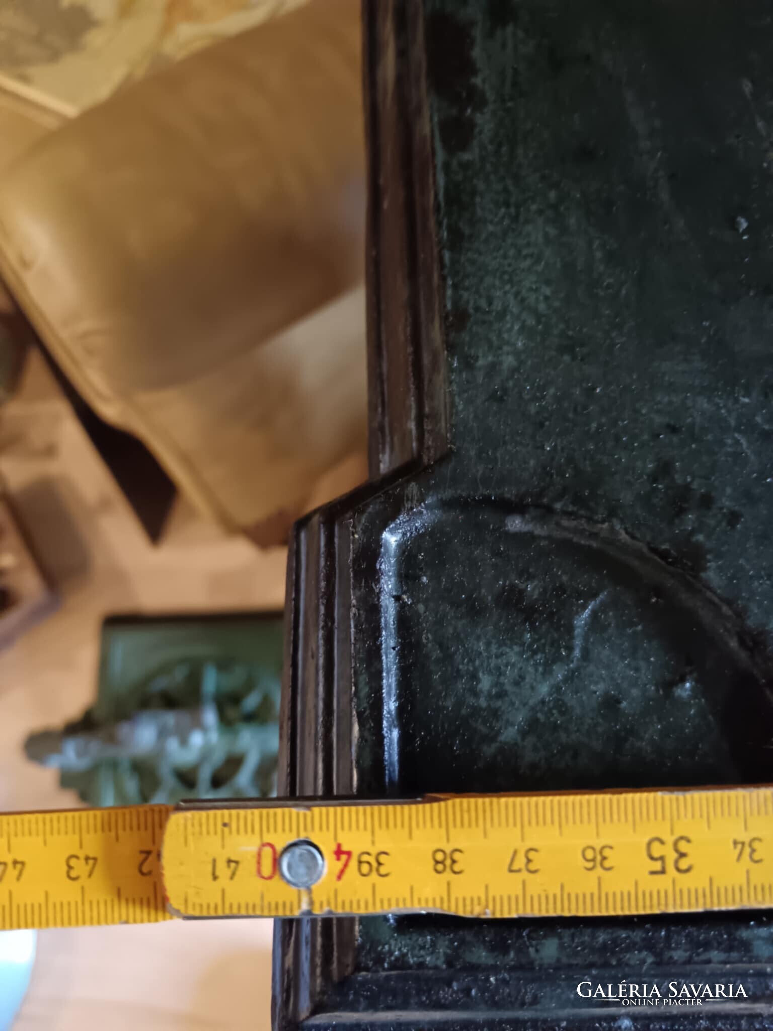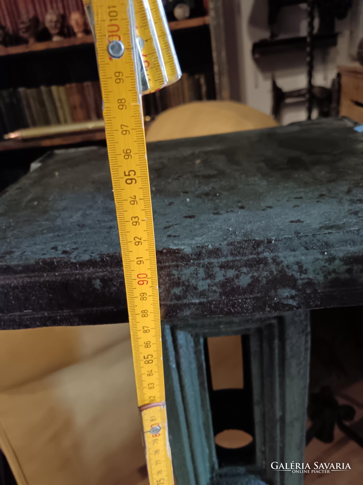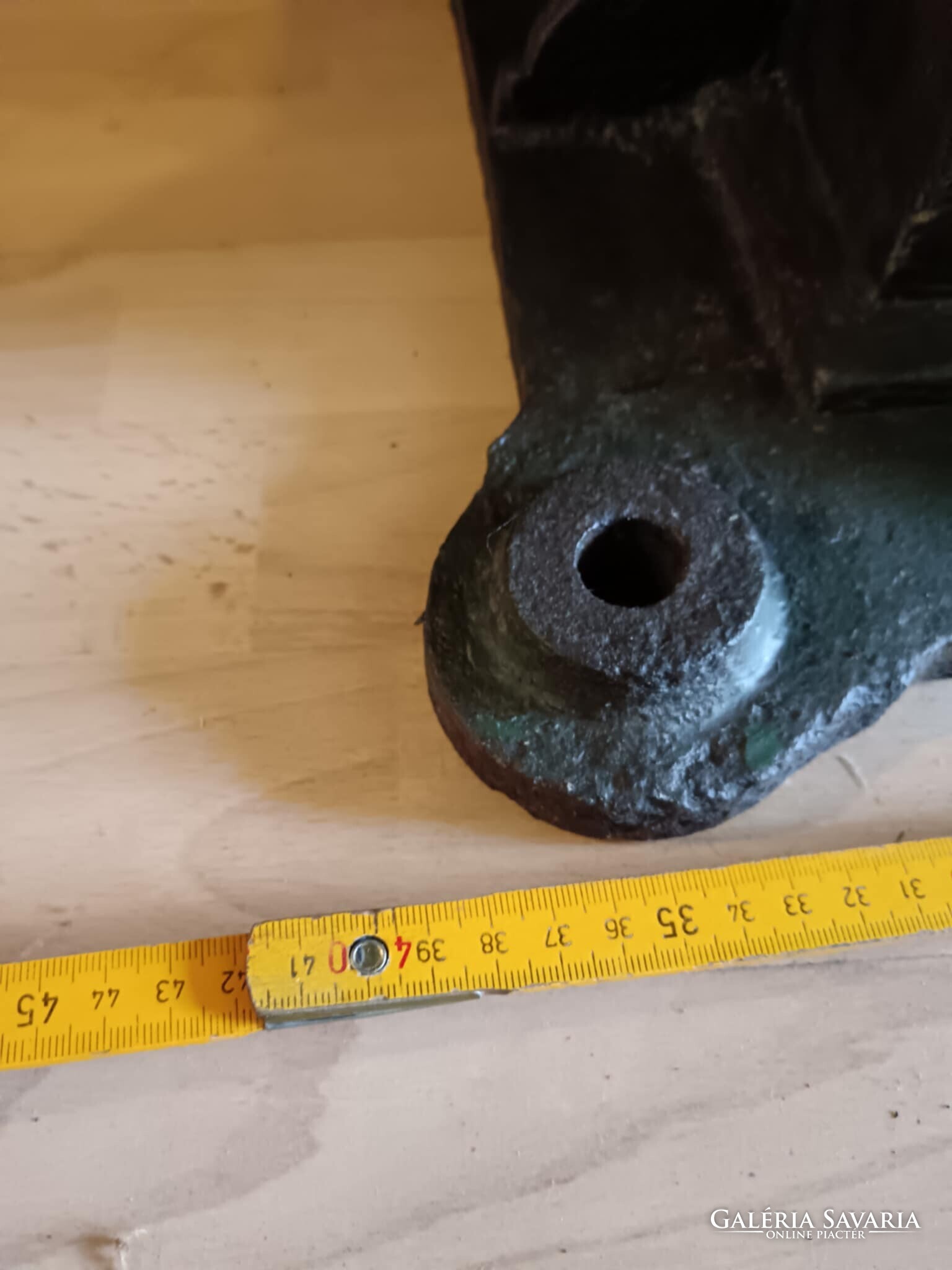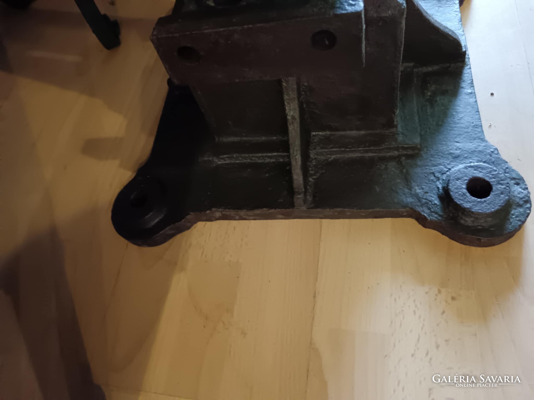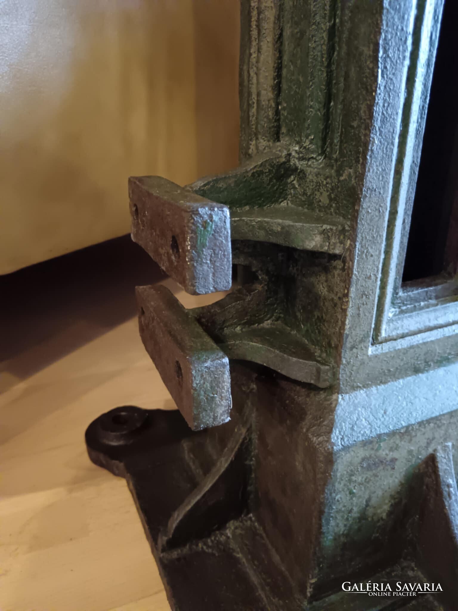 Eladó ez a nagyon masszív, komoly súlyú ipari stílusú posztamens. Régi gép lába vagy egy kandeláber alsó része lehet, de újra gondolva egy posztamensként tudtam elképzelni, esetleg egy jó könyöklő is lehet belőle... A szín eredeti szép patinás zöld, kezeltem és lakkoztam. Jelenleg egy öntöttvas kályha alsó védő lemeze van rajta, mert véleményem szerint színben és formában is illik hozzá, de ezen lehet változtatni. Nincs hozzá erősítve. Ára: 179.990.-