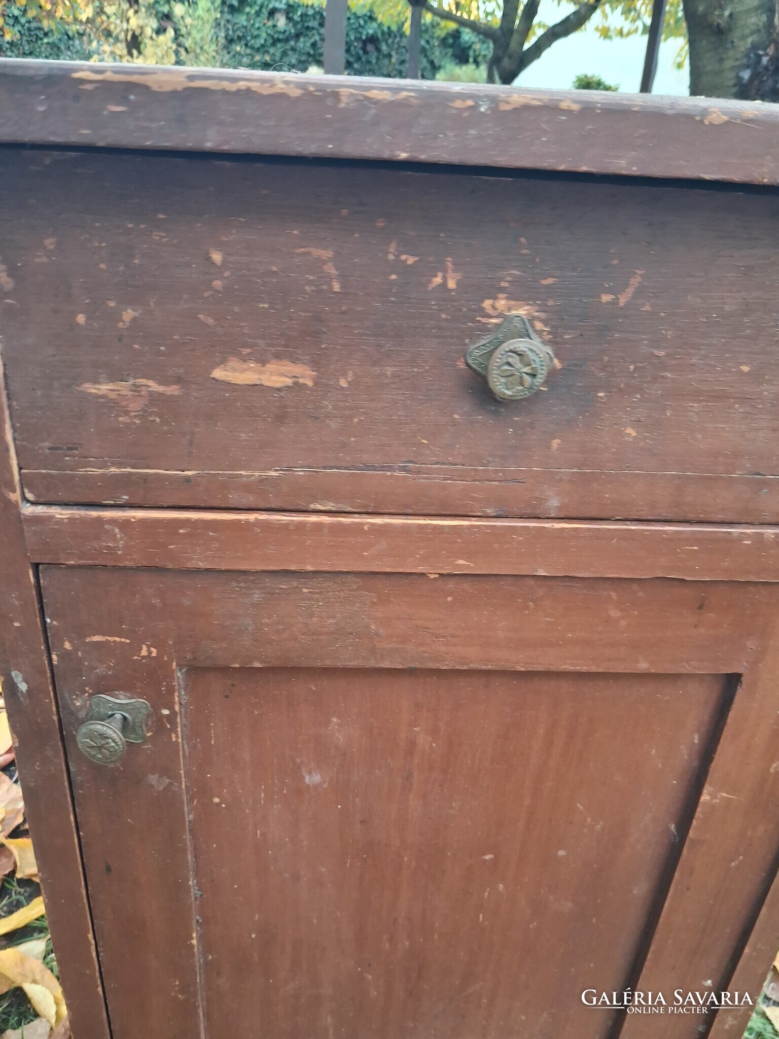 Fenyőből készült réz fogantyukkal, masszív állapotban van.