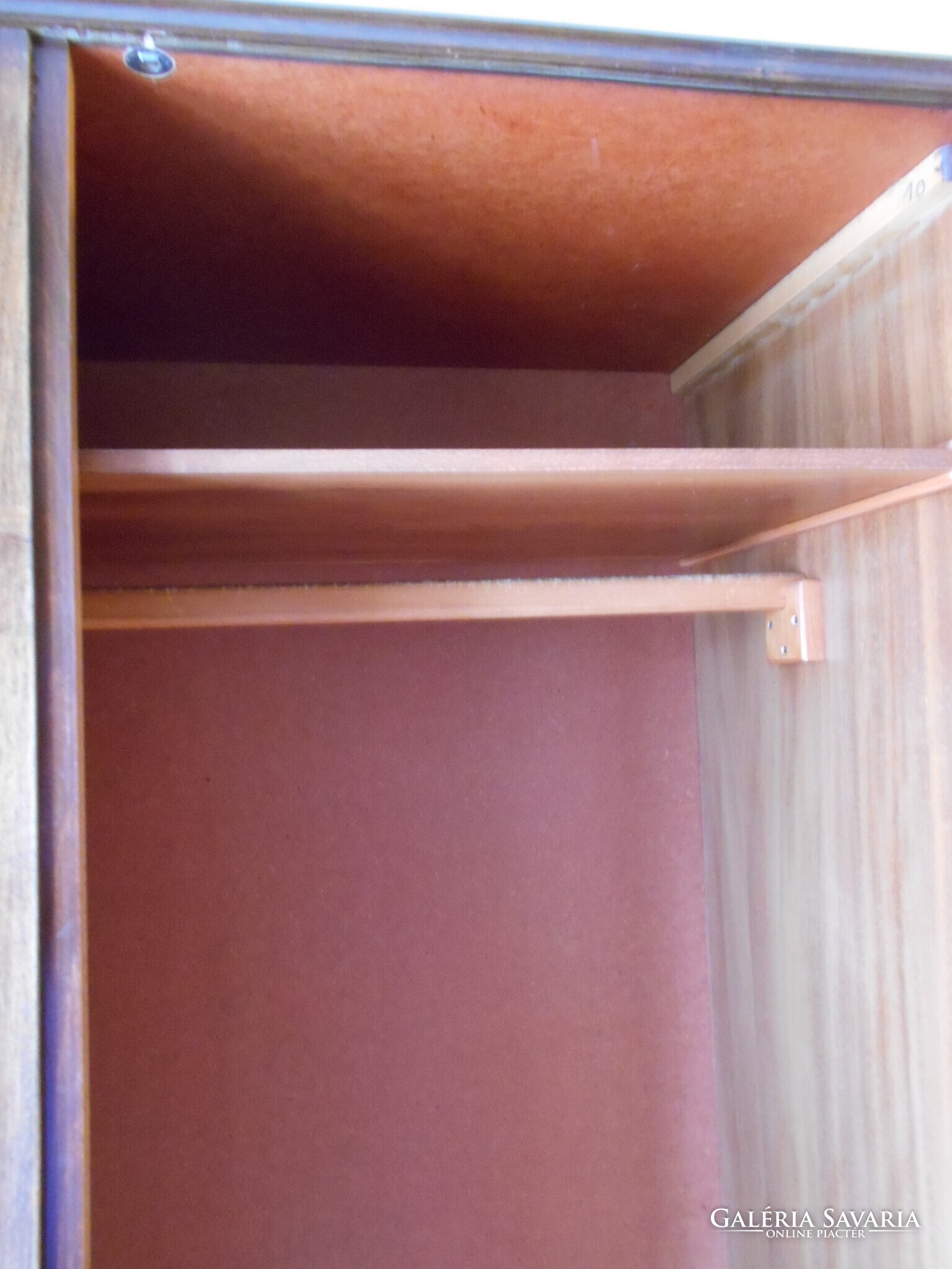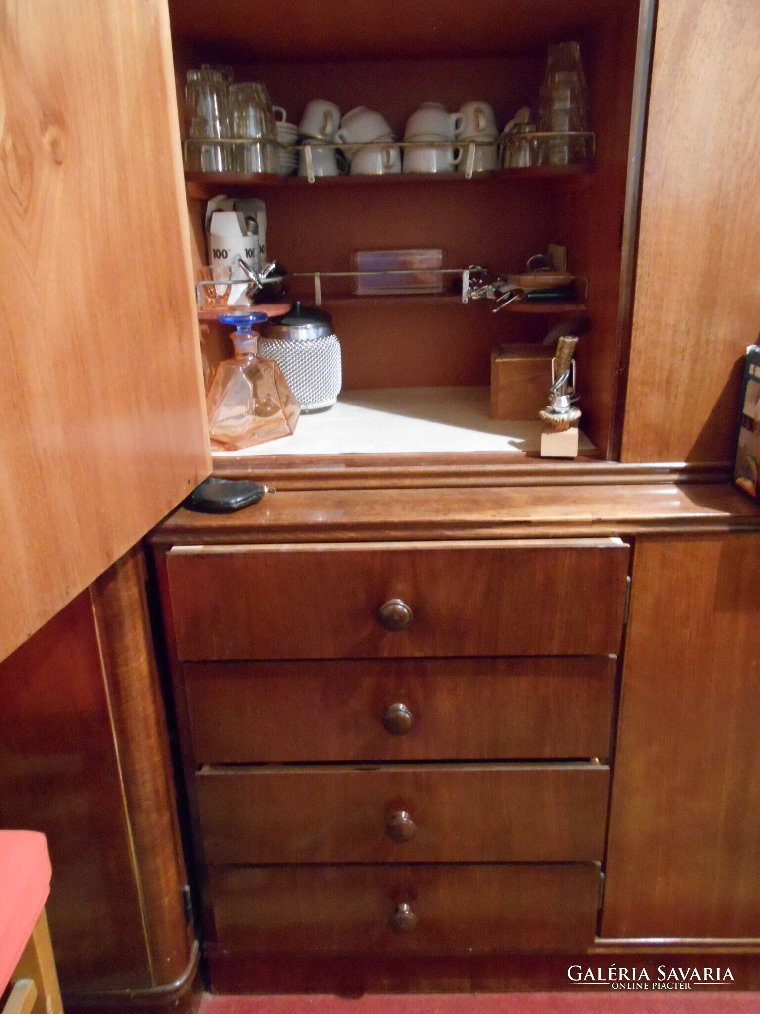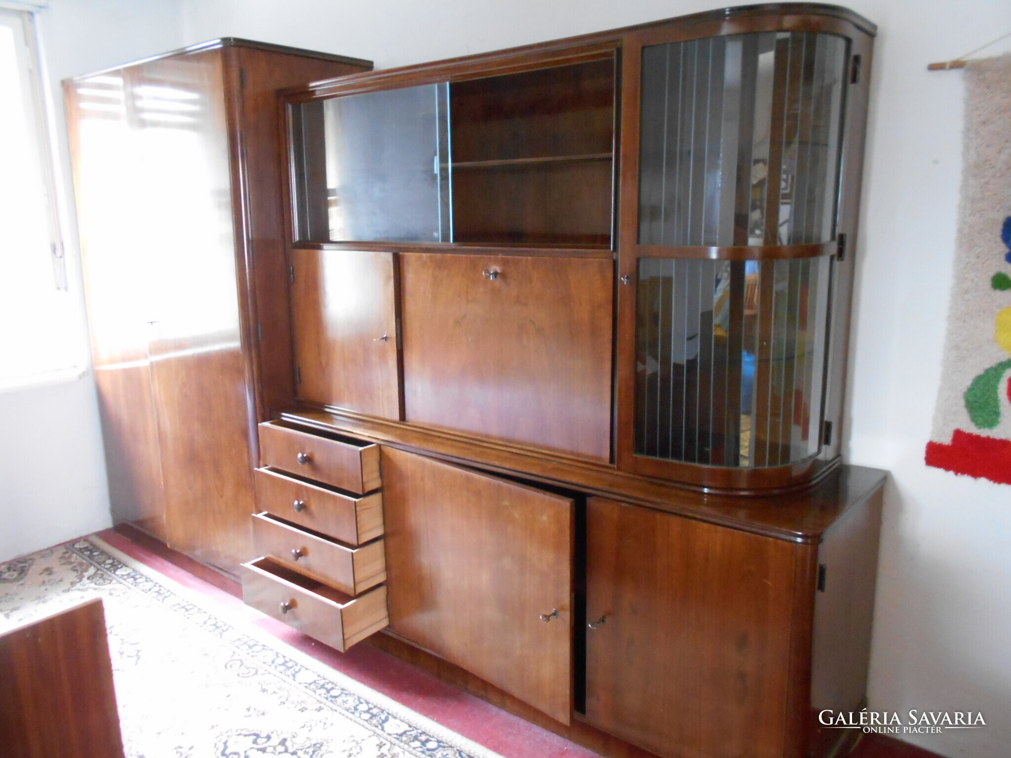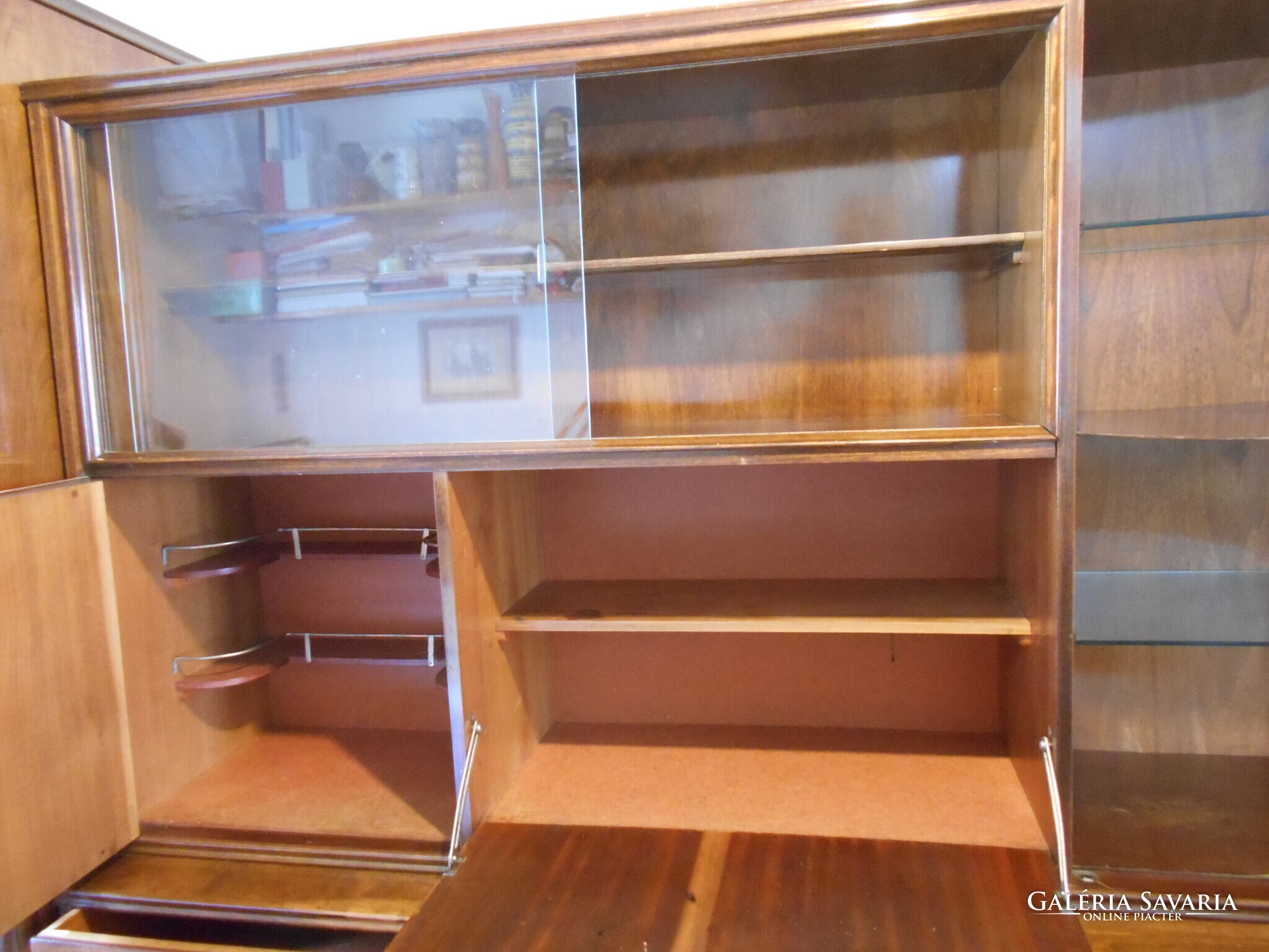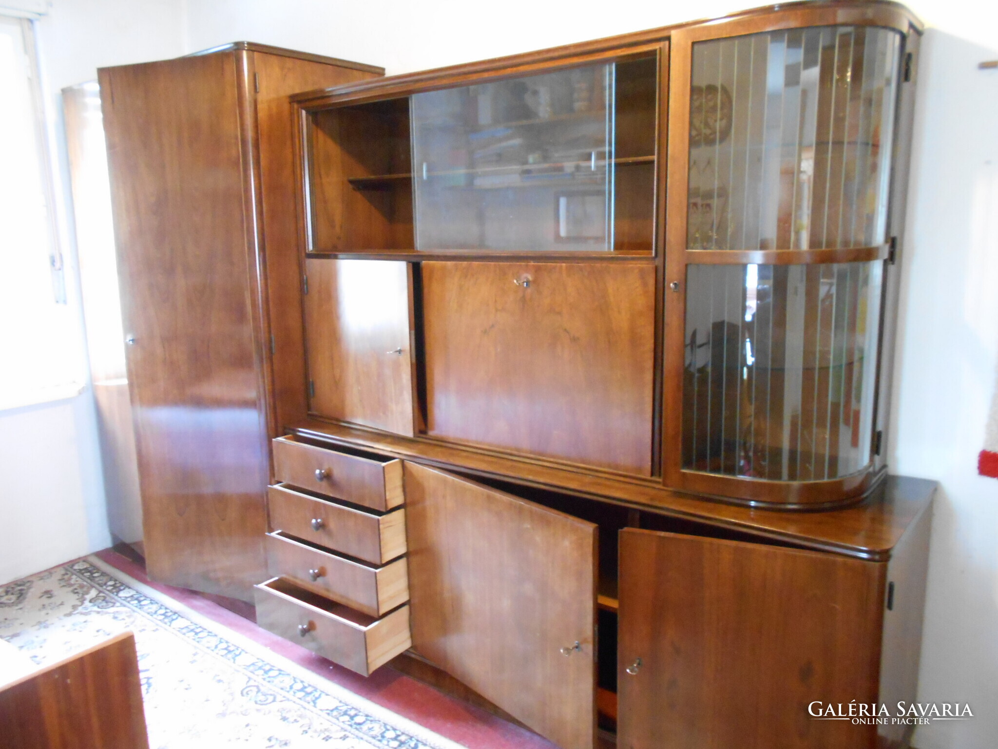 A szekrénysor használt, megkímélt, jó állapotban van. A vitrin alatt bal oldalt bárszekrény van, mellette lenyitható ajtóval polcos rész. Az alsó részben bal oldalt fiókok, mellette a két ajtó mögött polcos, rakodós helyek vannak.