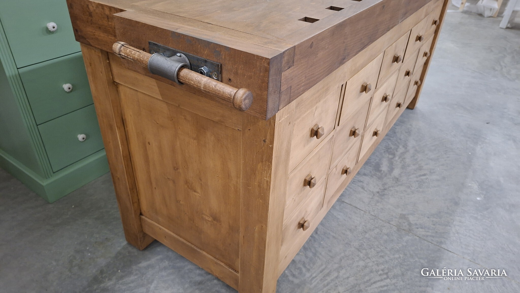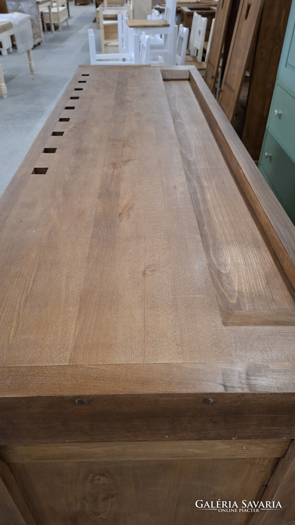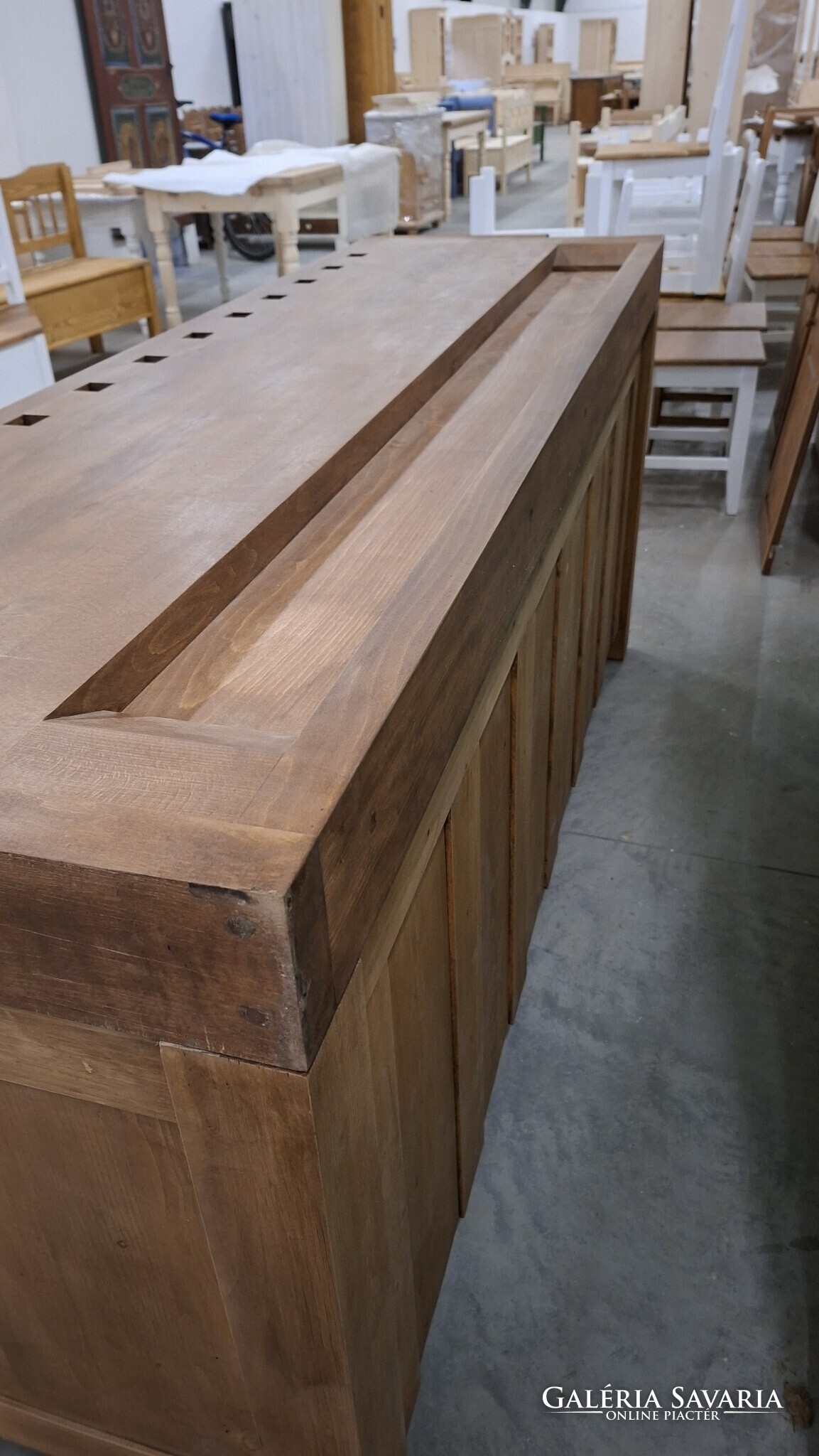 Újonnan készült sokfiókos, vaxolt komód bükkfa plattal.