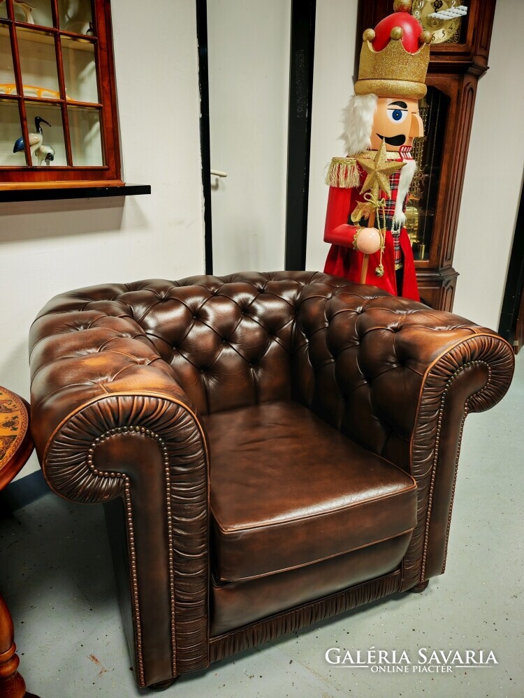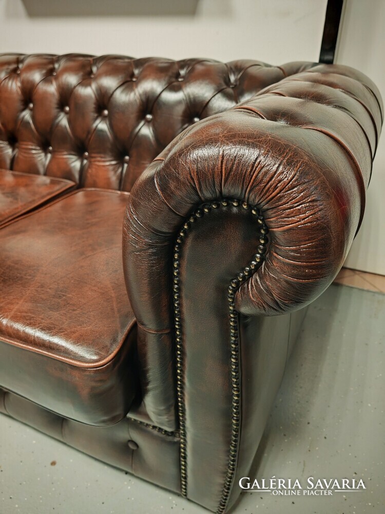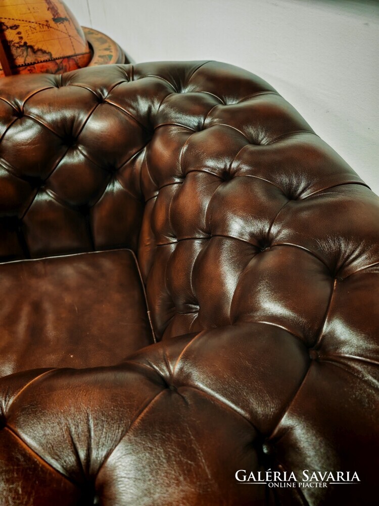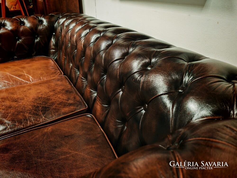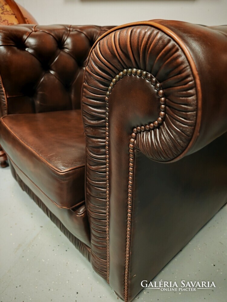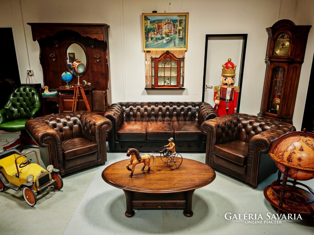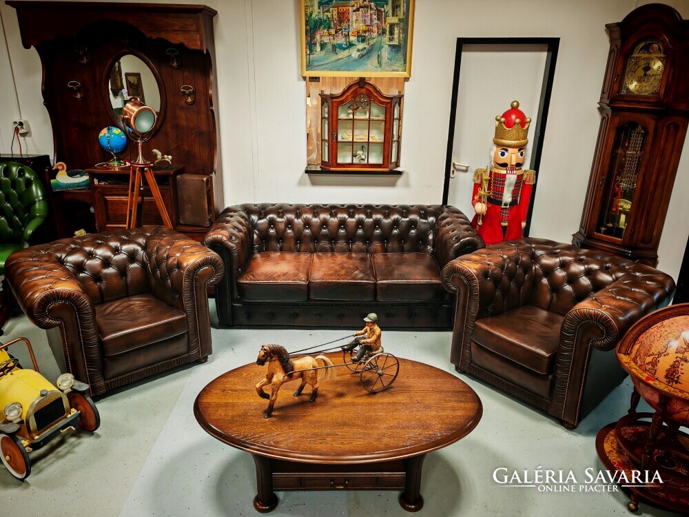 Klasszikus angol bőr ülőgarnitúra chesterfield kanapé + 2 db. fotel patinás szép állapotban