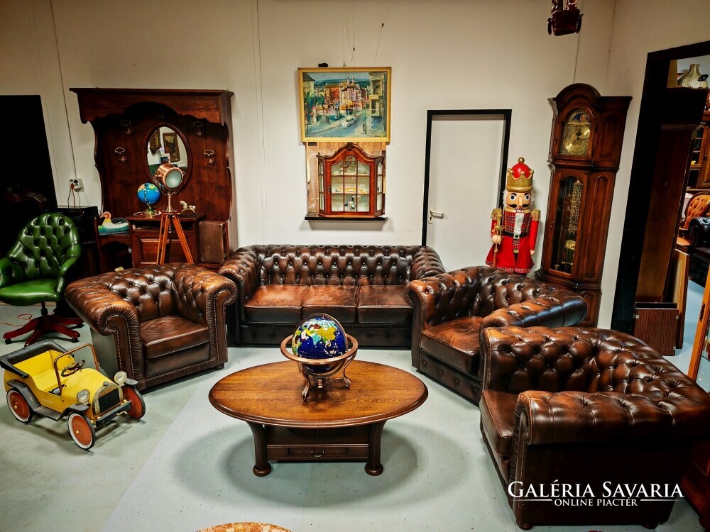 Klasszikus angol bőr ülőgarnitúra chesterfield kanapé + 3 db. fotel patinás szép állapotban
