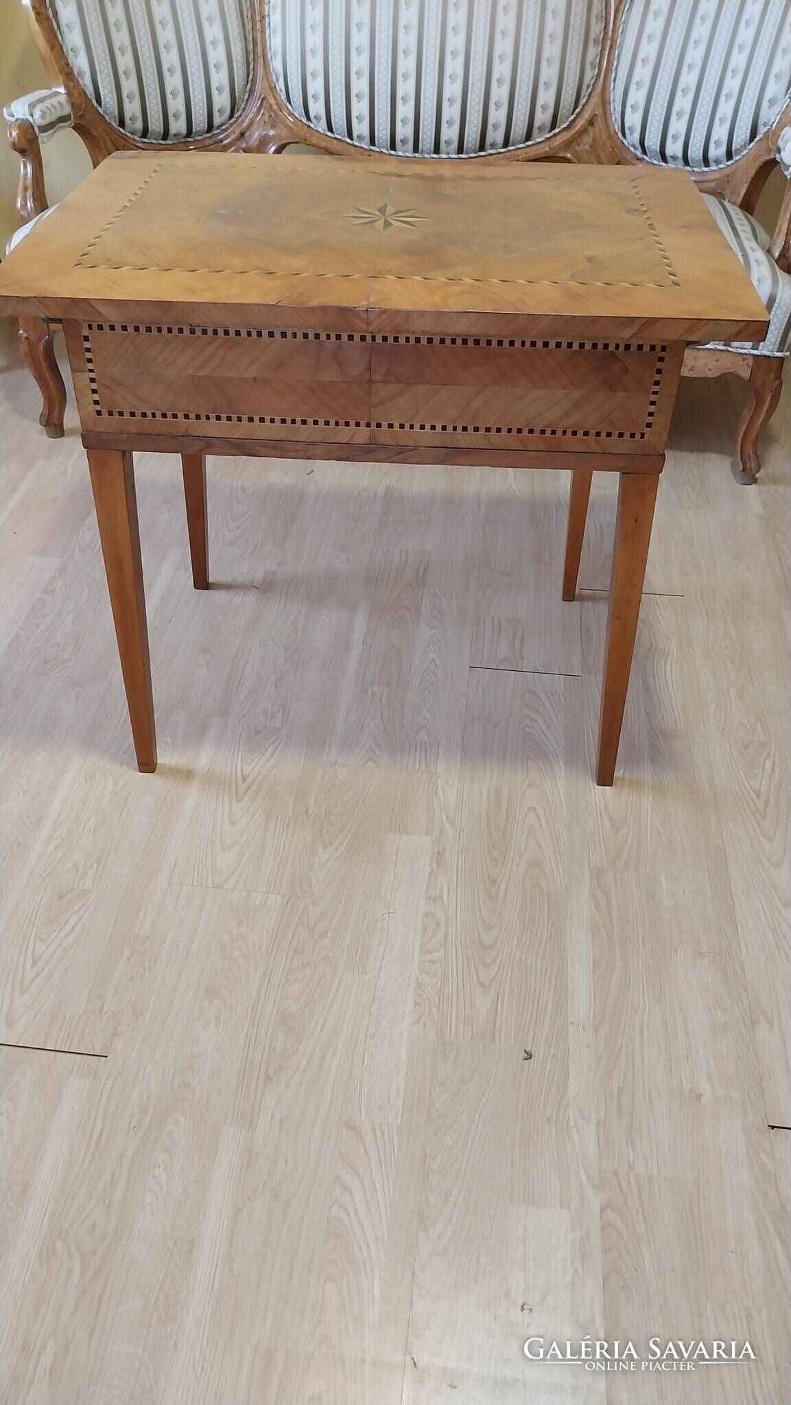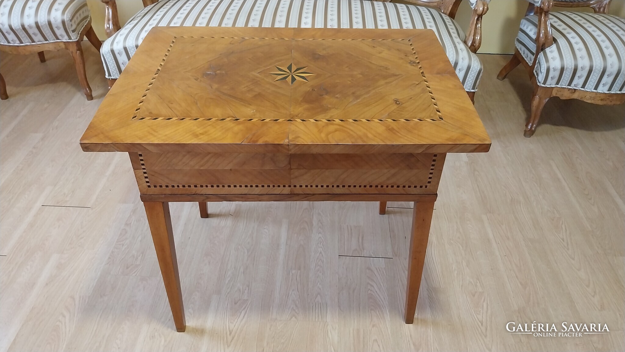 Neobarokk stílusban készült, nappali - ülőgarnitúra, intarzia díszítésű asztallal / az asztal inkább biedermeier stílusban készült, vélhetően eredetileg nem a garnitúra részét képezte.
