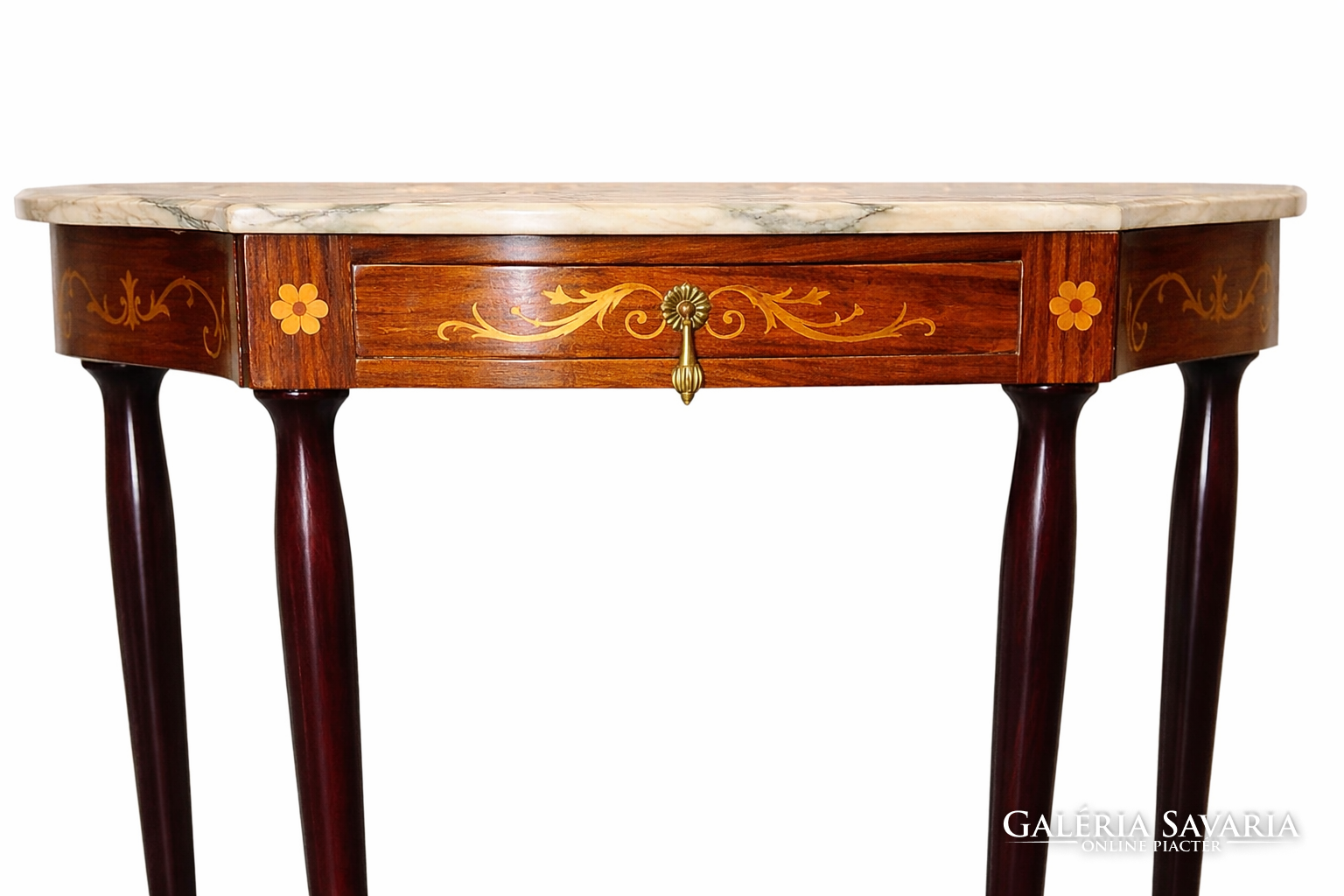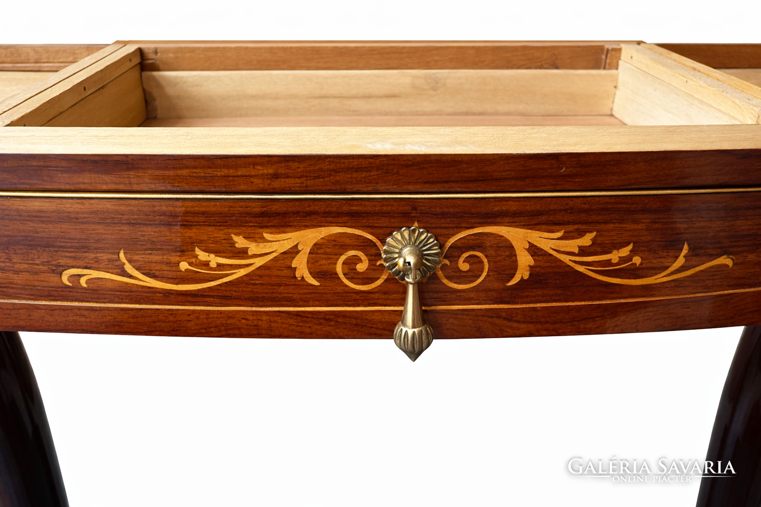 A meleg tónusú faanyag felületét aprólékosan kivitelezett intarziák díszítik: stilizált növényi motívumok és virágrozetták jelennek meg a fiók előlapján és az oldalsó frízeken. A középső fiókot patinás, bronz színű húzó hangsúlyozza, amely harmonikusan illeszkedik a klasszikus összképhez.