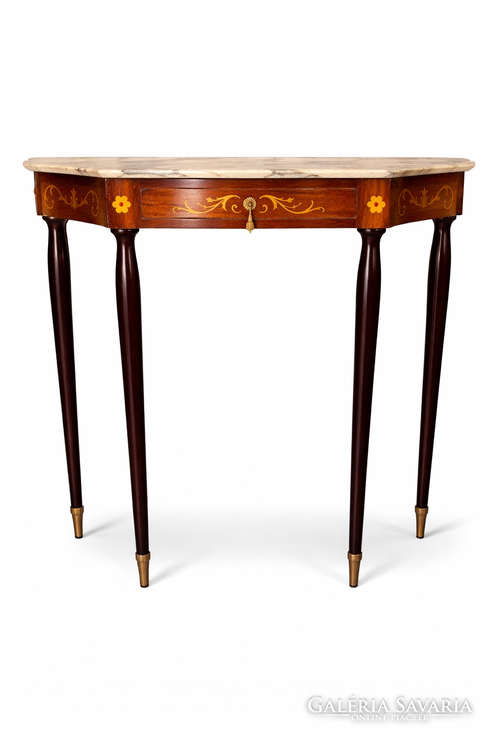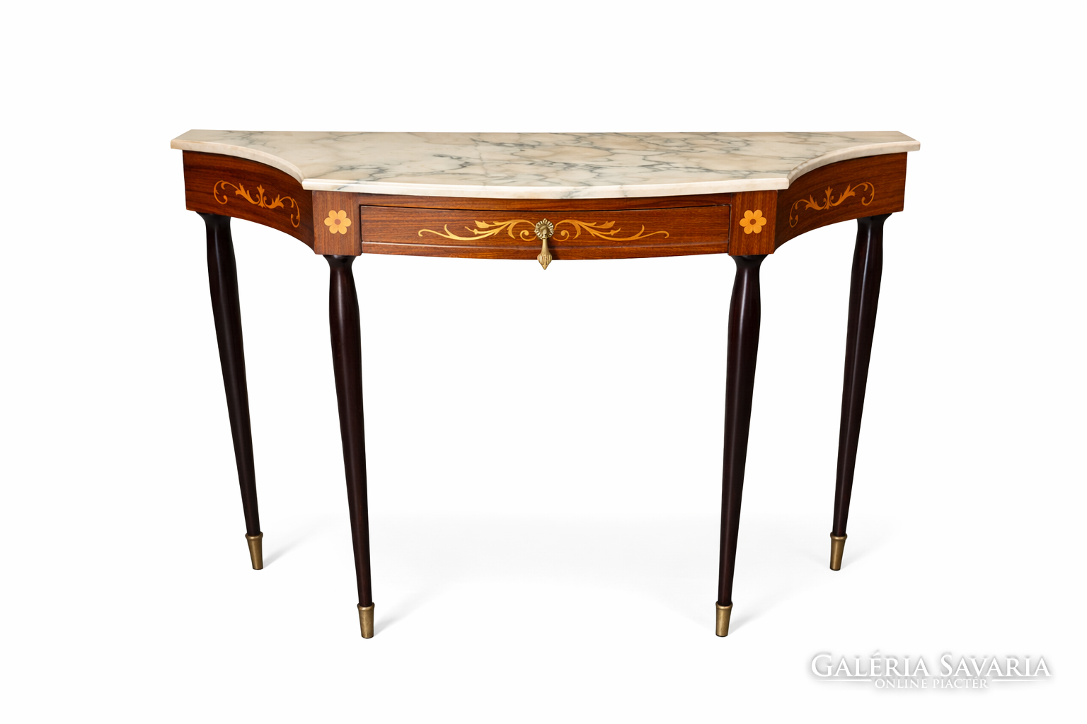 Elegáns, félköríves kialakítású konzolasztal az 1950-es évekből, feltehetően északi olasz manufaktúra munkája. A darab a neoklasszicista hagyományok finom továbbélését mutatja, a korszakra jellemző visszafogott, mégis dekoratív részletképzéssel.