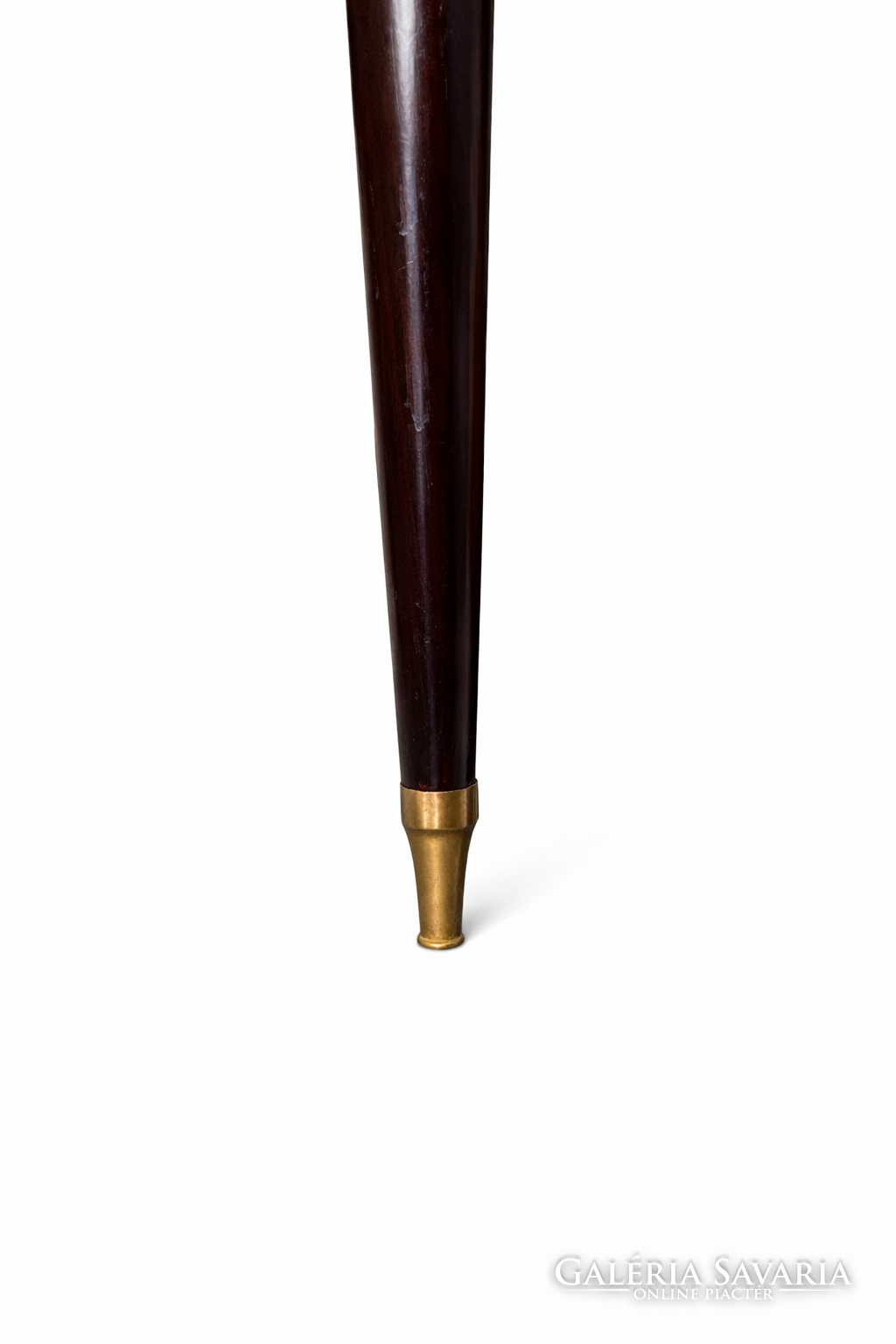 A karcsú, enyhén kúpos lábak bronz sabot-tal záródnak, tovább erősítve a tárgy elegáns, könnyed arányait. A felső részt világos, finoman erezett márványlap koronázza, amely kontrasztot teremt a sötétebb faanyaggal, és egyben luxus karaktert ad a bútornak.