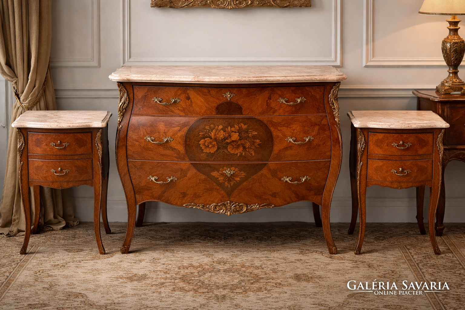 Intarziás hasas Komód két éjjeli szekrénnyel