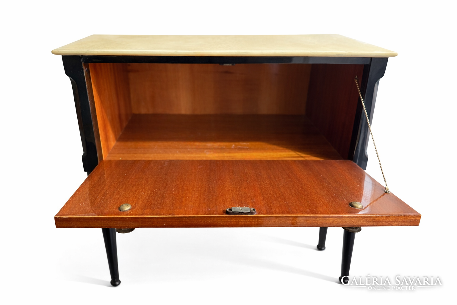 A szekrények arányos, kecses formavilágát karcsú, esztergált lábak emelik meg, könnyedséget és eleganciát sugallva, miközben az egész konstrukció stabil és kiegyensúlyozott marad. A fiókelőlapokat finom, ívelt vonalvezetésű világos intarzia díszíti, amely klasszikus Art Deco motívumokat idéz, míg az eredeti, dekoratív fém gombok diszkrét, mégis hangsúlyos részletként zárják a kompozíciót.
