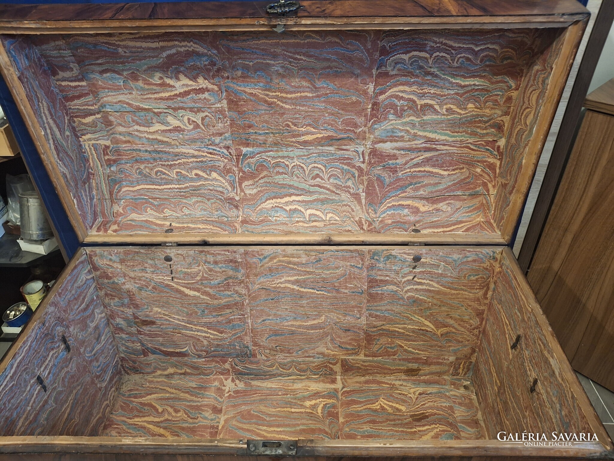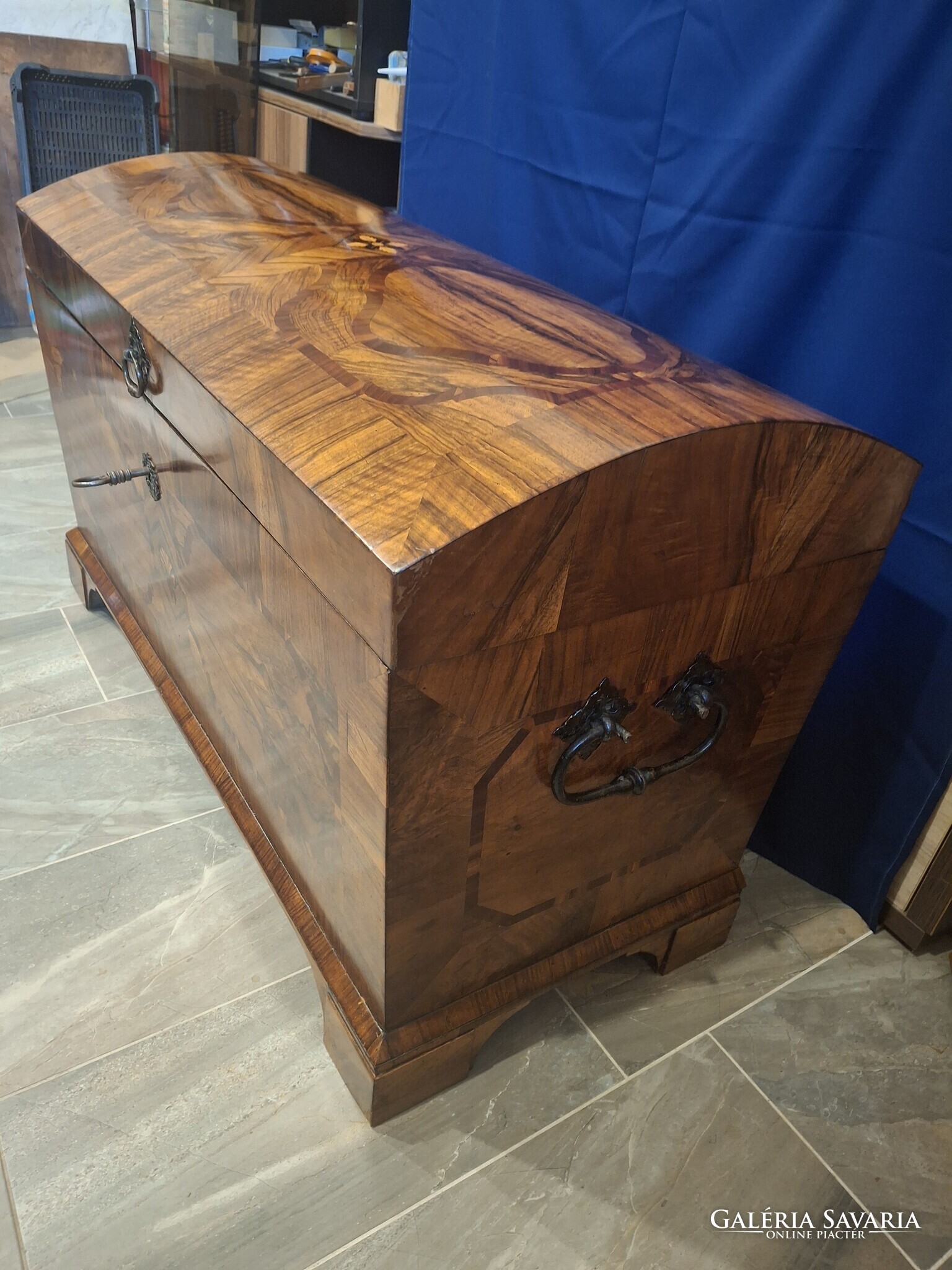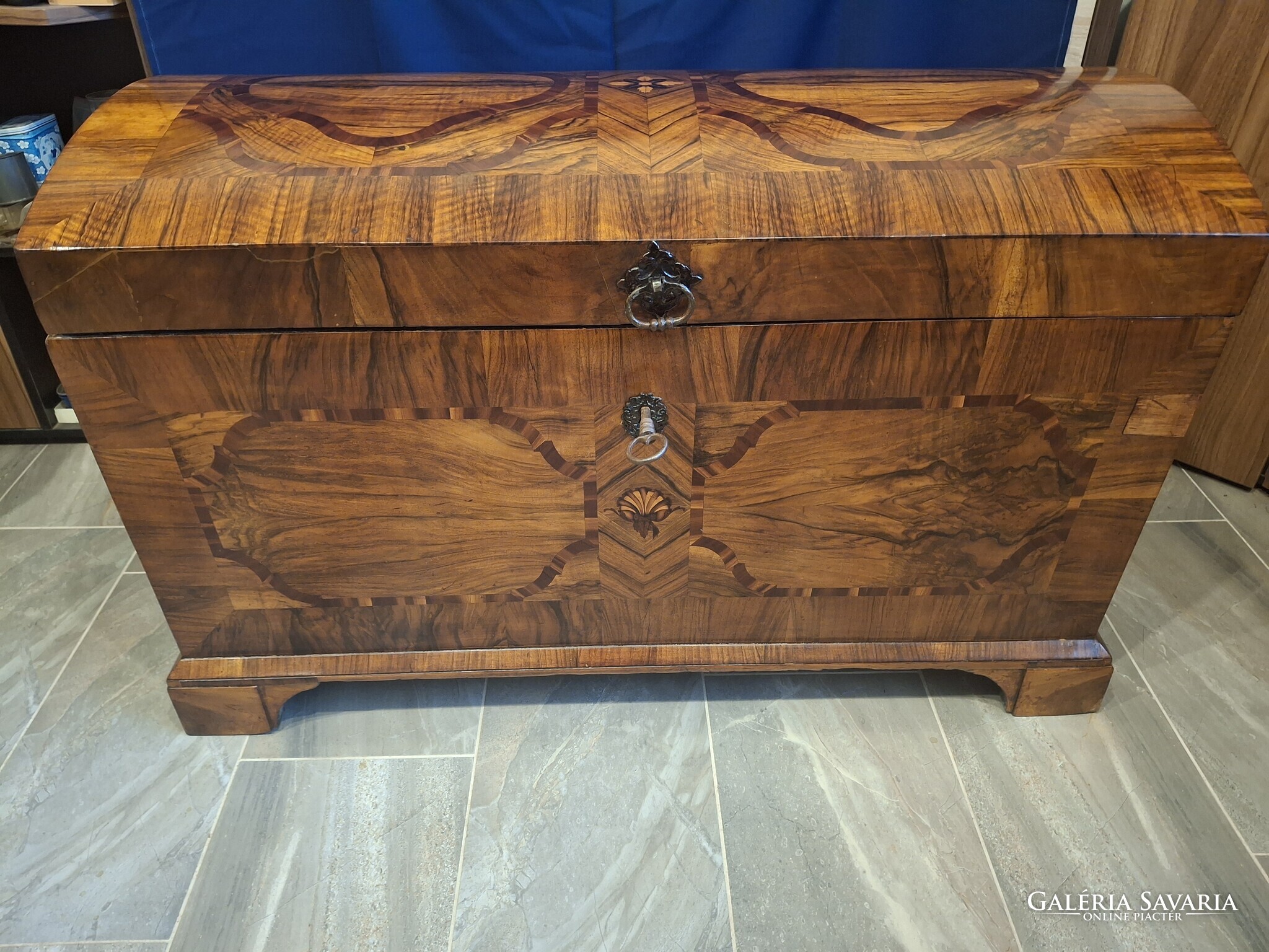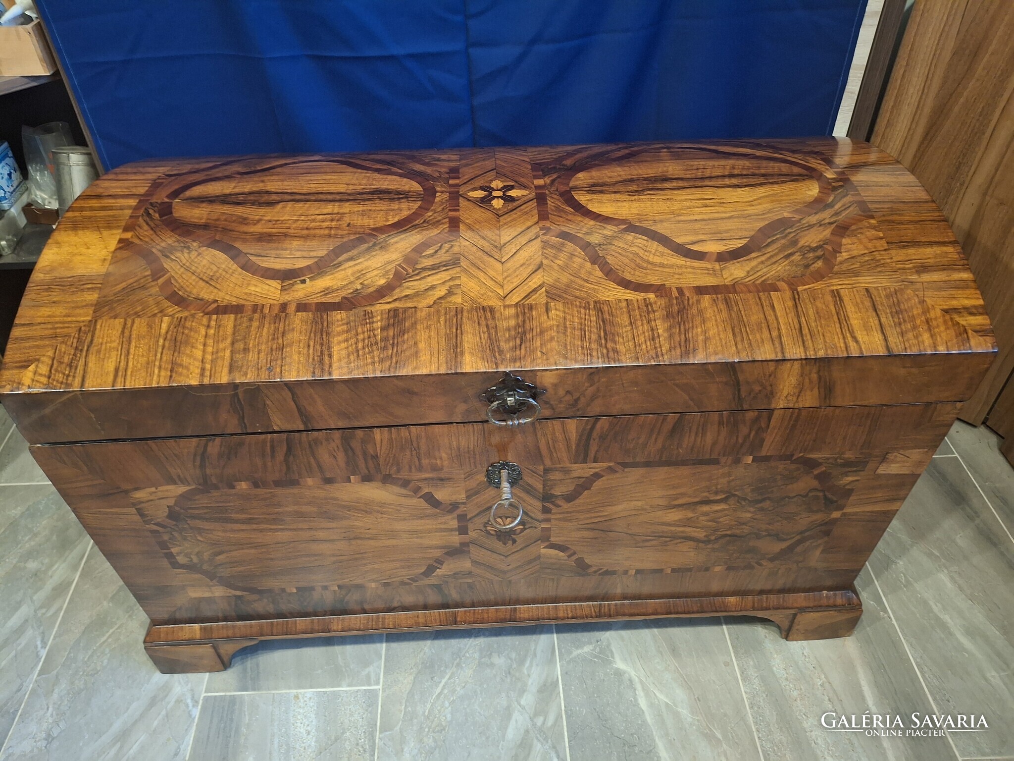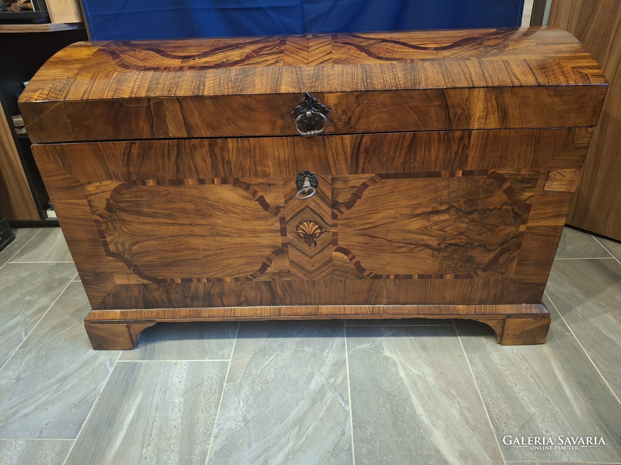 Egy gyönyörű restaurált barokk láda. Eredeti zárral, kulccsal, veretekkel. Selyemfényre politúrozva. 115x60x70 cm.
