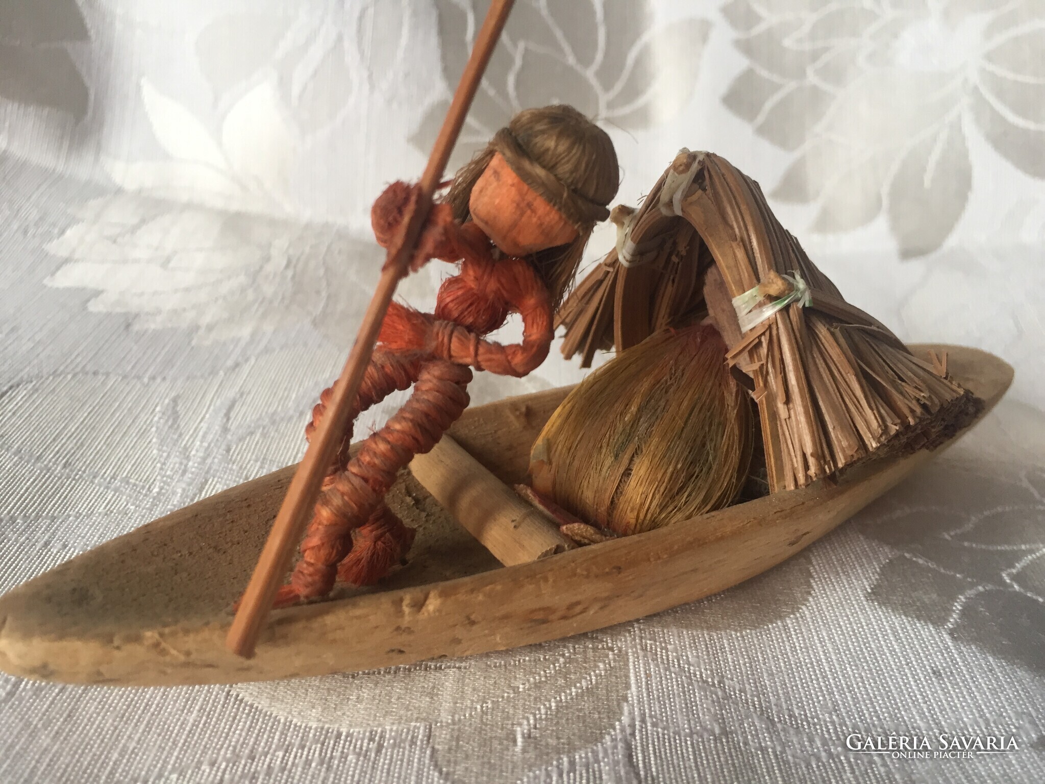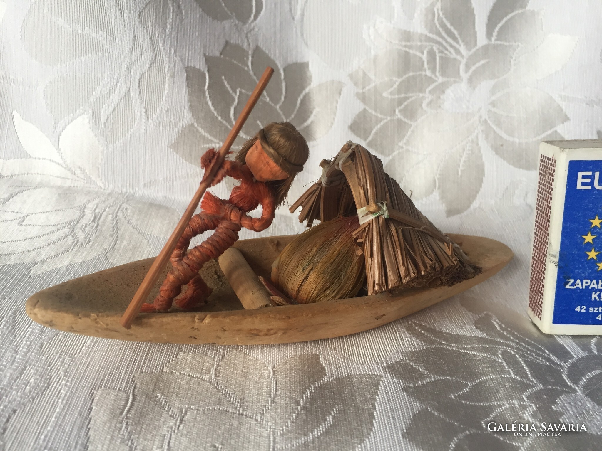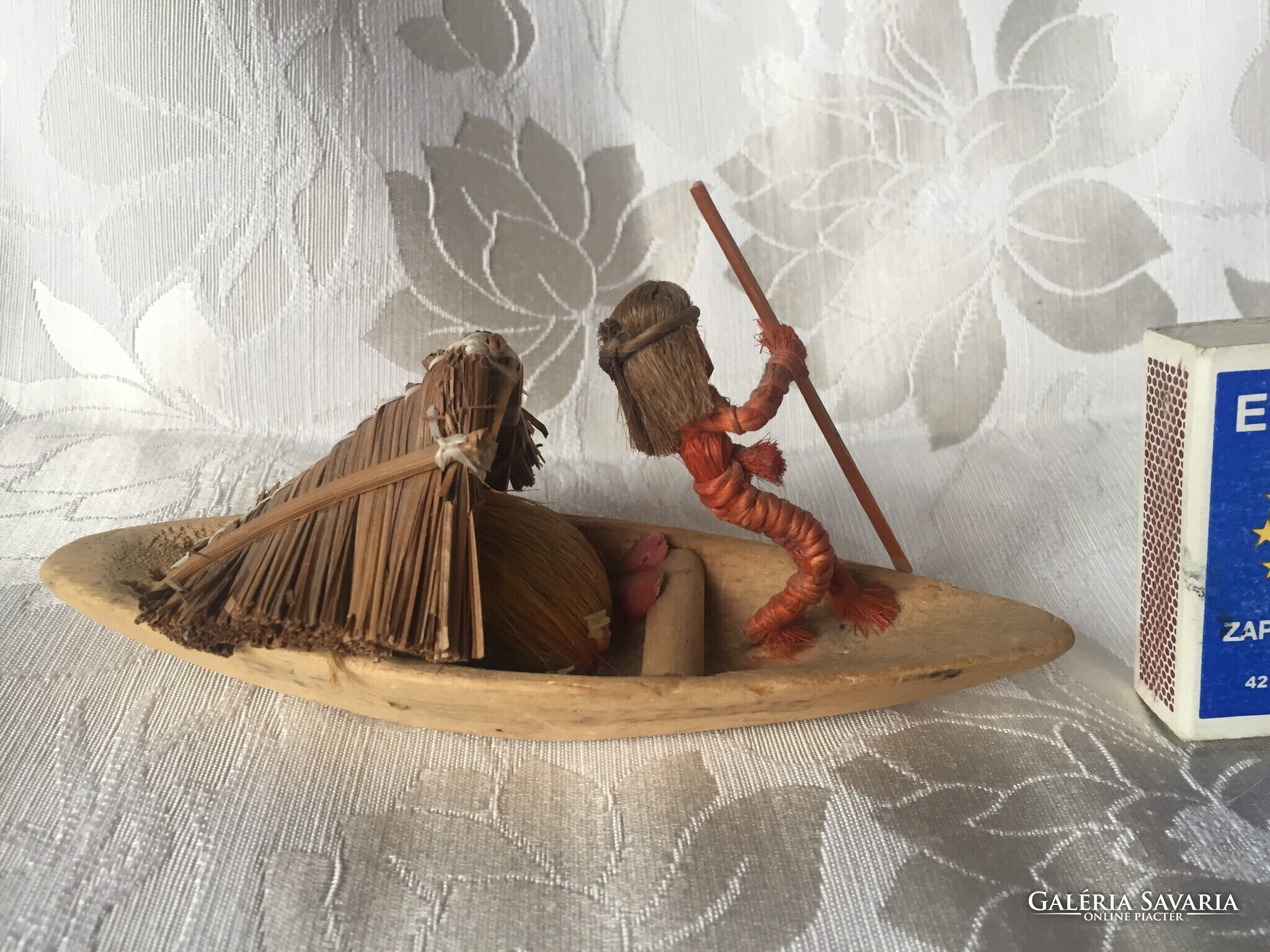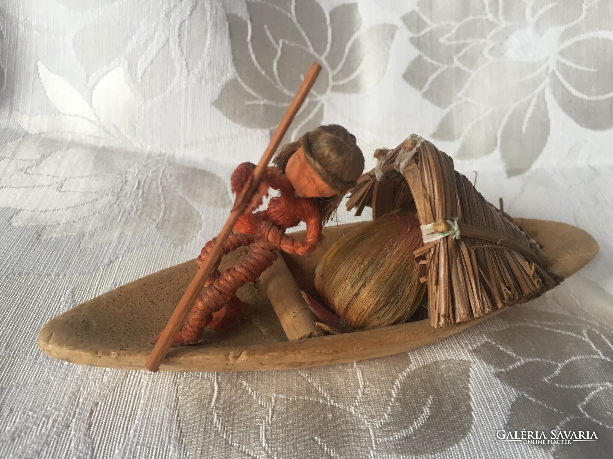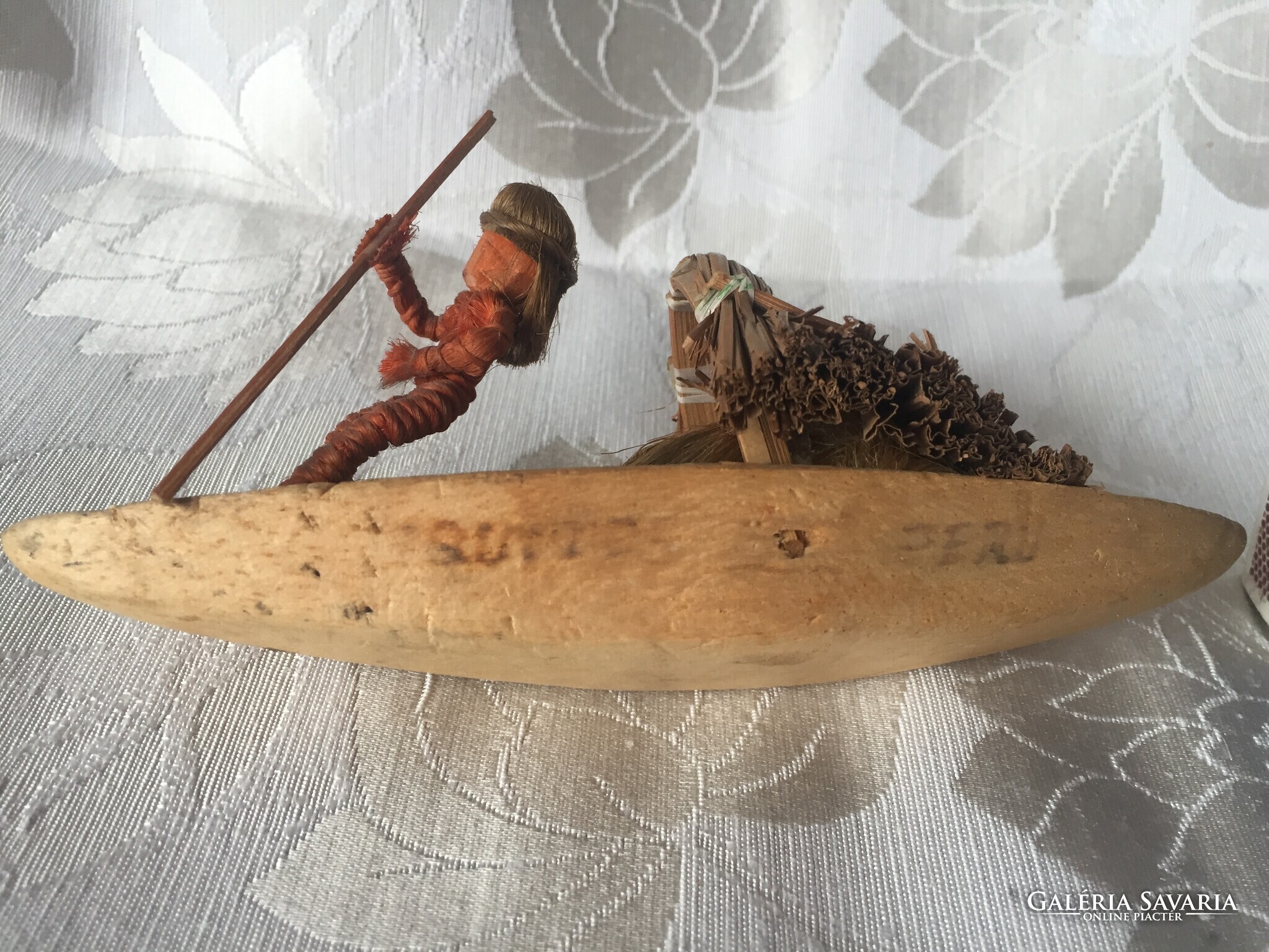 Régi perui csónak, hajó, spulni, cérna ember, indián figurával, ajándéktárgy, utazási emlék