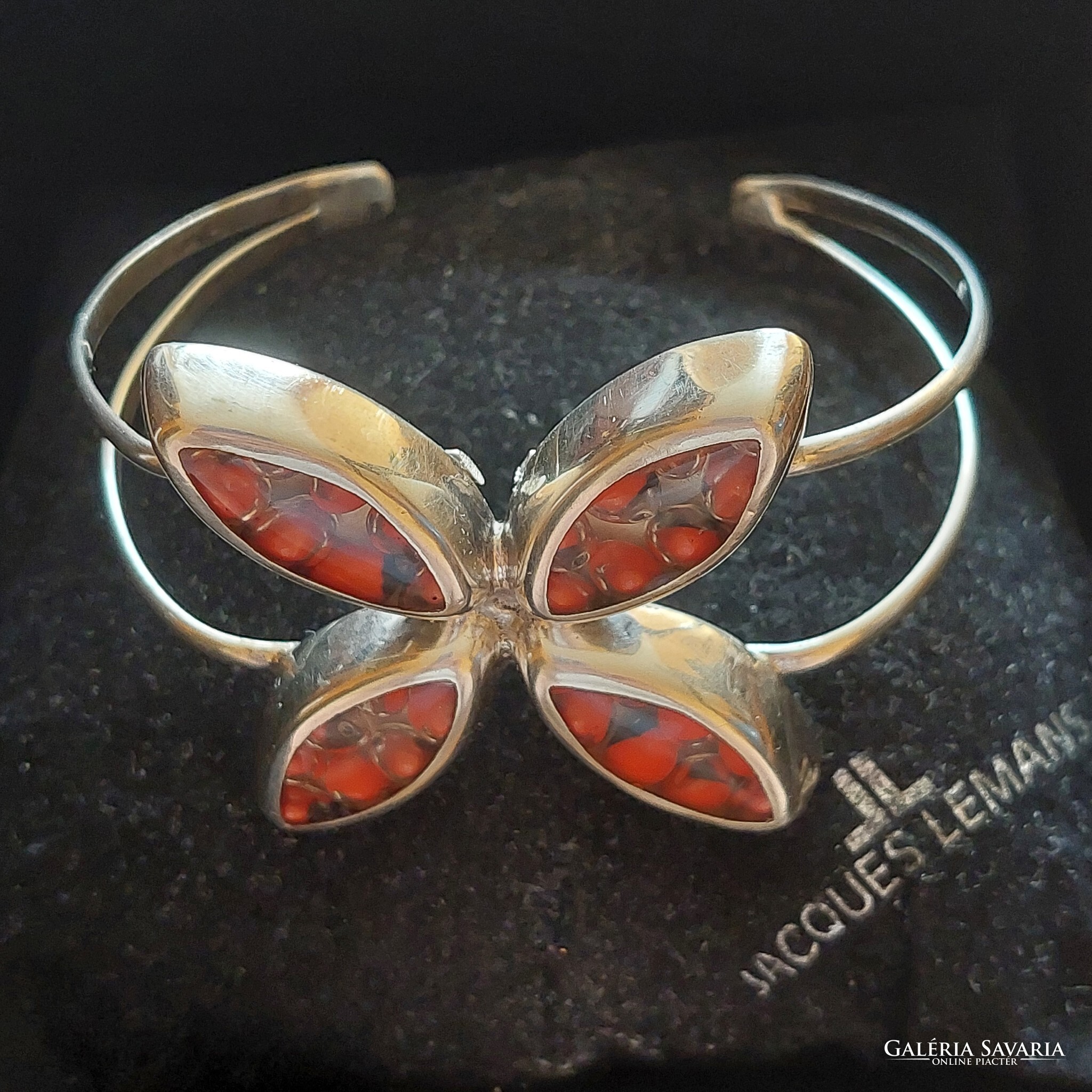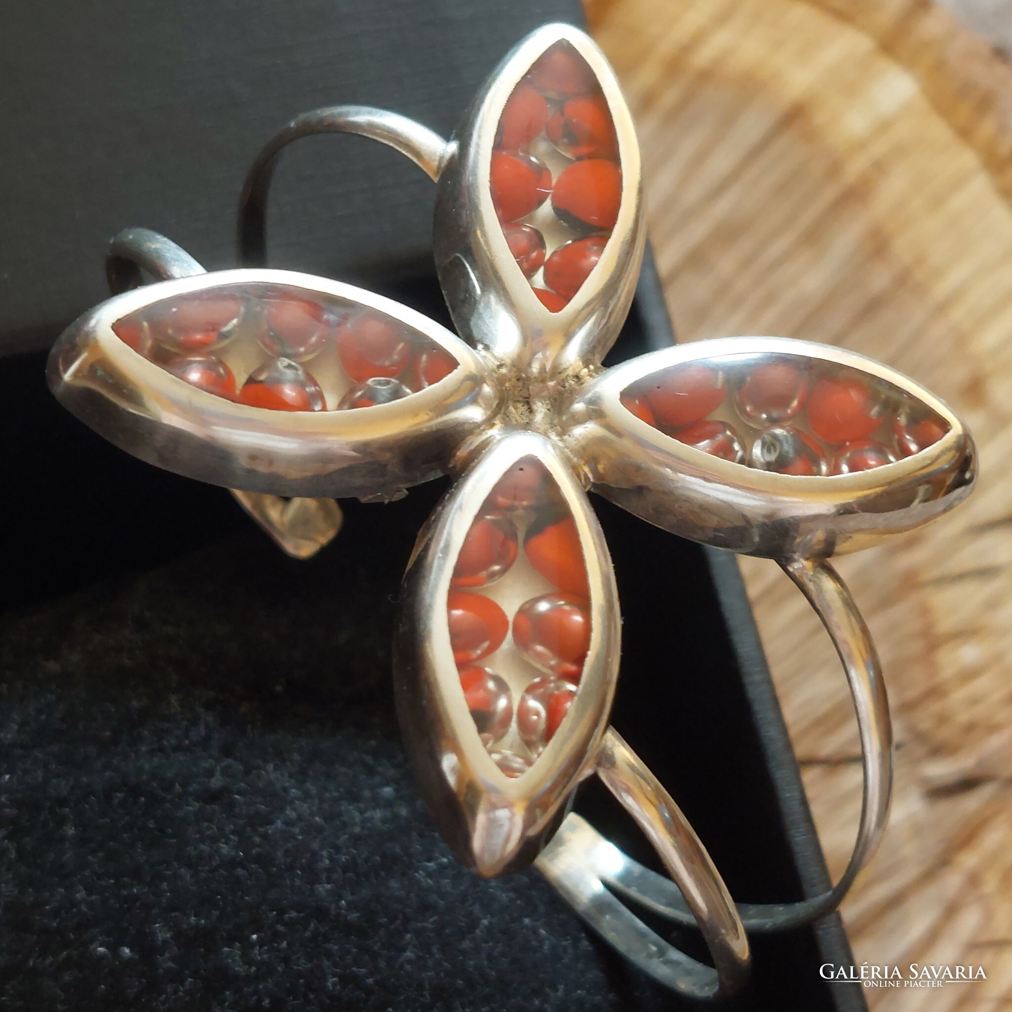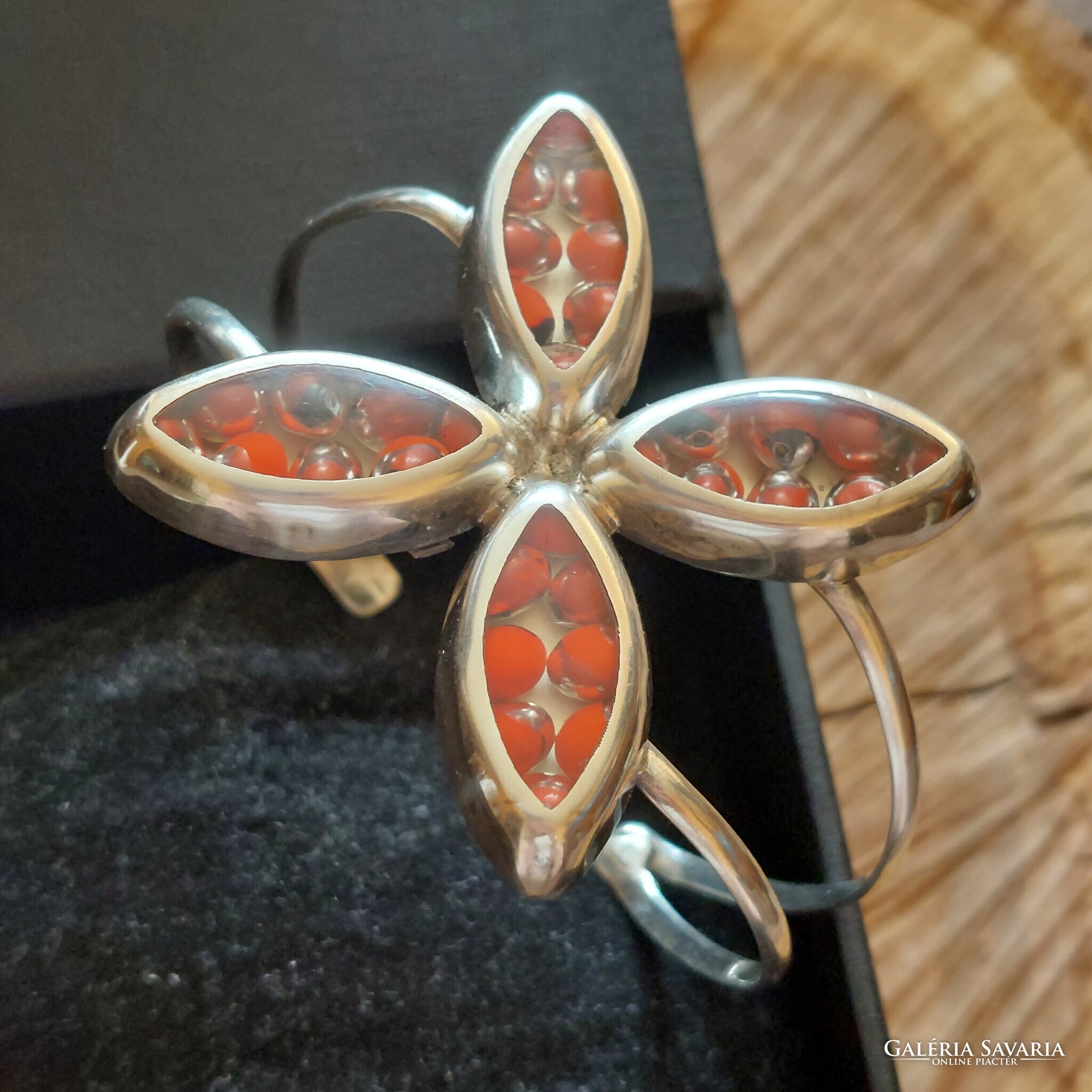 Csodás virág formájú ezüst karperec piros bogyókkal, nyitott