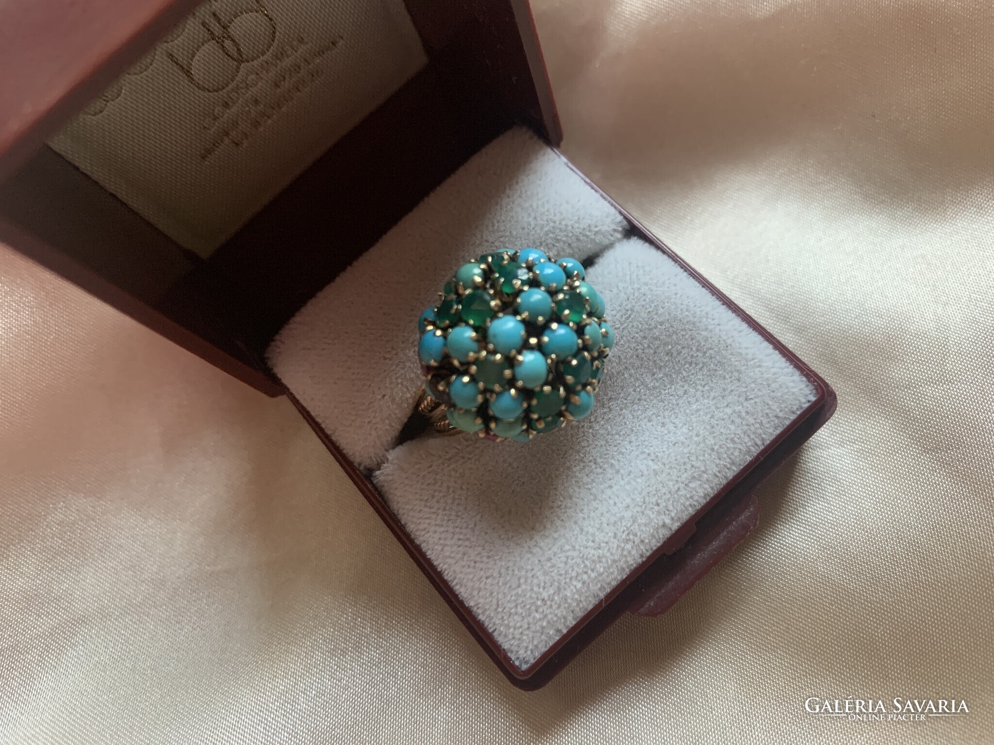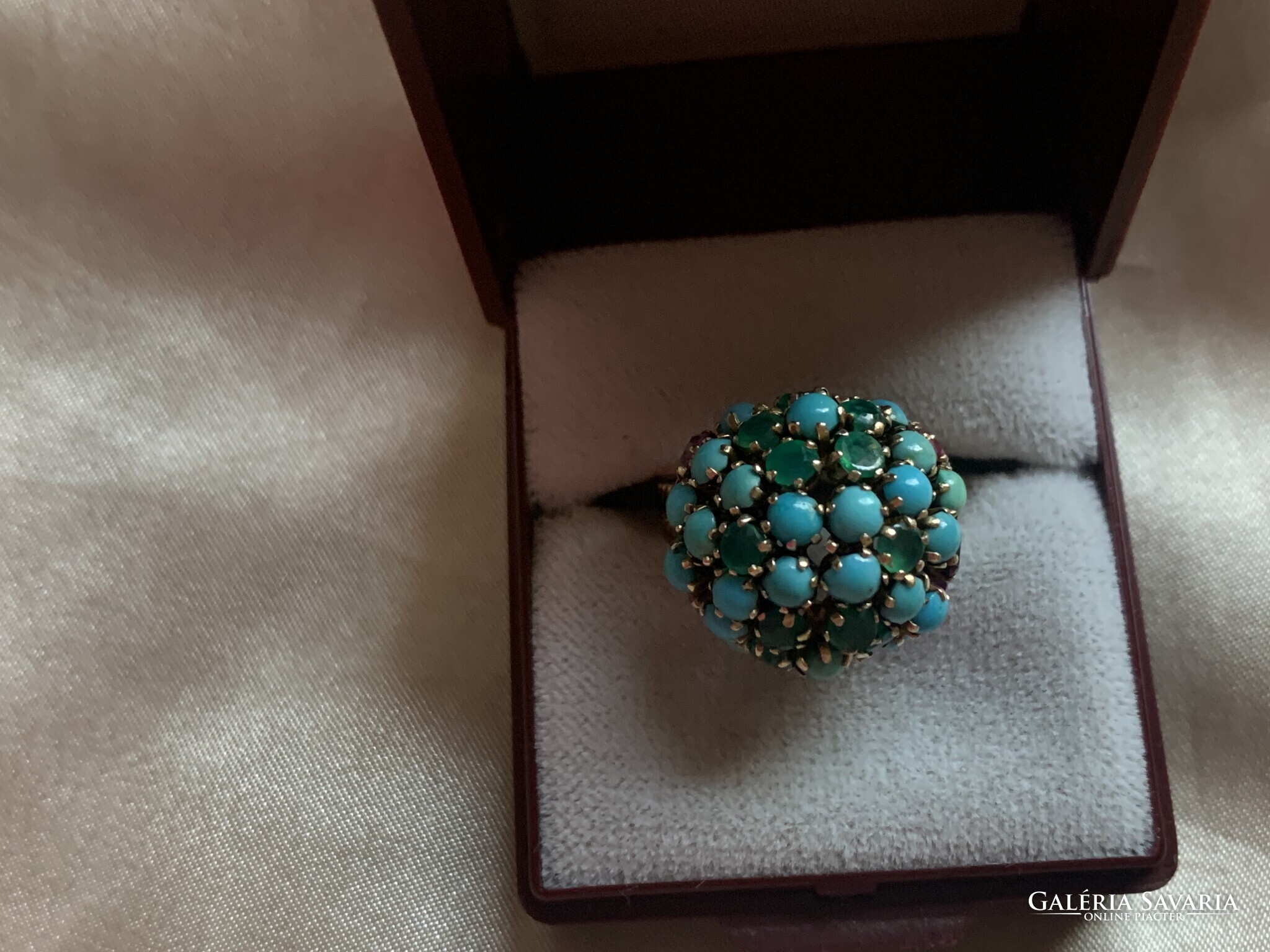 A gyűrű eredetileg rubin és smaragd virágot formáz a türkiz kövek között