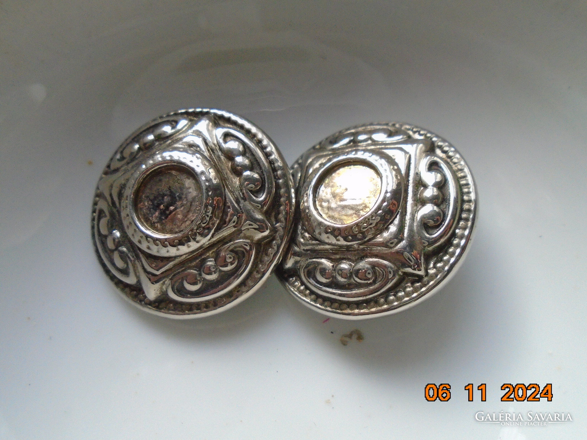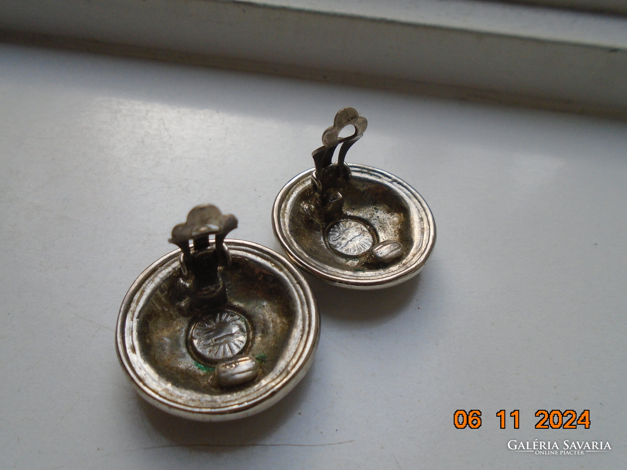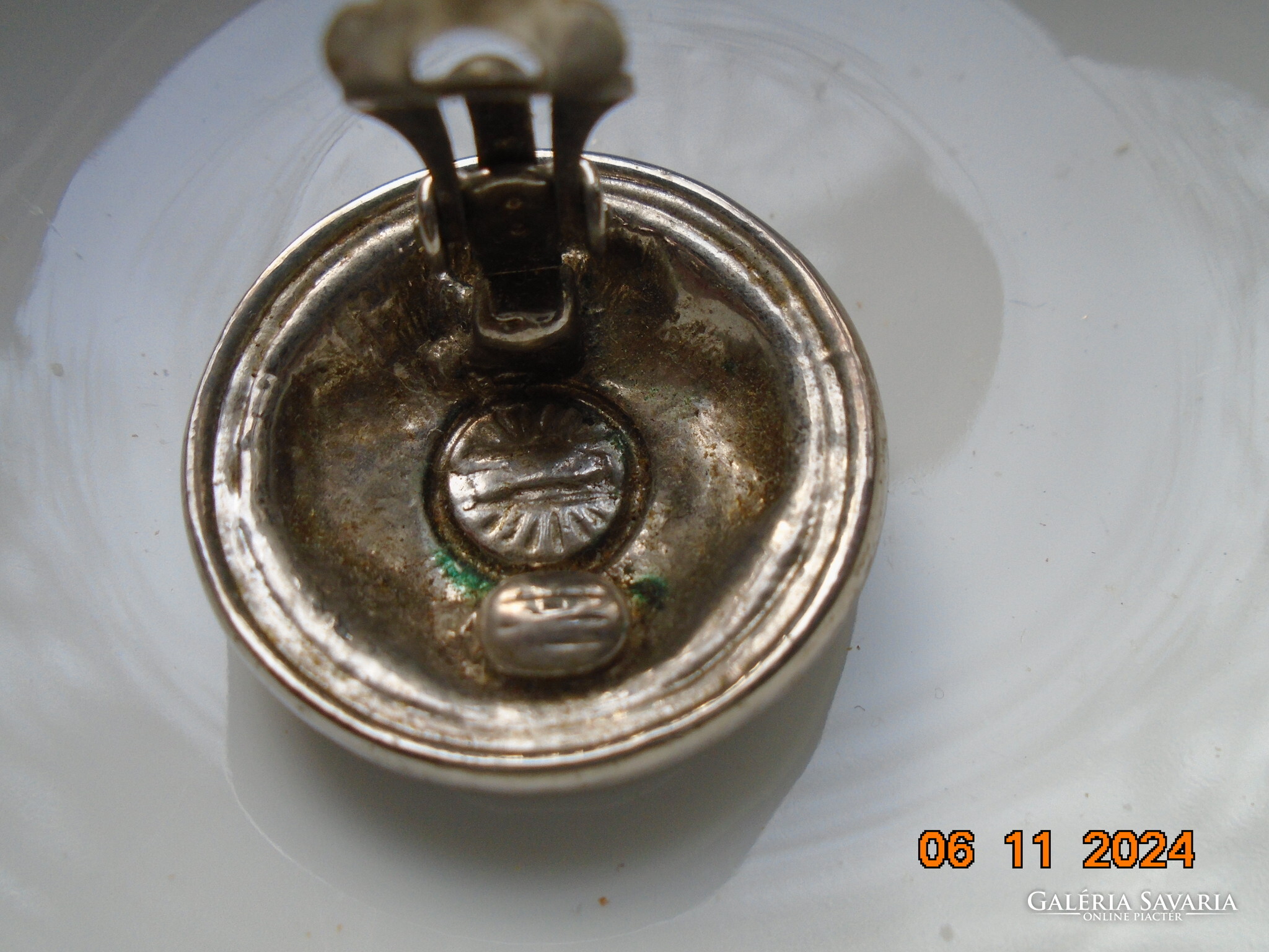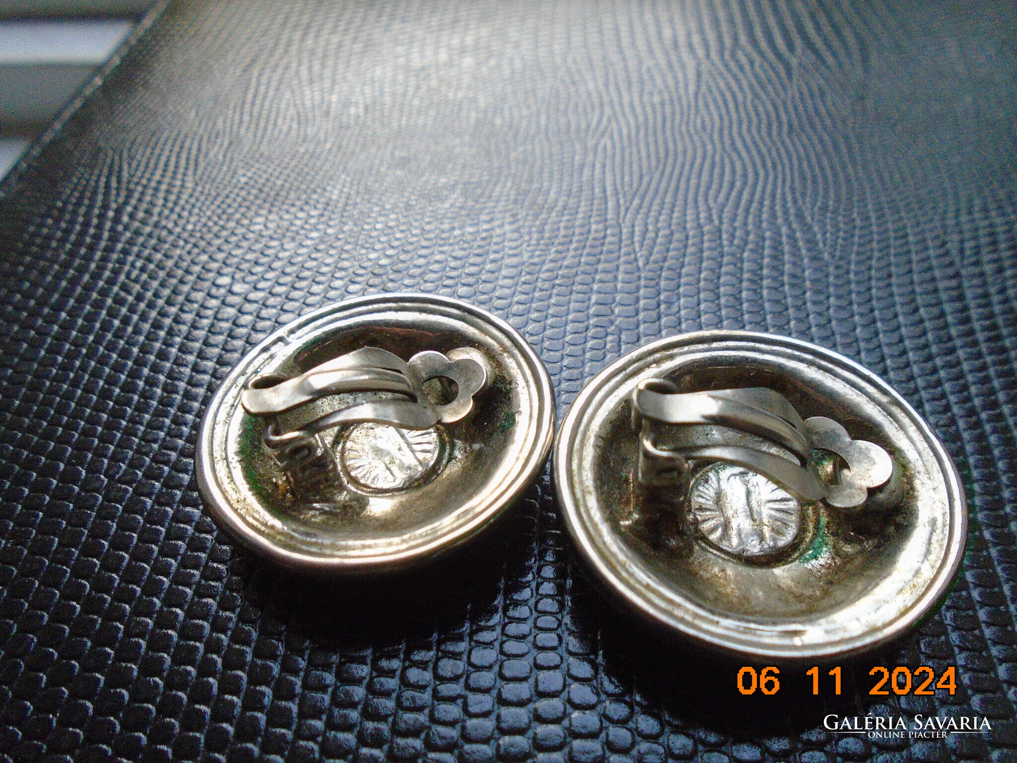 Antik ezüstözött dombormintás nagyobb öntvény klipsz fülbevaló.érdekes jelzéssel-forrasztott kapoccsal.