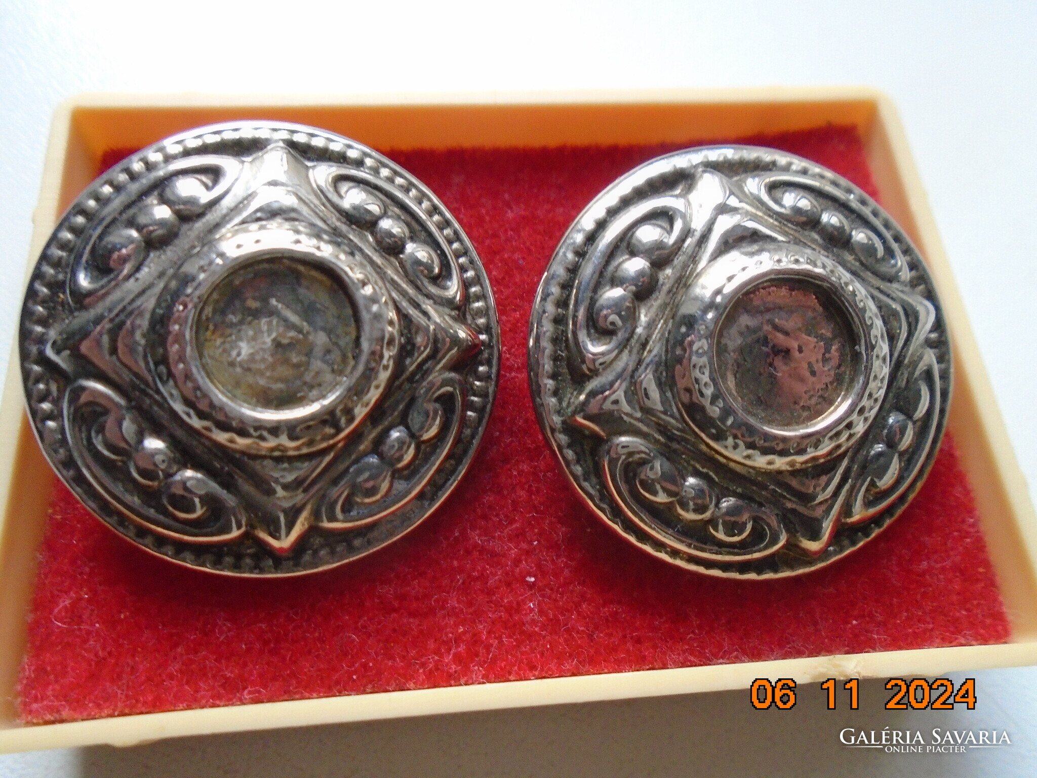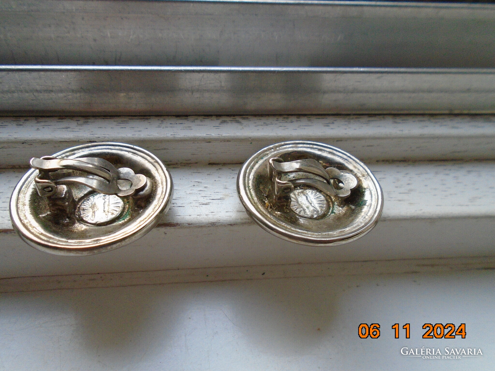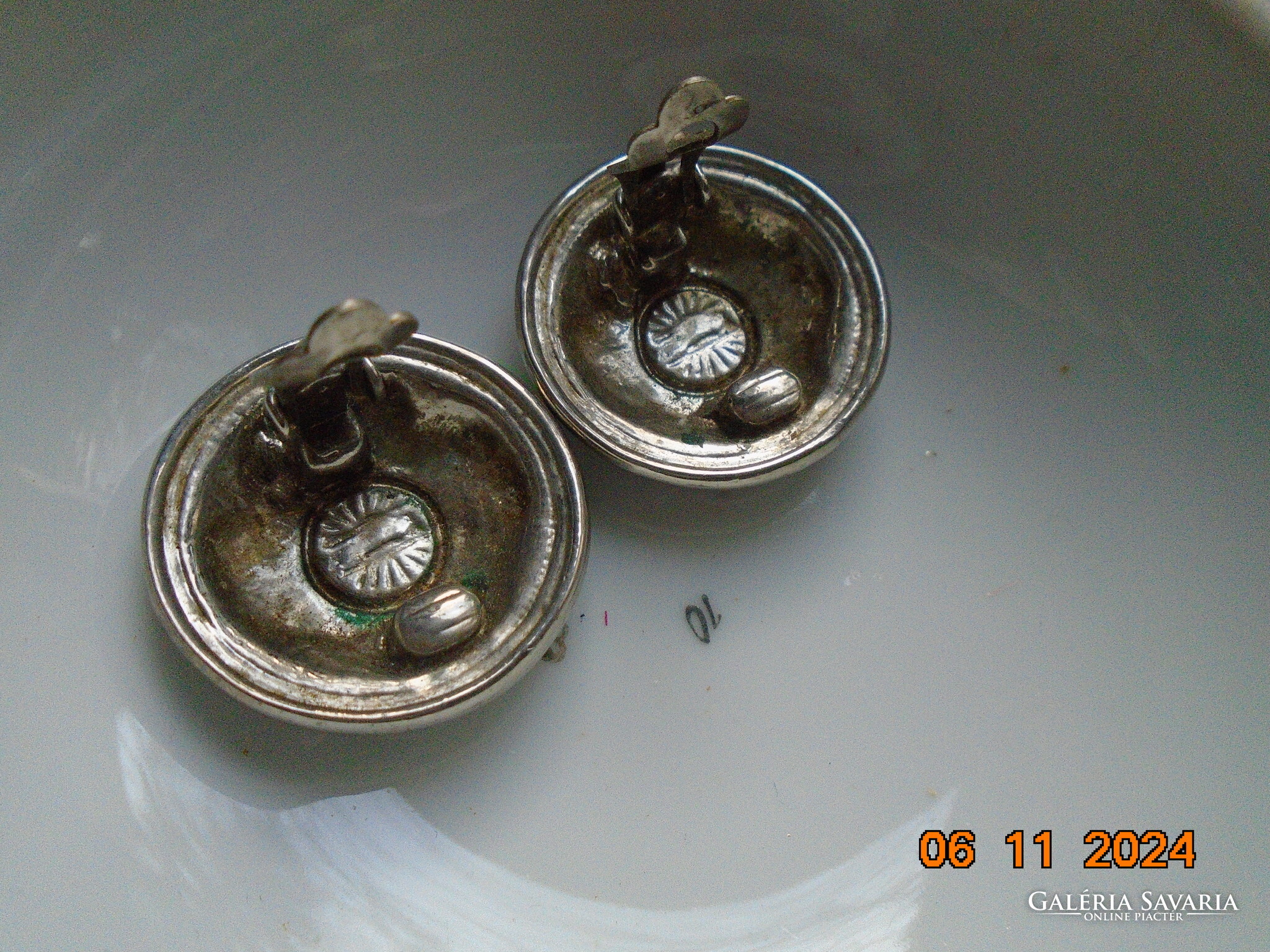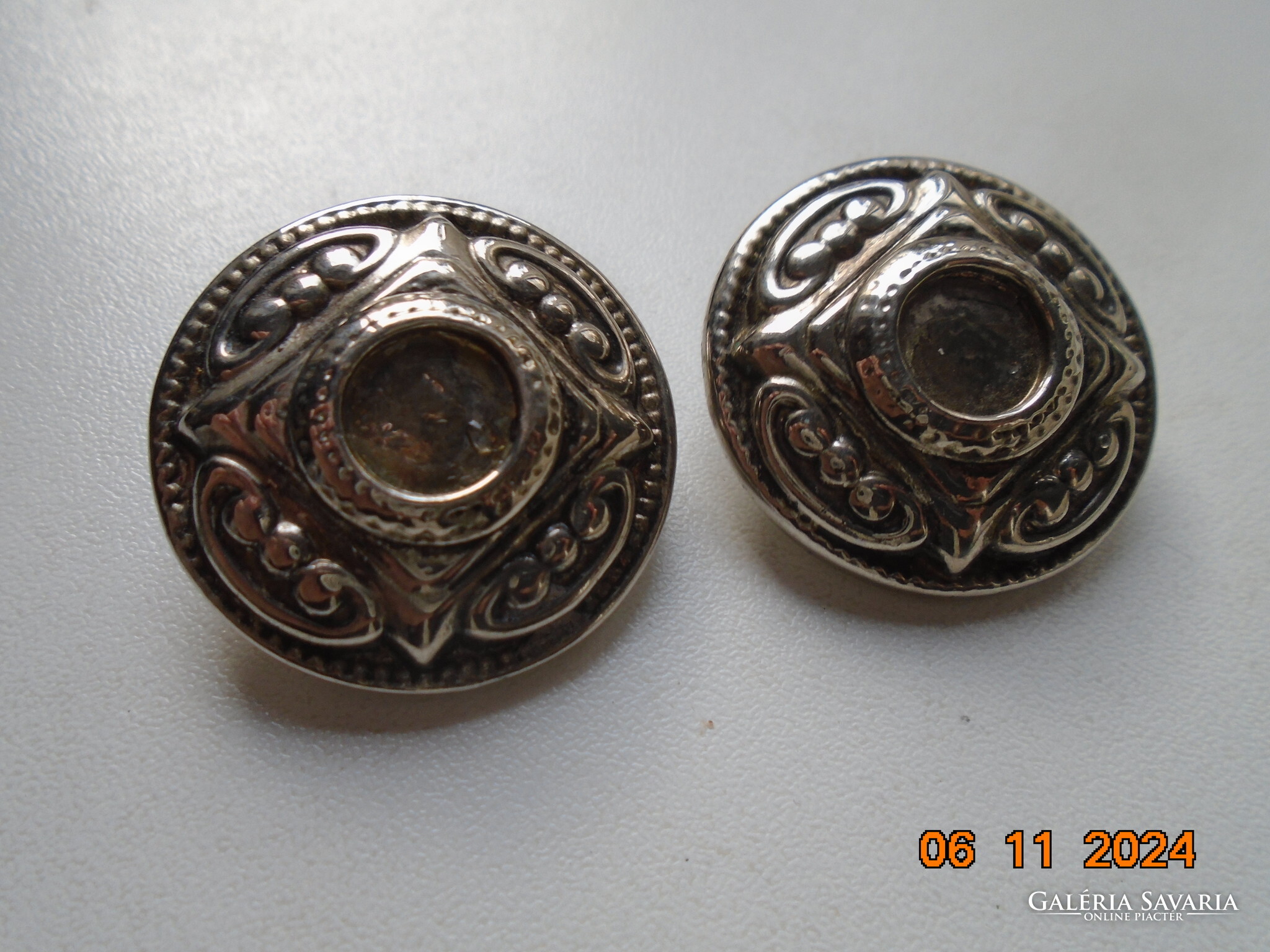 Antik ezüstözött dombormintás nagyobb öntvény klipsz fülbevaló.érdekes jelzéssel-forrasztott kapoccsal.