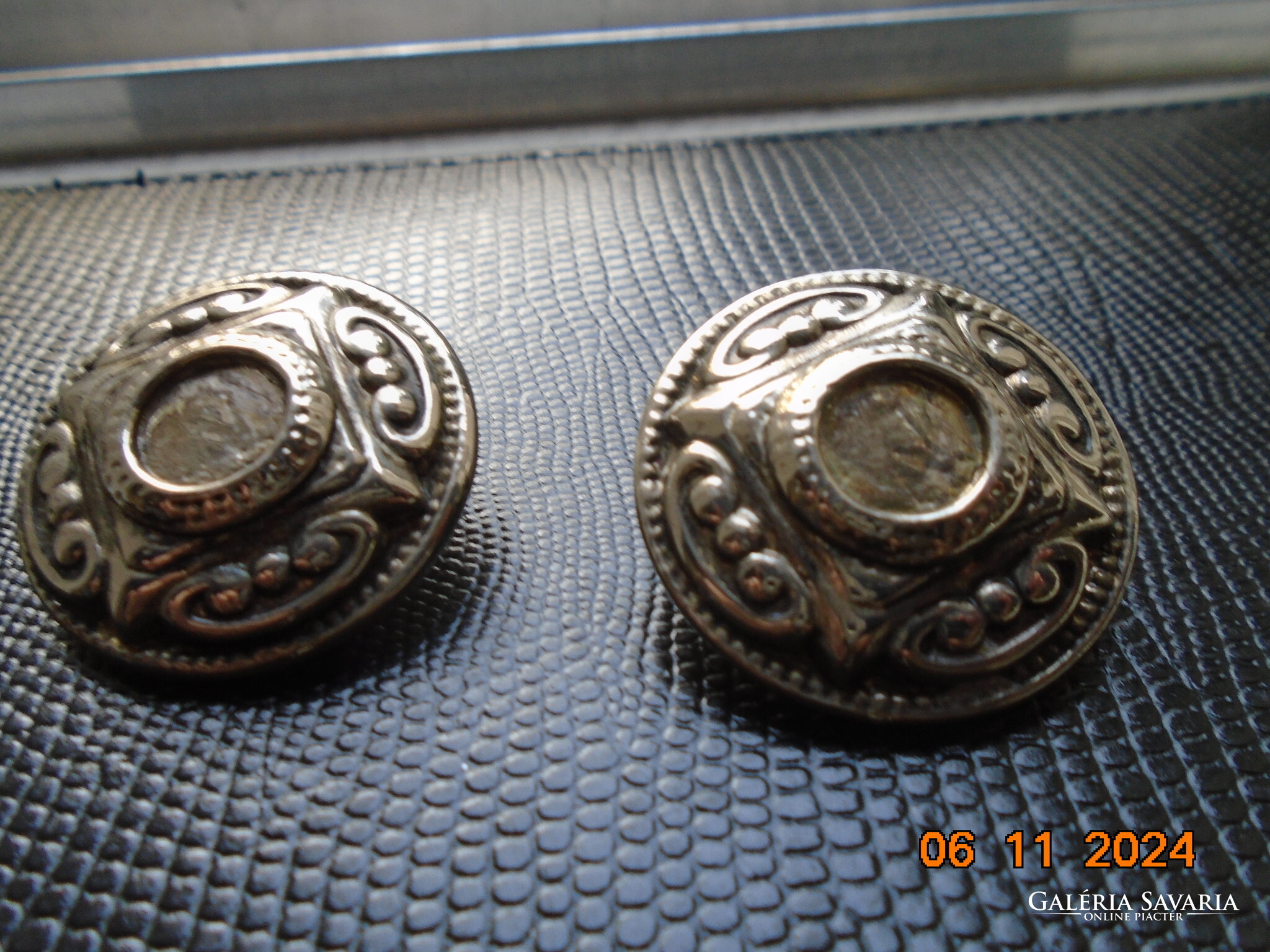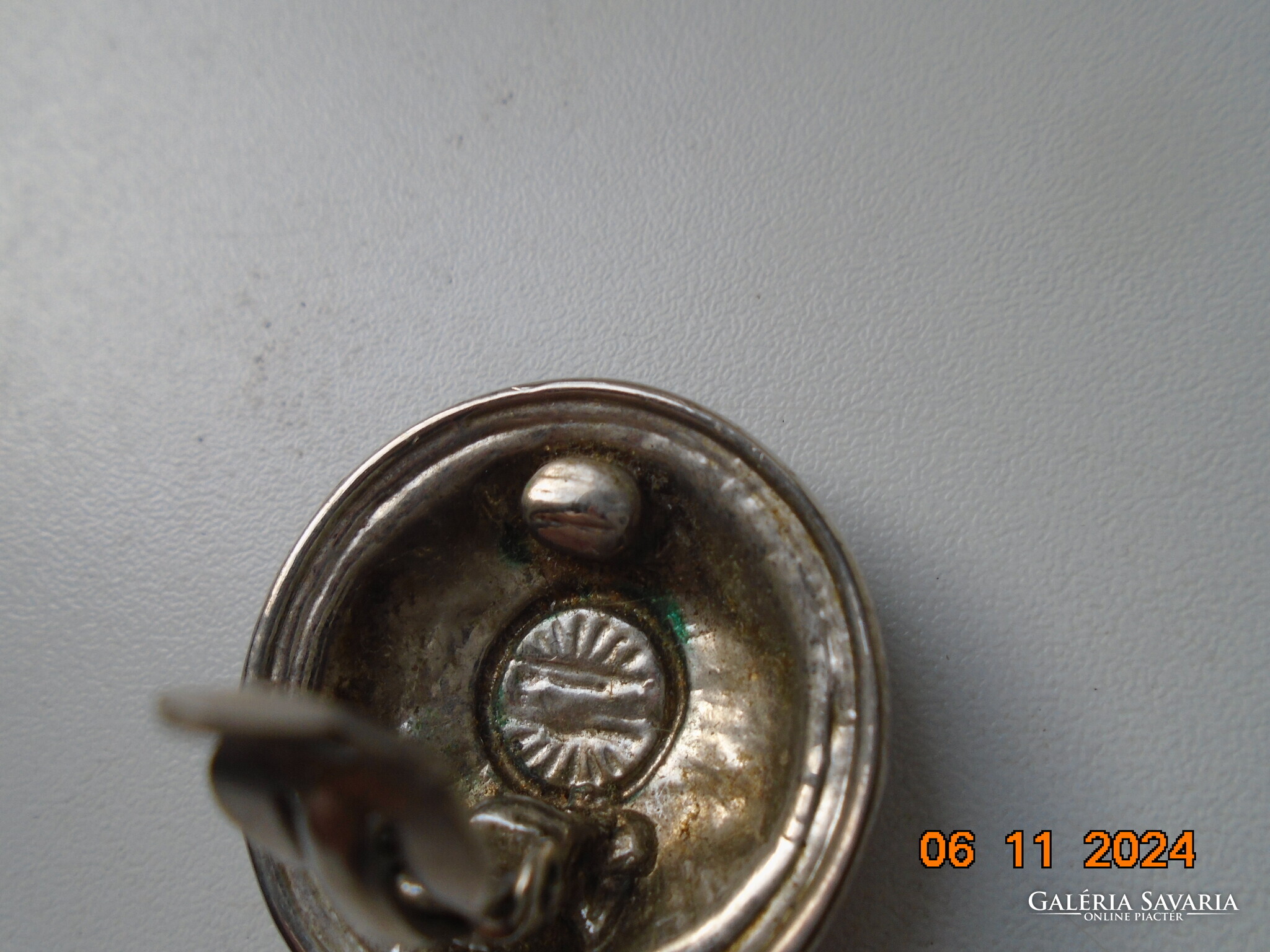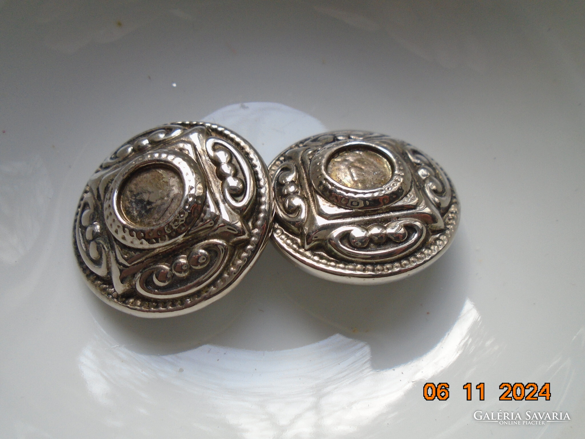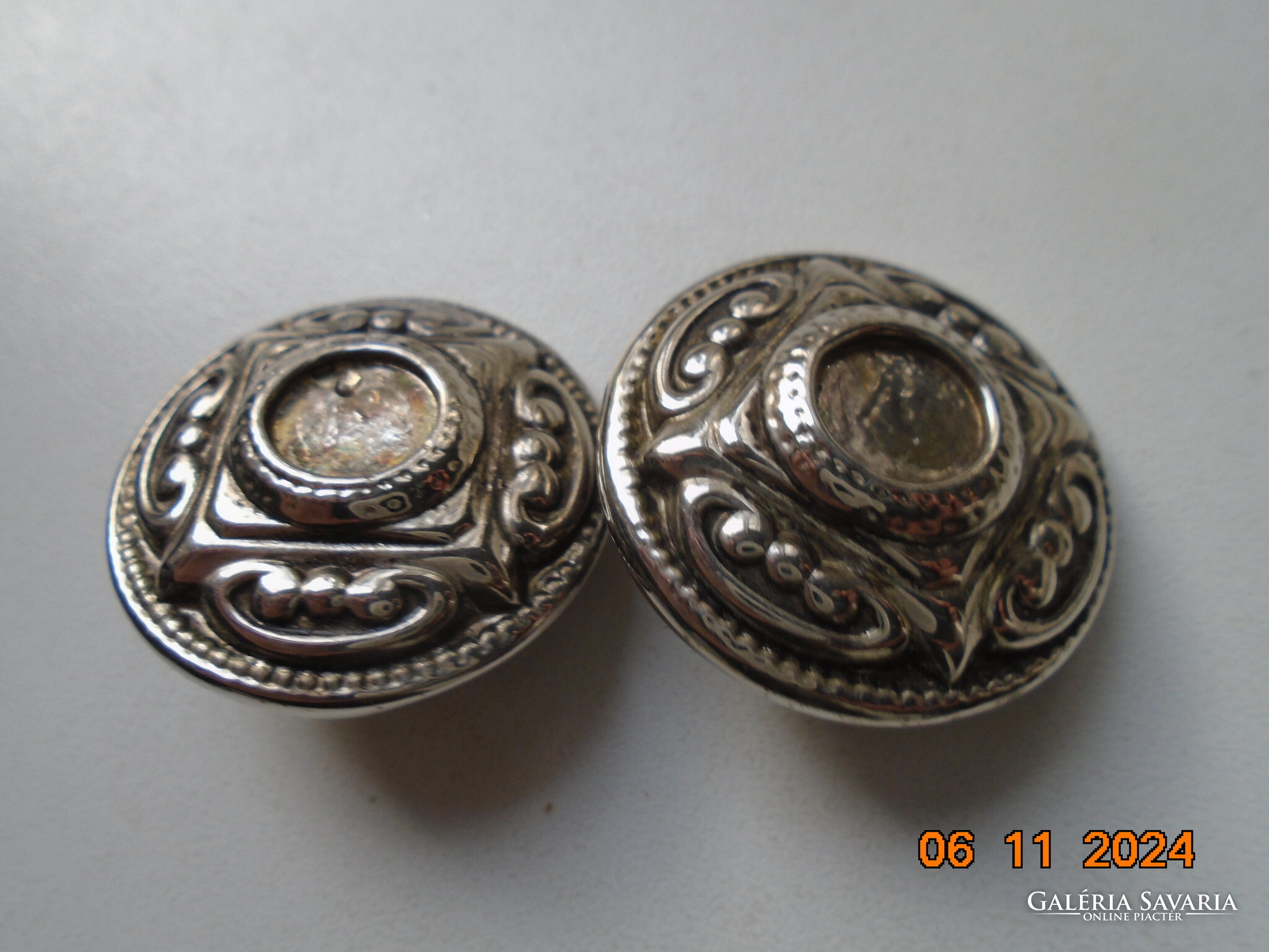 Antik ezüstözött dombormintás nagyobb öntvény klipsz fülbevaló.érdekes jelzéssel-forrasztott kapoccsal.