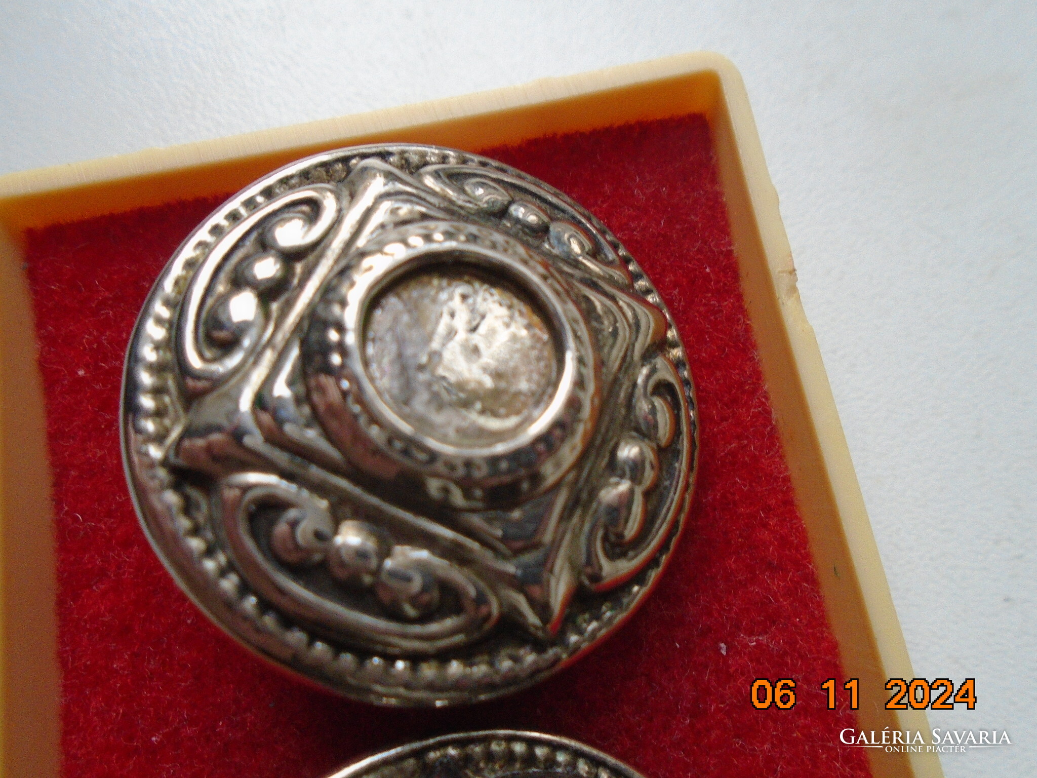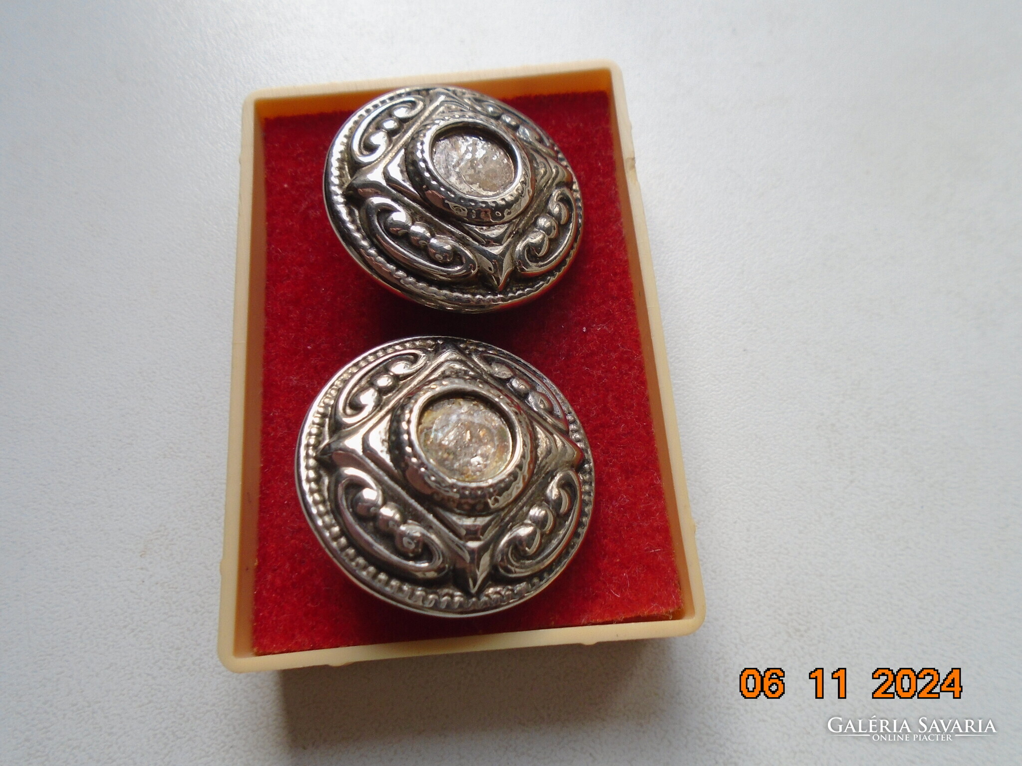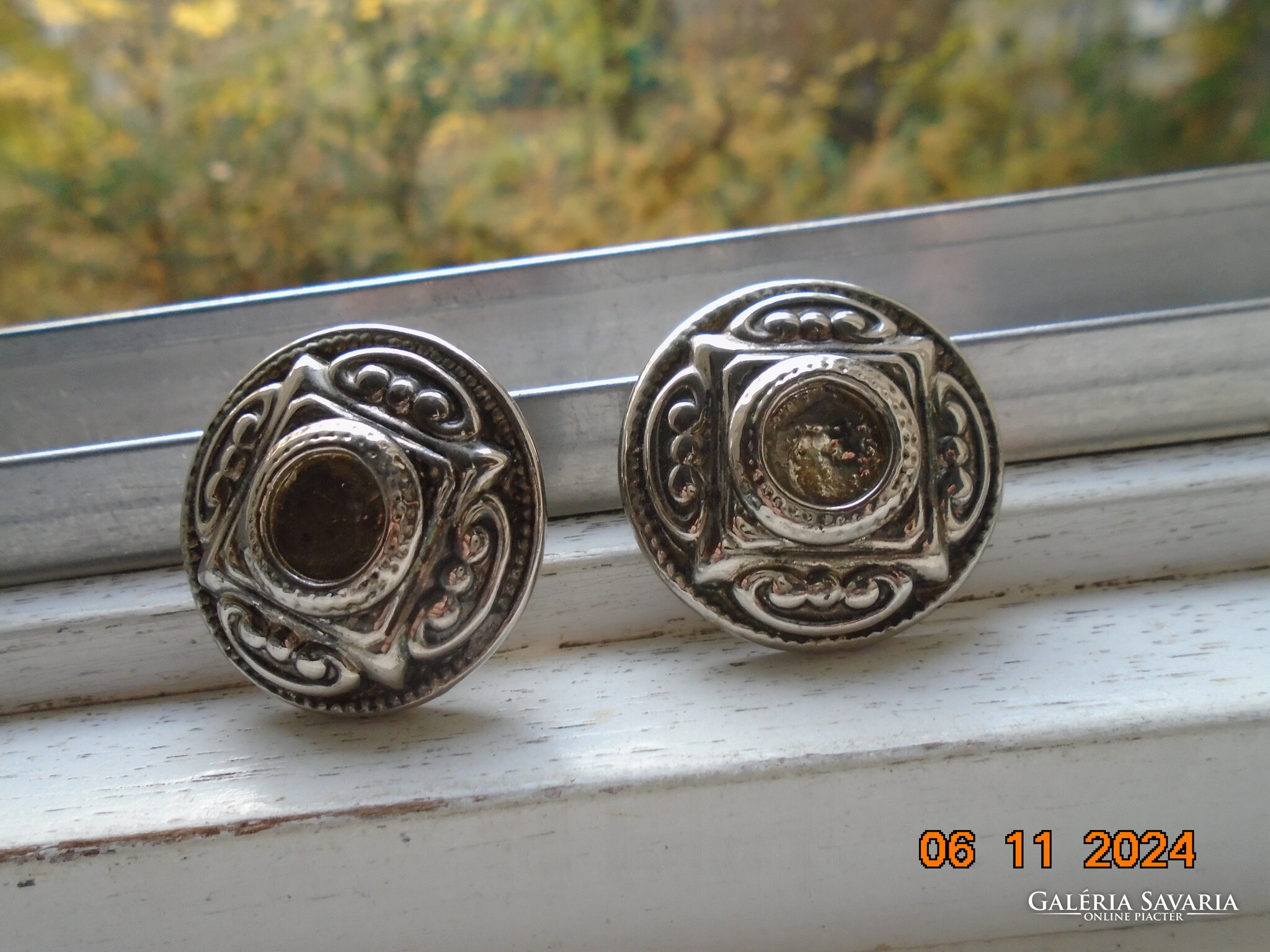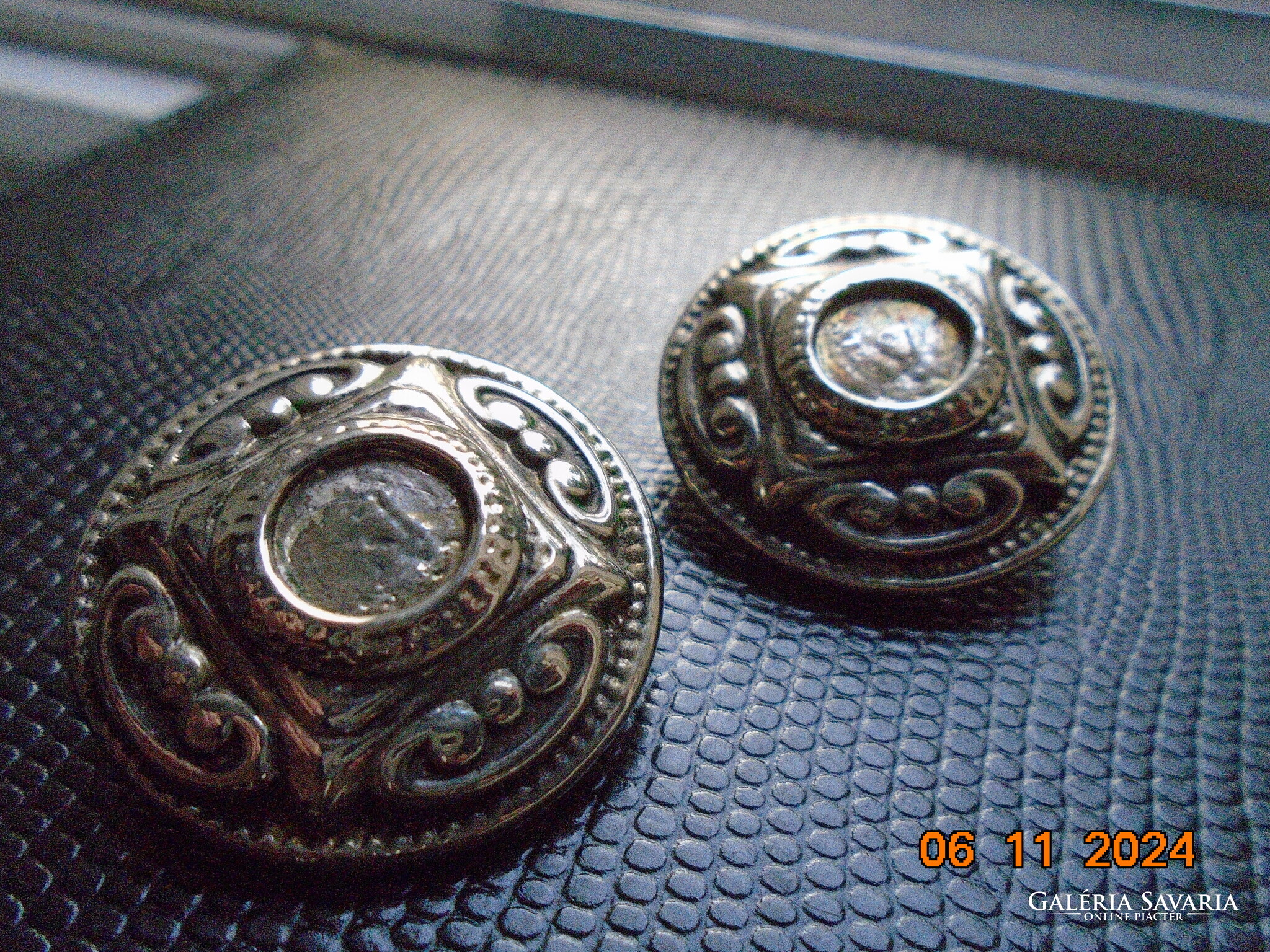 Antik ezüstözött dombormintás nagyobb öntvény klipsz fülbevaló.érdekes jelzéssel-forrasztott kapoccsal.