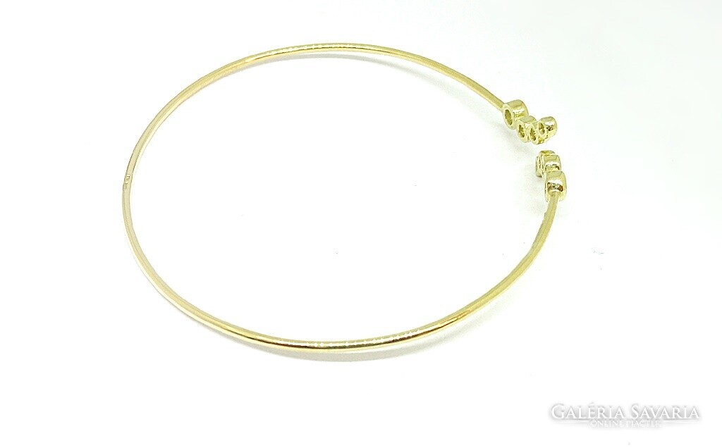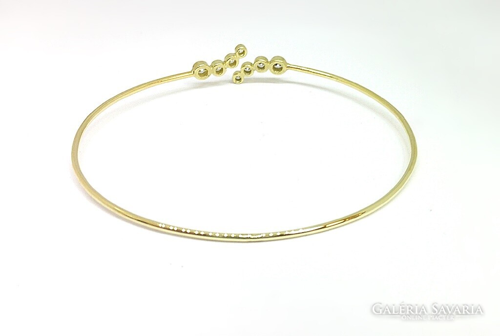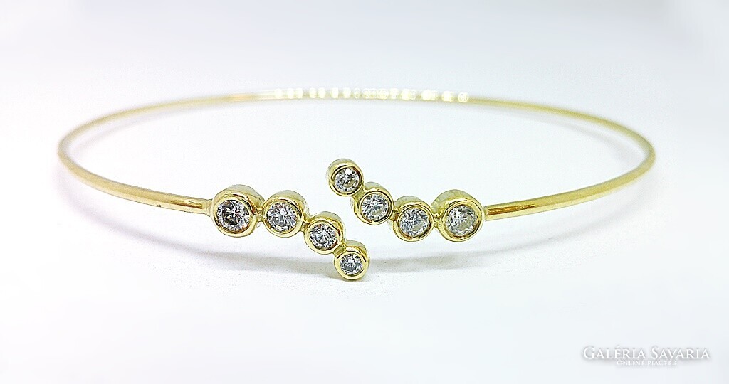 Mutatós,modern stílusú,finom,nyitott kialakítású sárga arany karreif.Fehér cirkónia kövekkel díszített,átmérőjük foglalattal:0,1-0,3cm.Belső mérete:5,7x4,9cm.Szélessége:0,1cm.Súlya:3,7gr,finomsága:14k.Magyar fémjellel ellátott.