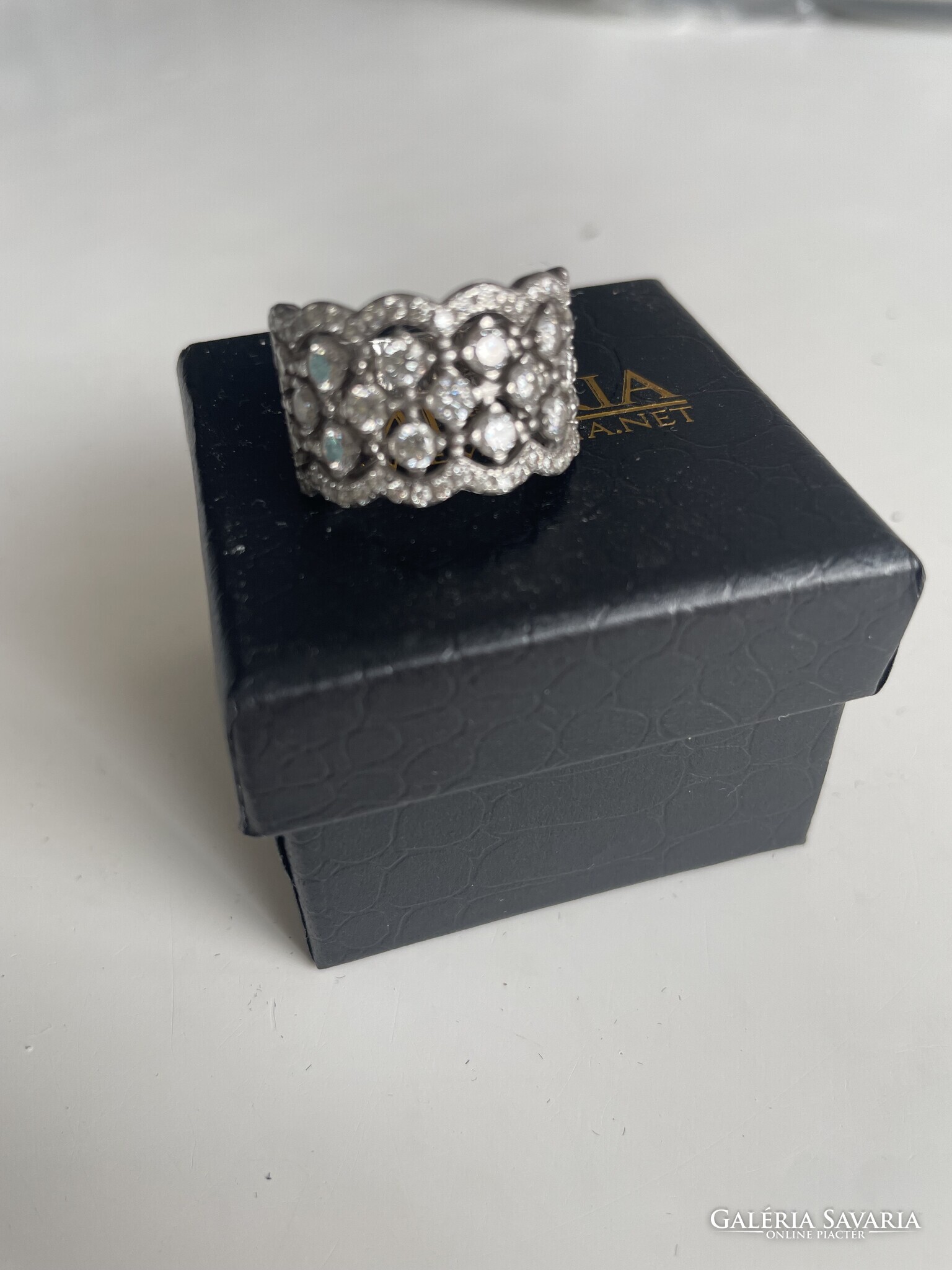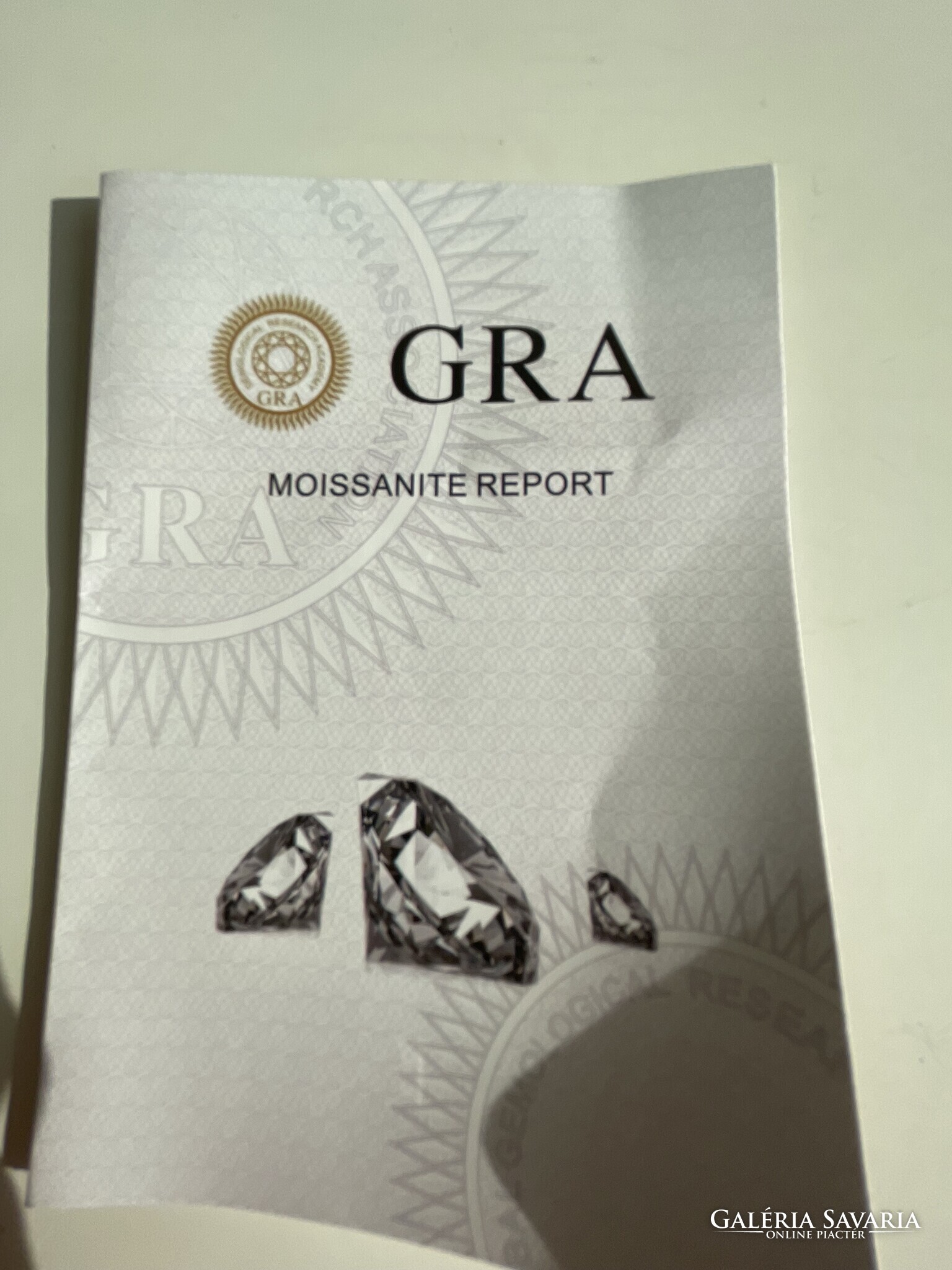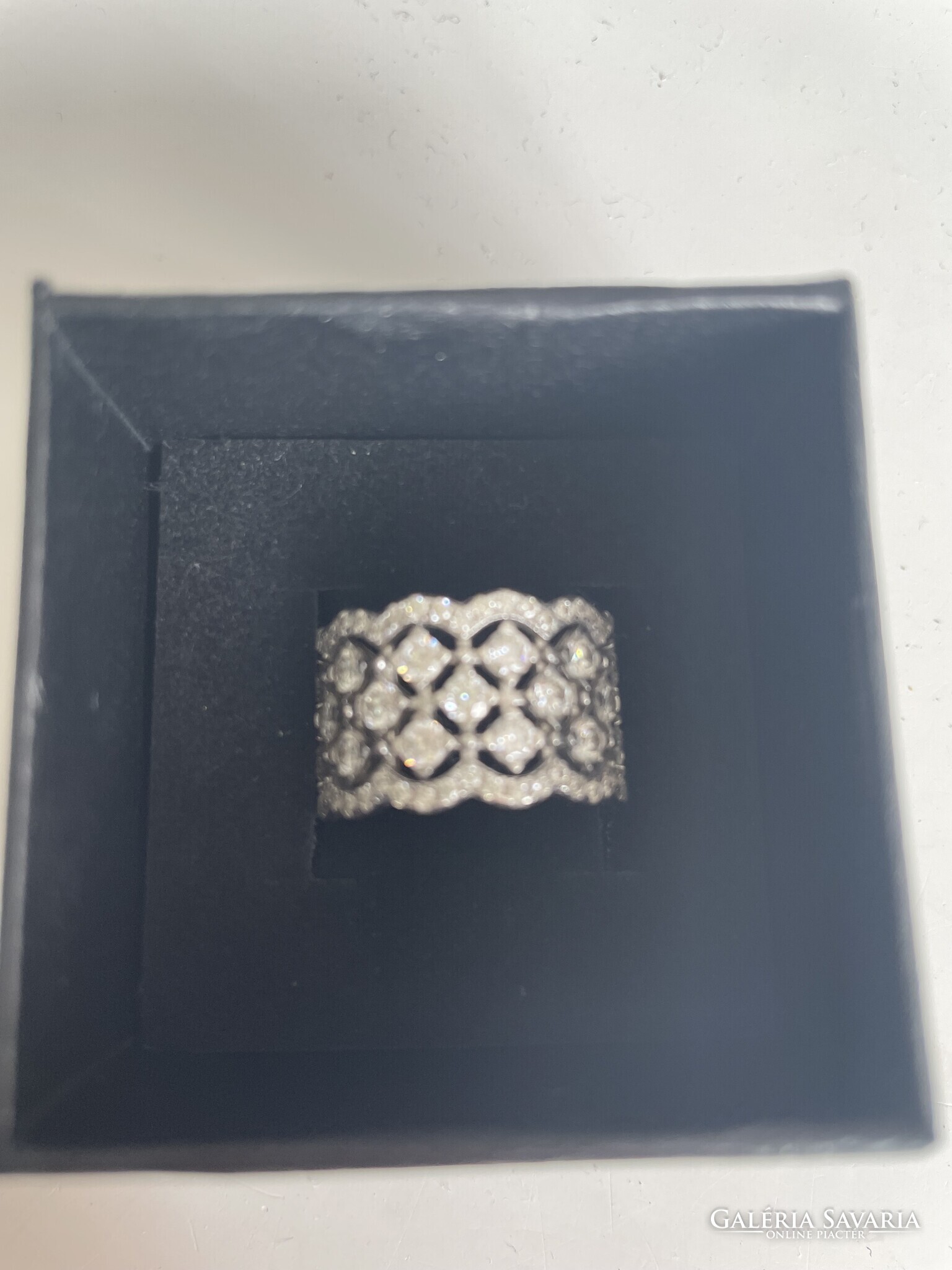 Gyönyörű szép csillogó moissanite 2 karátos gyémántok, nem hiányzik egy sem. A gyűrű mérete USA7-es EU 54-es, szélessége a köves részen 14mm, alul4,5 mm. A gyűrű certifikáttal rendelkezik.