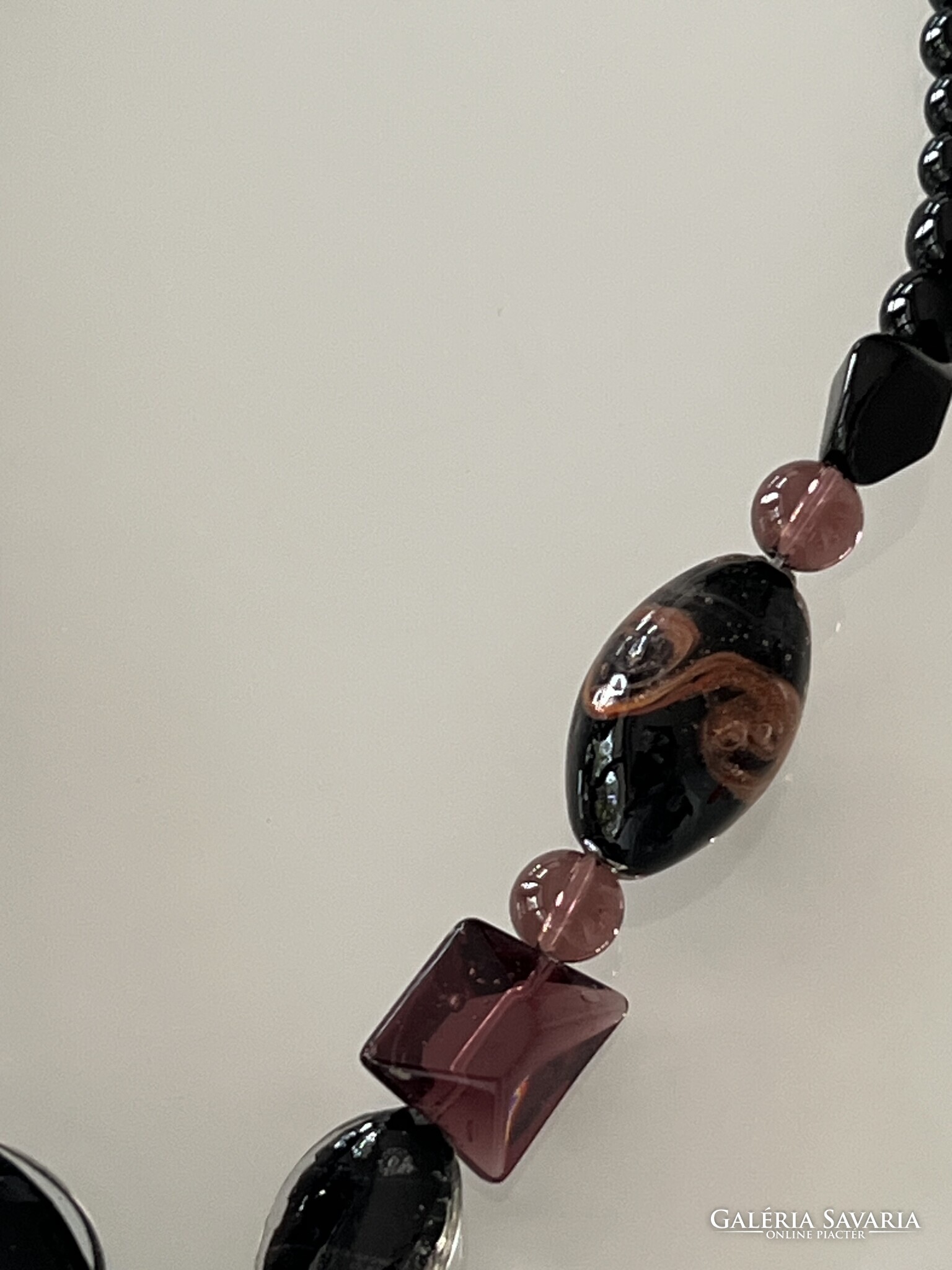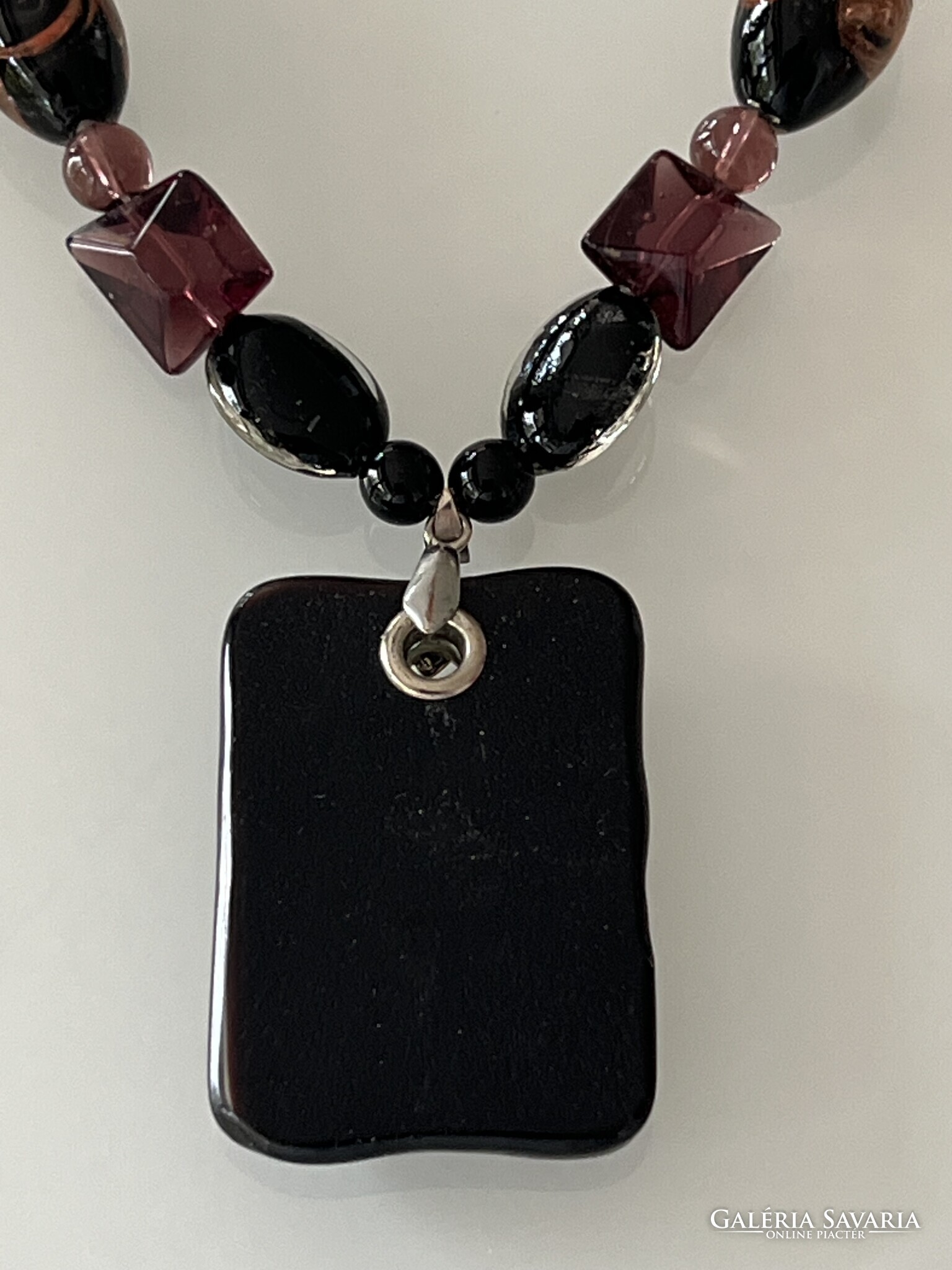 Muránói üveg nyaklánc különlegesen szép medállal. A nyaklánc fő színei a padlizsán és a fekete. A medál 7 x 4 cm, a nyaklánc 50 cm hosszú. Hibátlan darab.