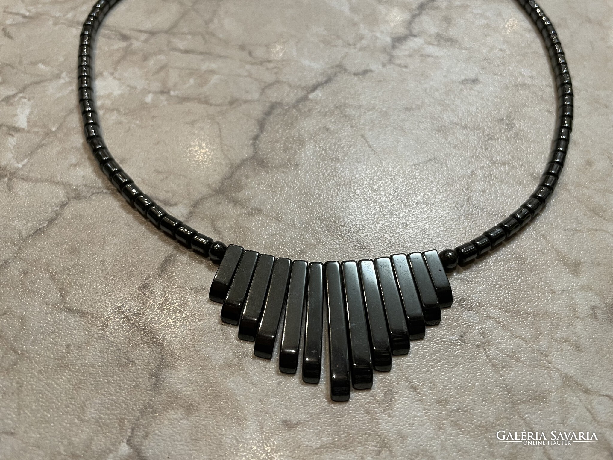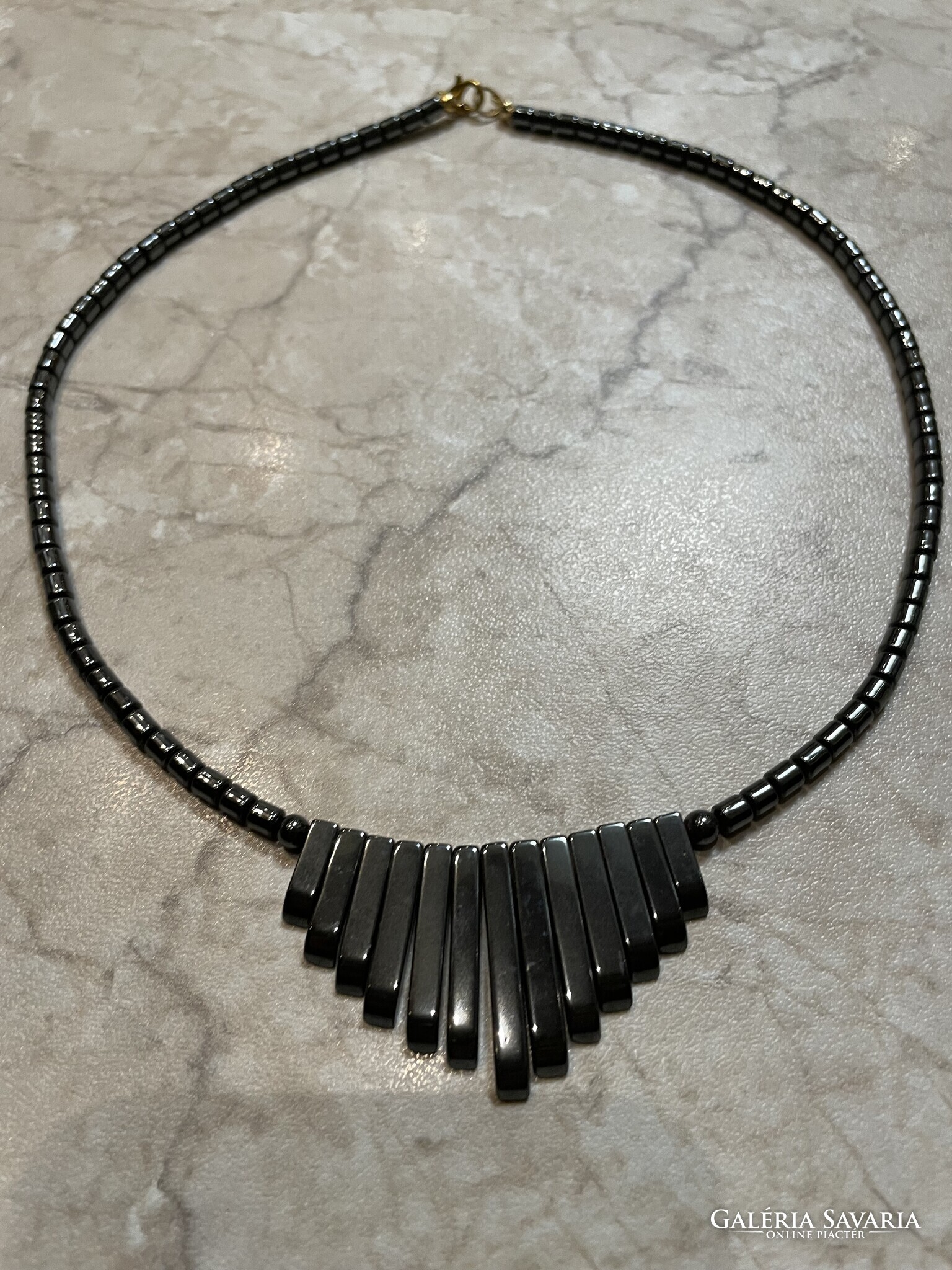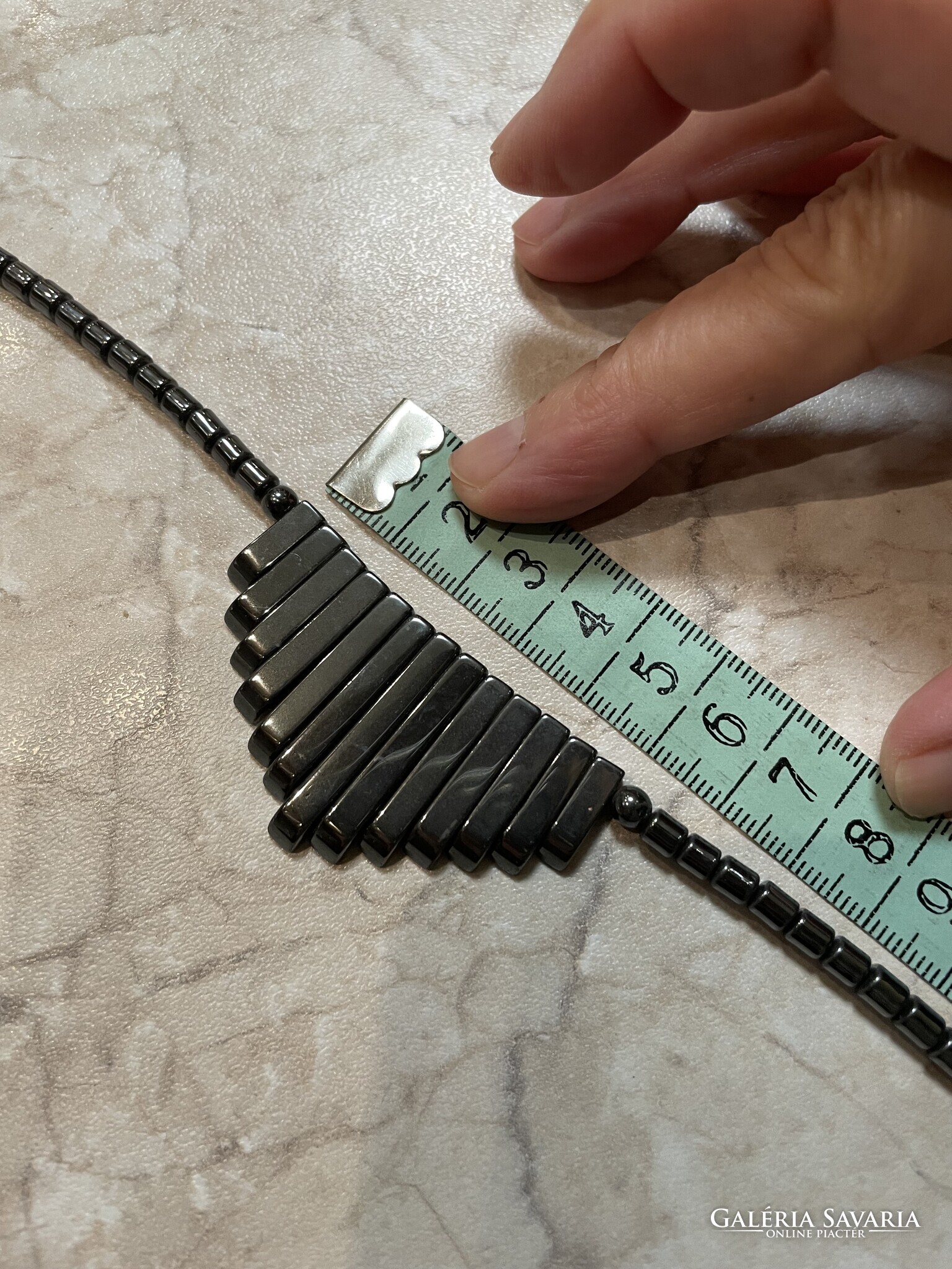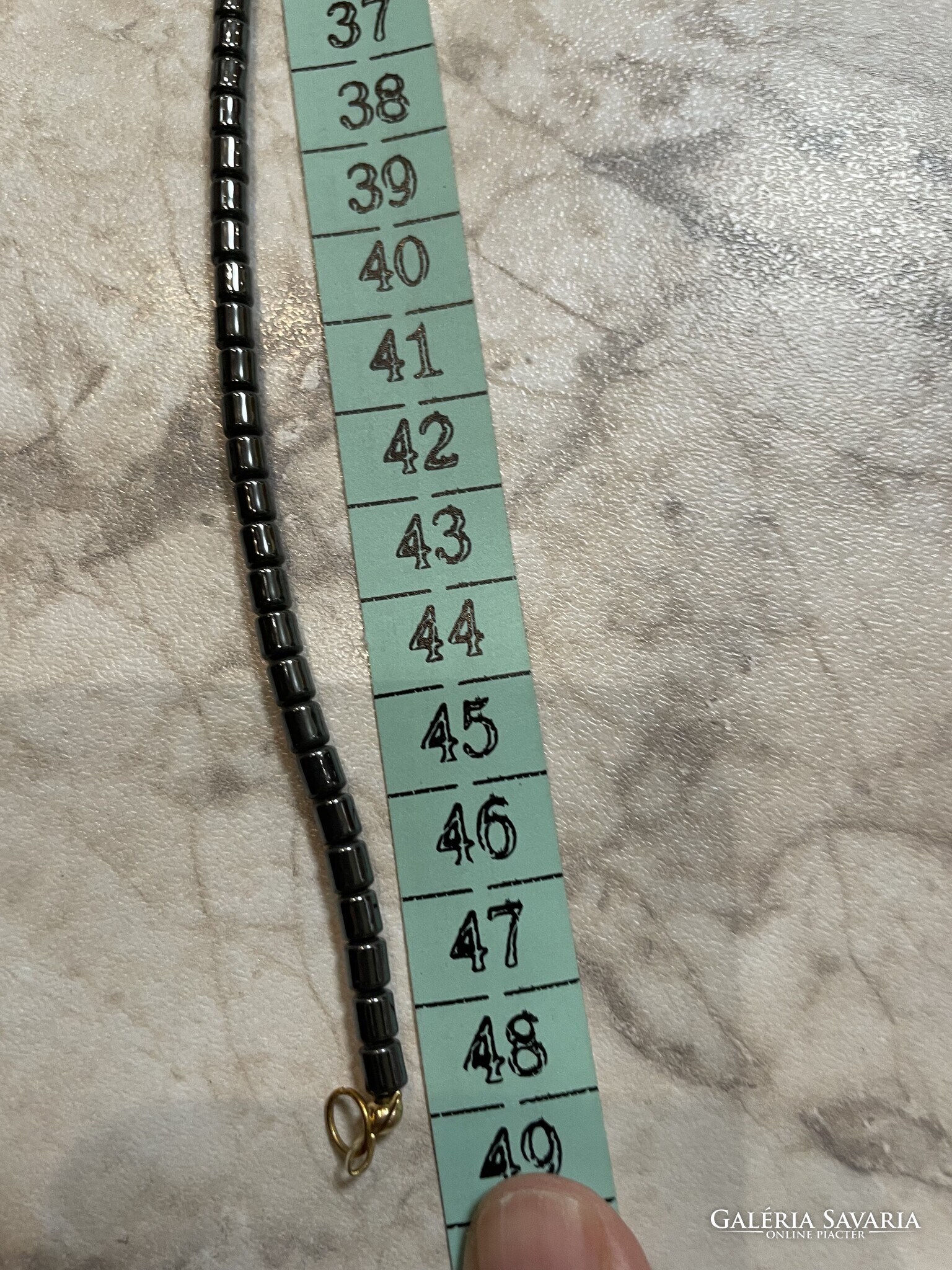 Hematit ásvány gyöngysor, középen lépcsőzetes formájú medállal, a fotókon látható méretben,
