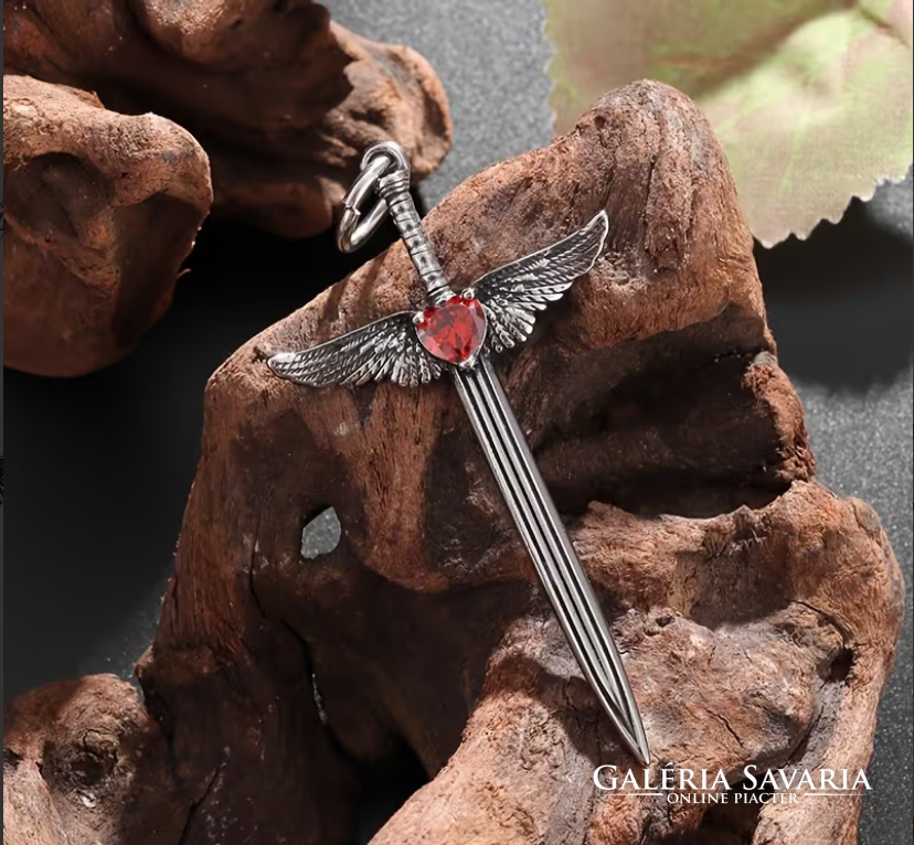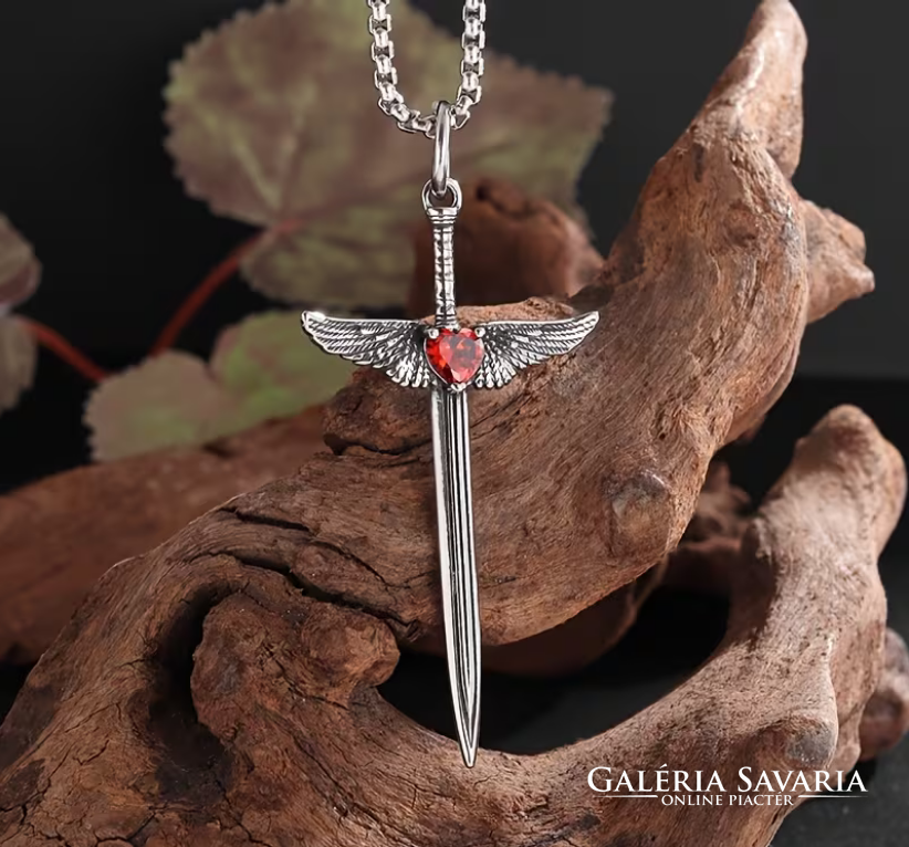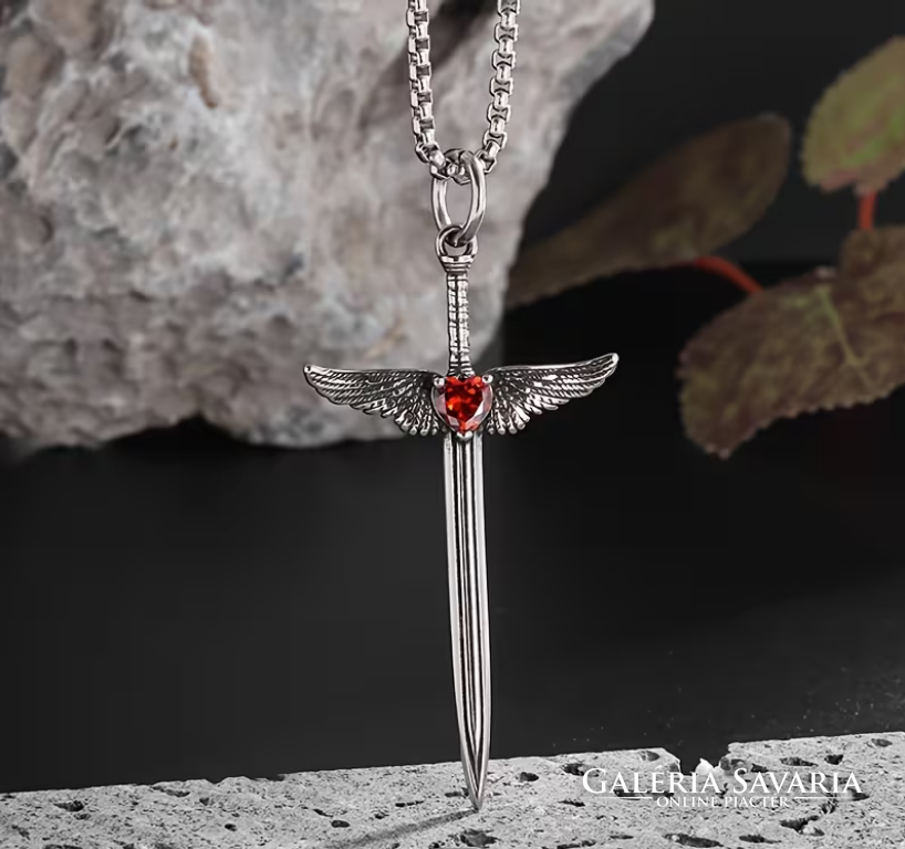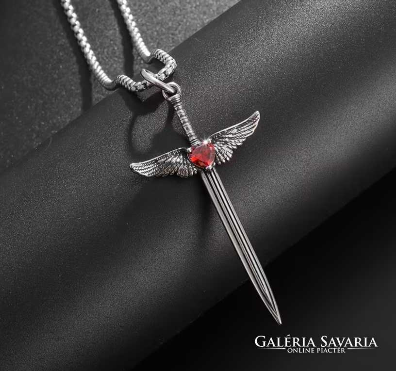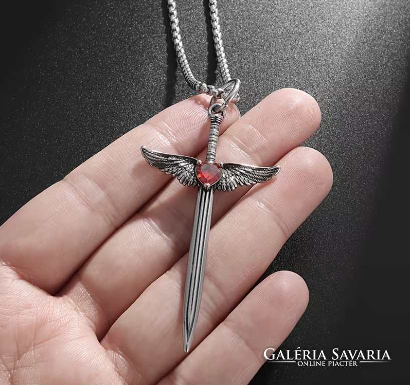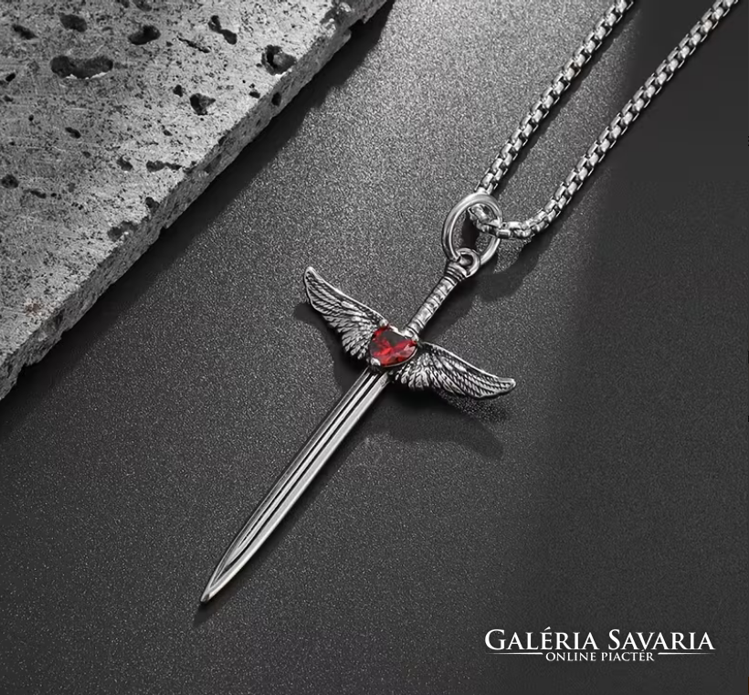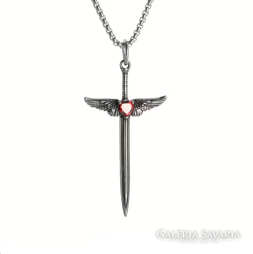 Középkori Angyalszárnyas Kereszt,Kard Medálos Piros cirkónia kővel,nyakláncon szép fényes mind a ke