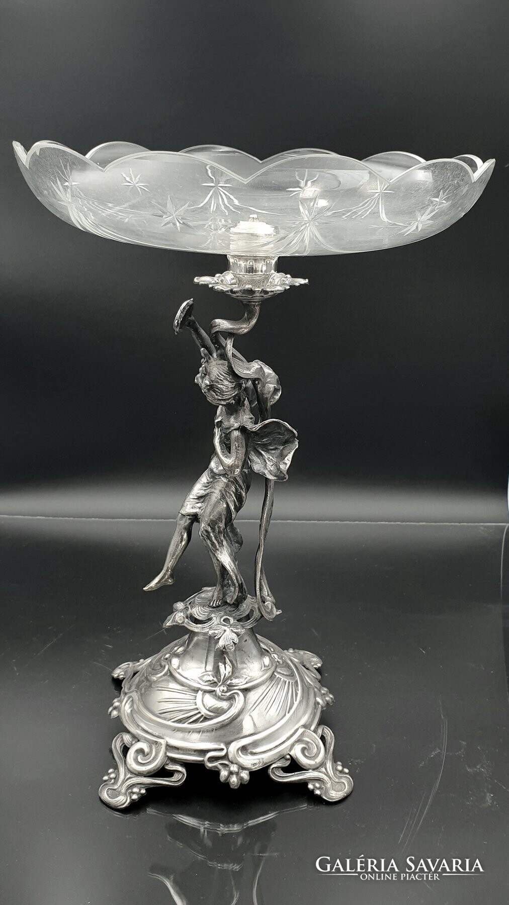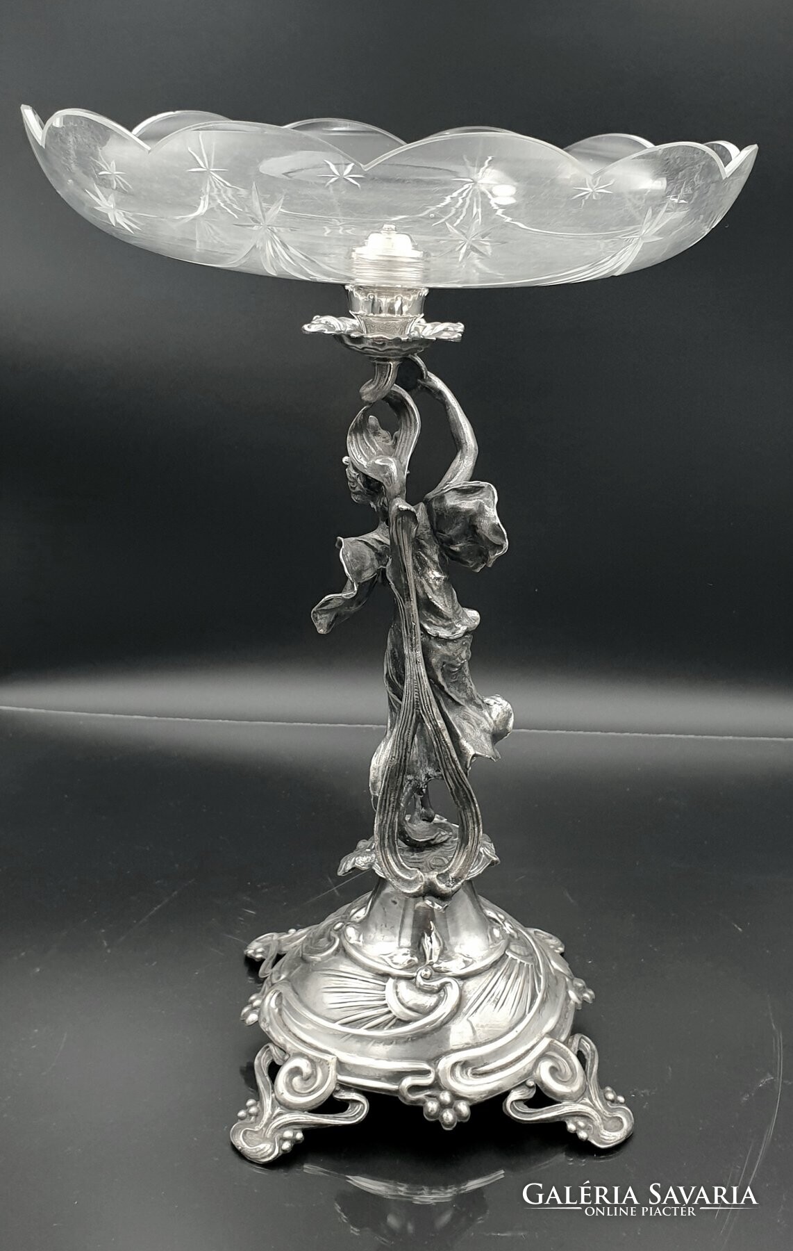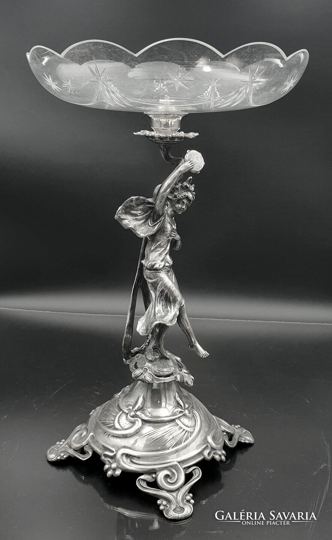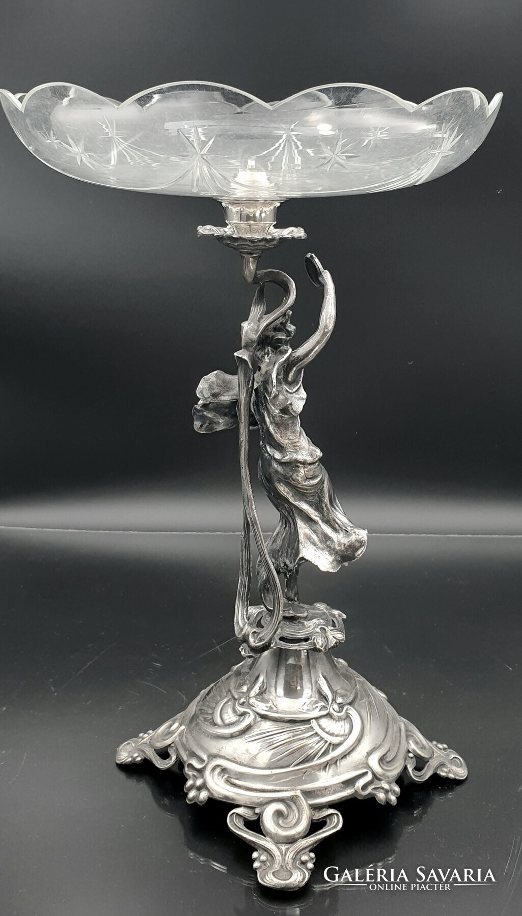 Szecessziós, ezüstözött figurális asztalközép, kínáló, aufsatz
