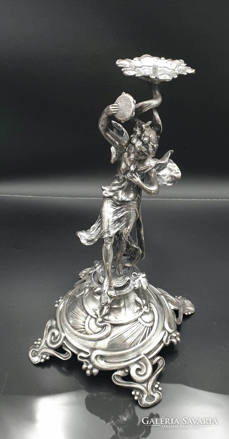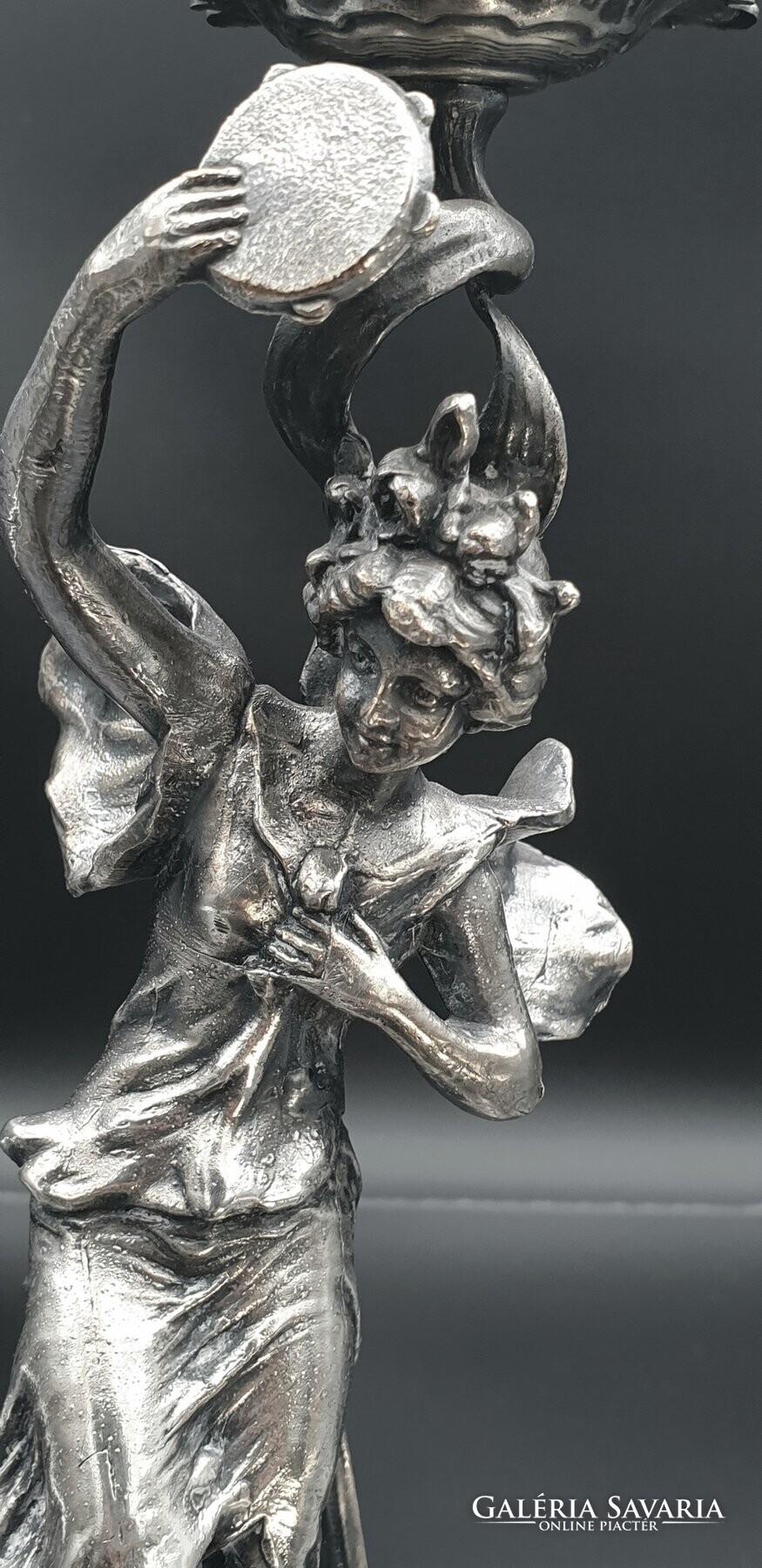 Egy ezüstözött táncoló női szobor tartja az üvegtálat.