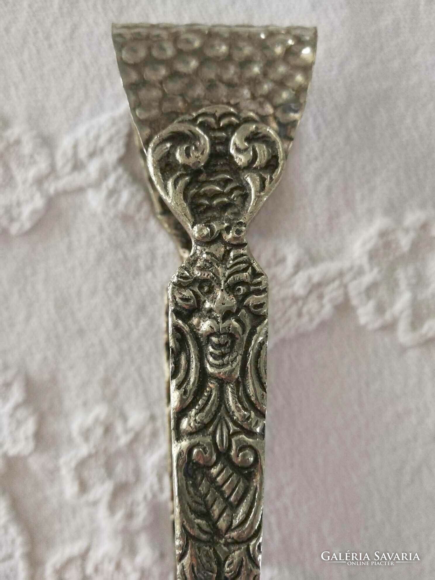 Áttört, ezüst színű süteménycsipesz, tortacsipesz nagyon ritka dekorral. Több részén emberfej ábrázolással.