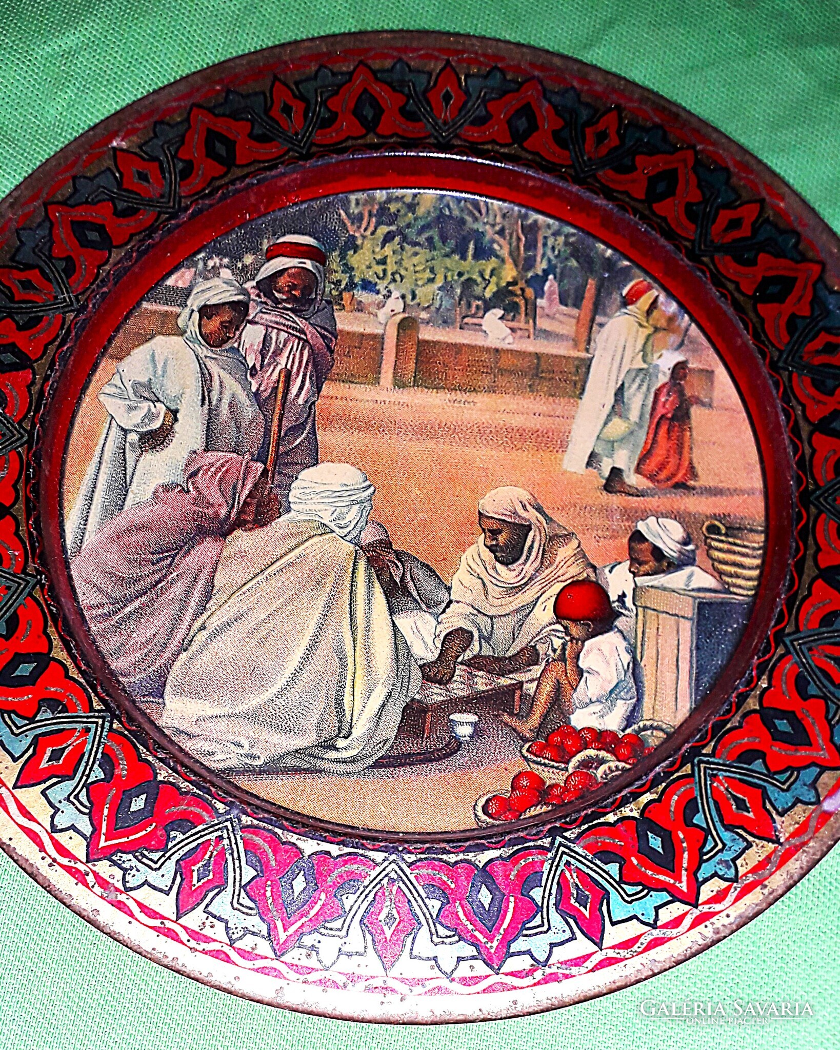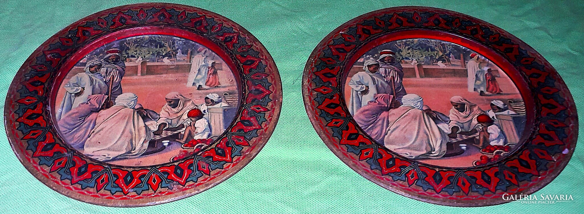 Nagyon szép keleti réz lemez falitálak 2db festett utcai sakk jelenettel EGYBEN 22cm a képek szerint