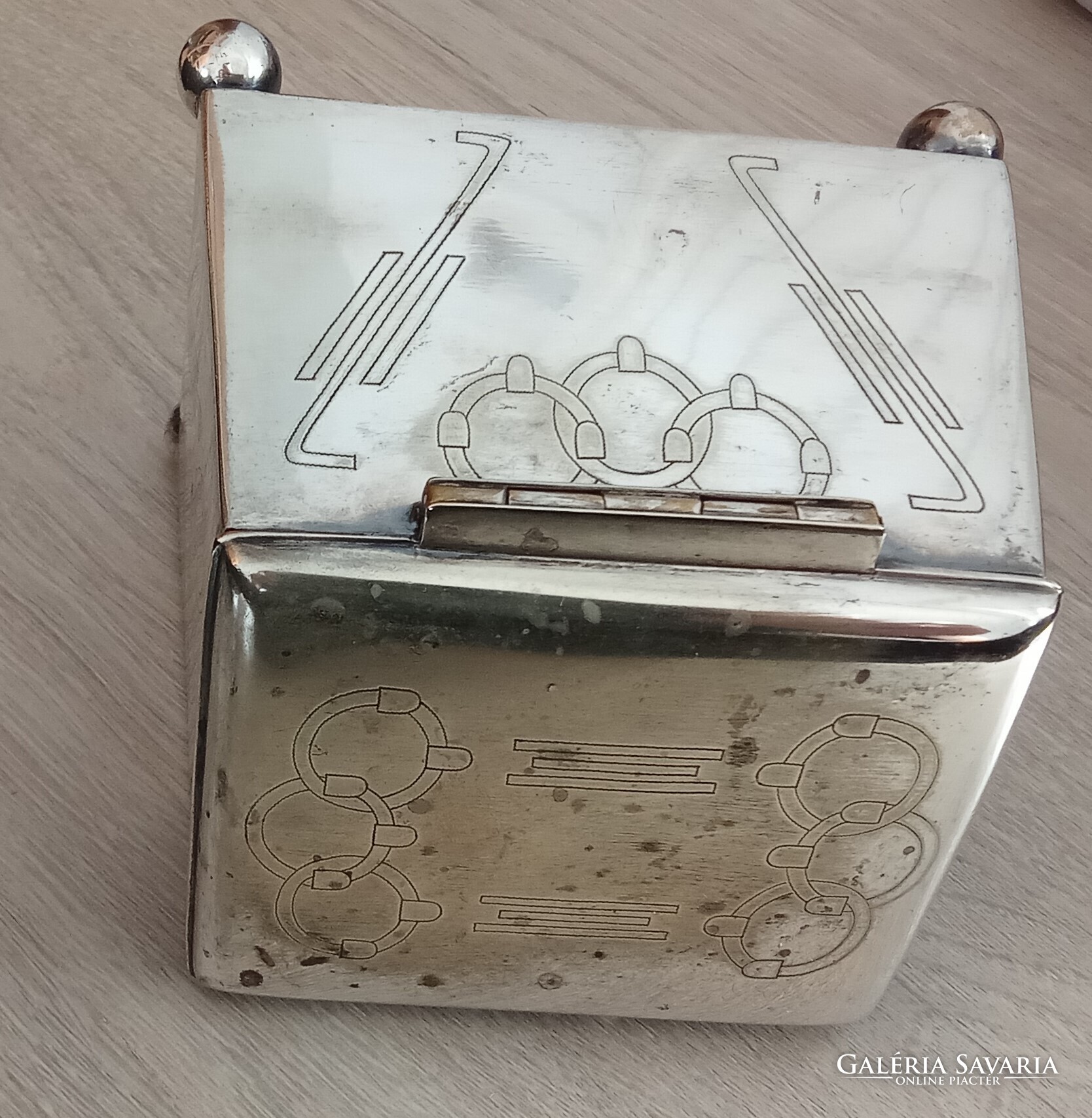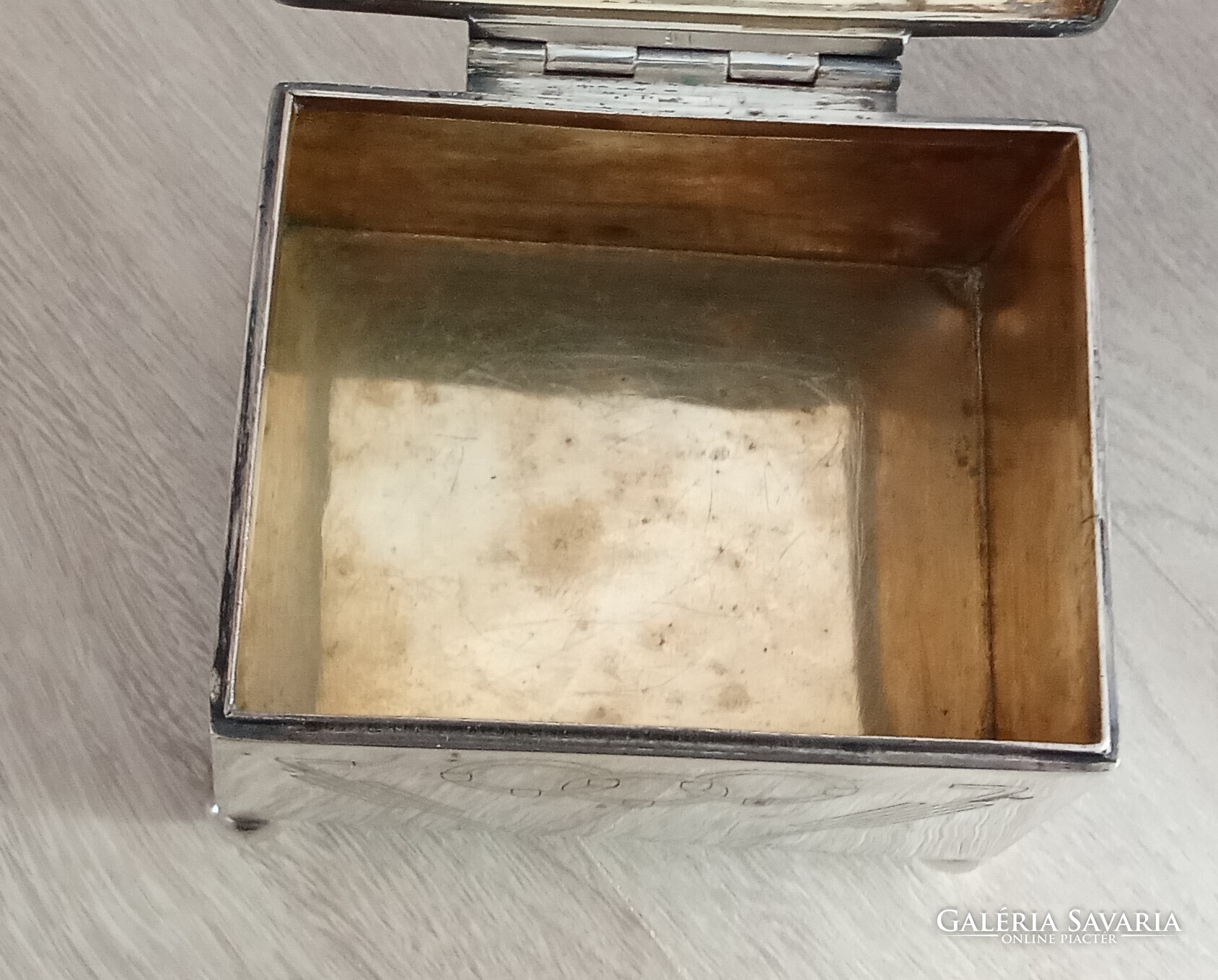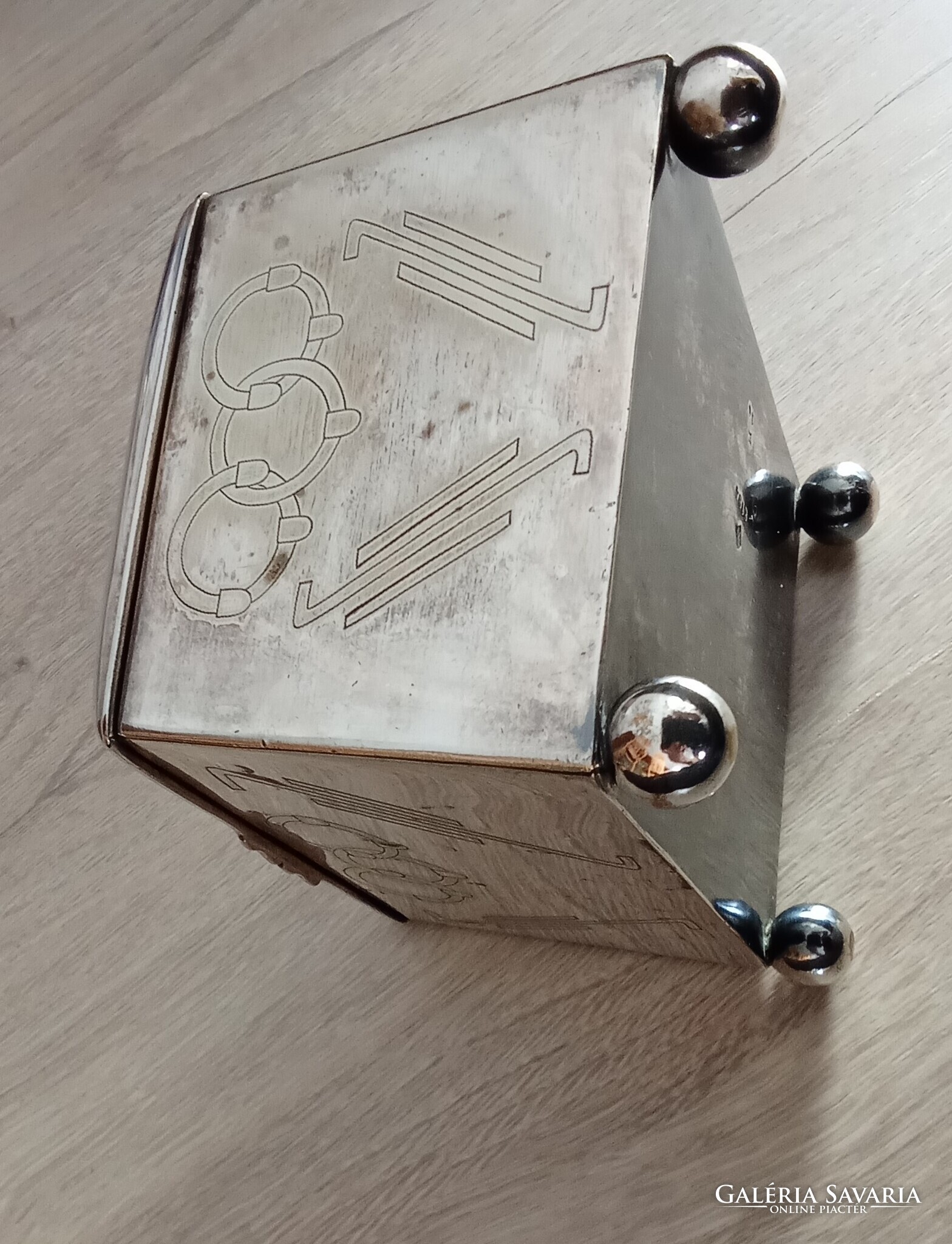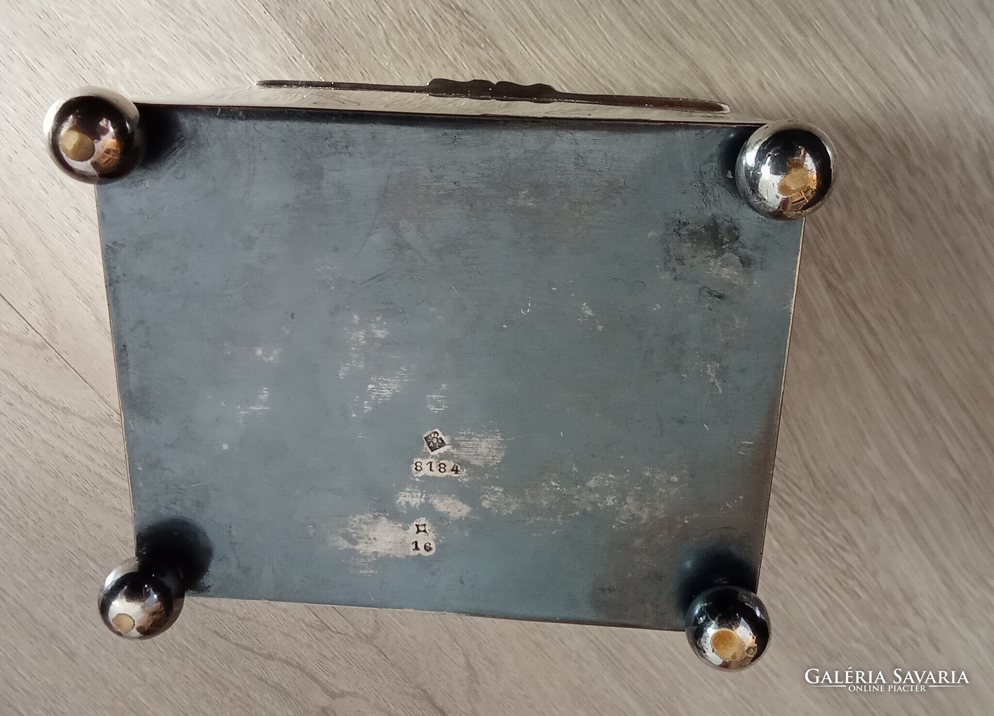 Sandrik-Szandrik Osztrák-Magyar Monarchia, szecessziós cukortartó, nikkelezüstből készült fedéllel, belül aranyozva, alján négy gömblábbal és rombuszban a "Sandrik AE" jelzéssel, alatta a "8184" modellszámmal, alatta egy másik jelzéssel, ez alatt pedig a "16" számmal, a hosszúsága felül: 10,5 cm ; alul 11,5 cm, a szélessége felül és alul is 9,3 cm, a magassága 9 cm, a súly 425 gramm, 1900-1910 körül, korhű, használt állapotban, törés, repedés vagy javítás mentes, a fedél jól záródik, az aranyozás jó állapotban van, nem volt tisztítva