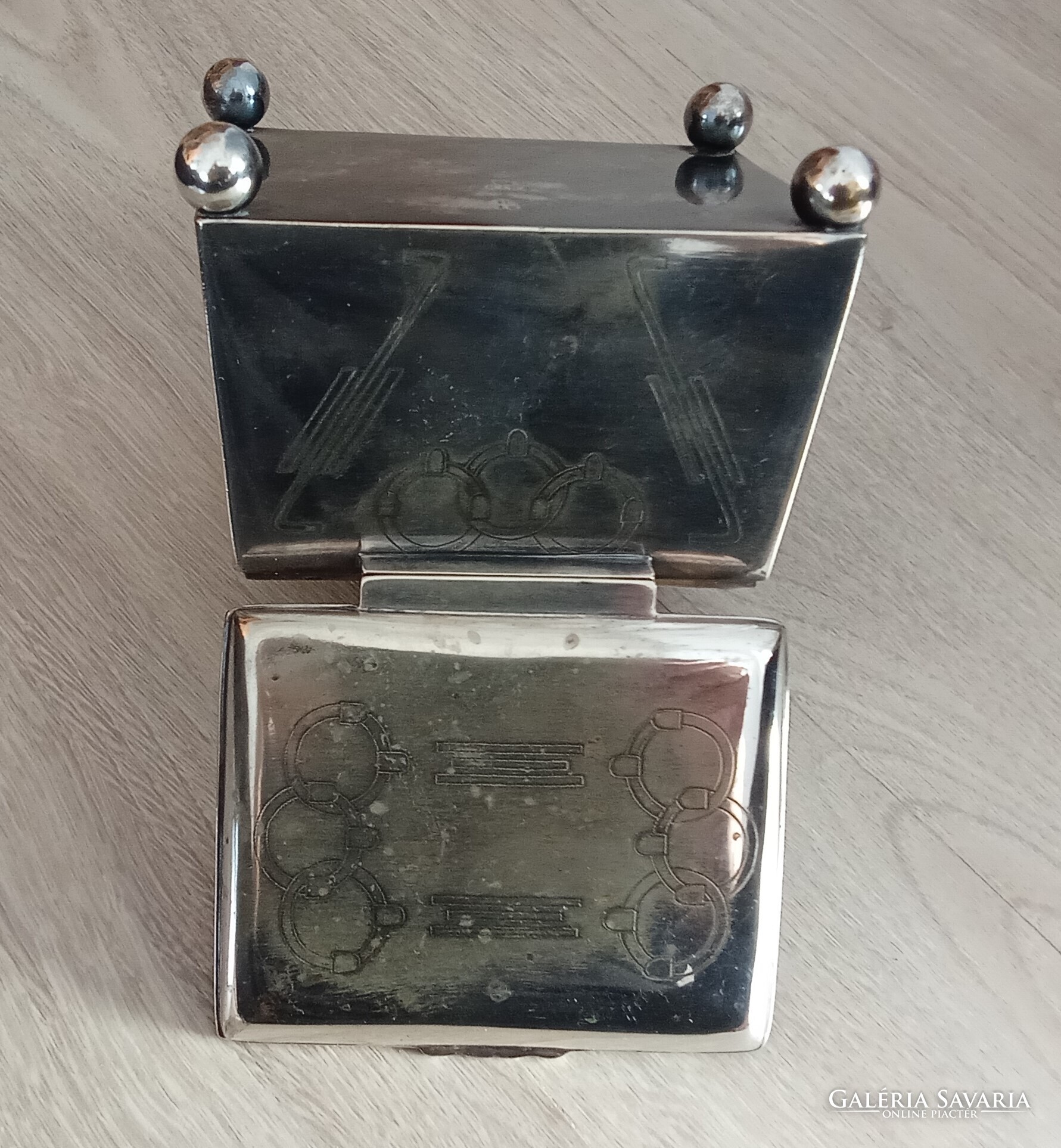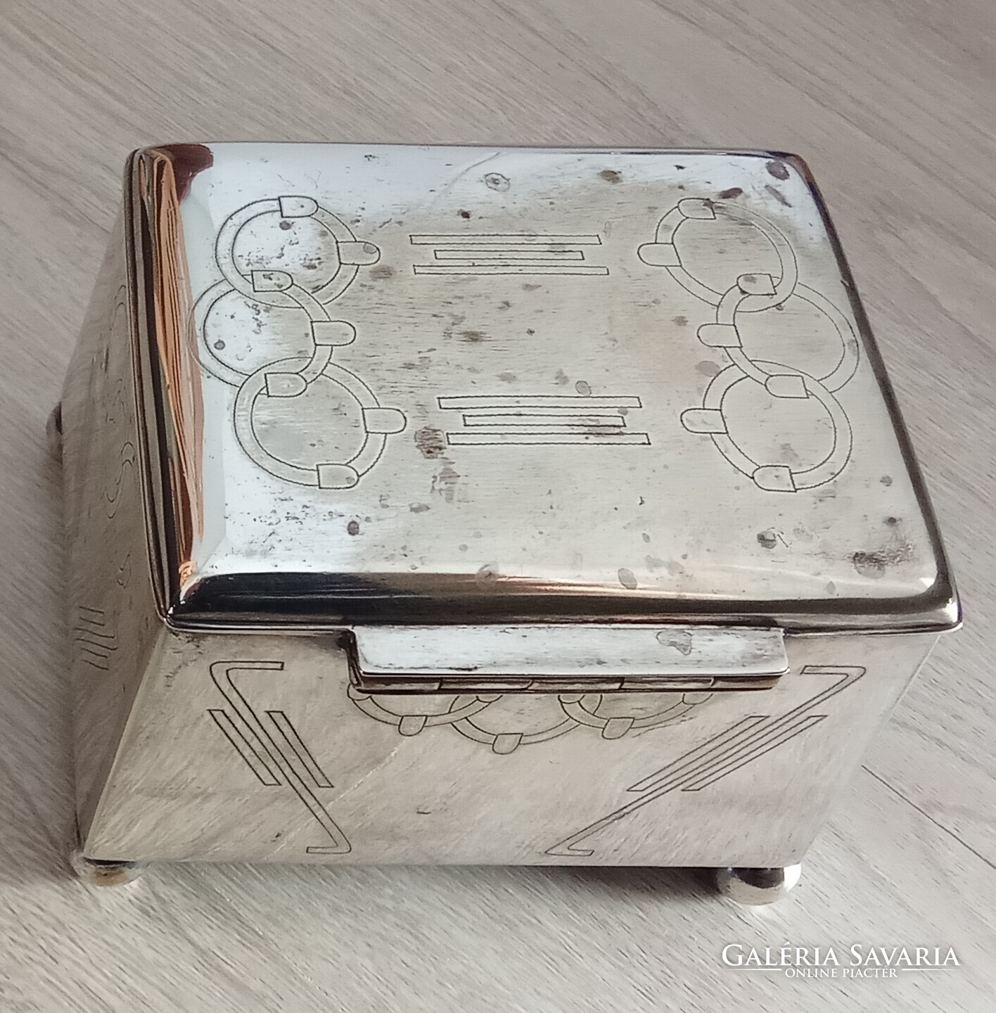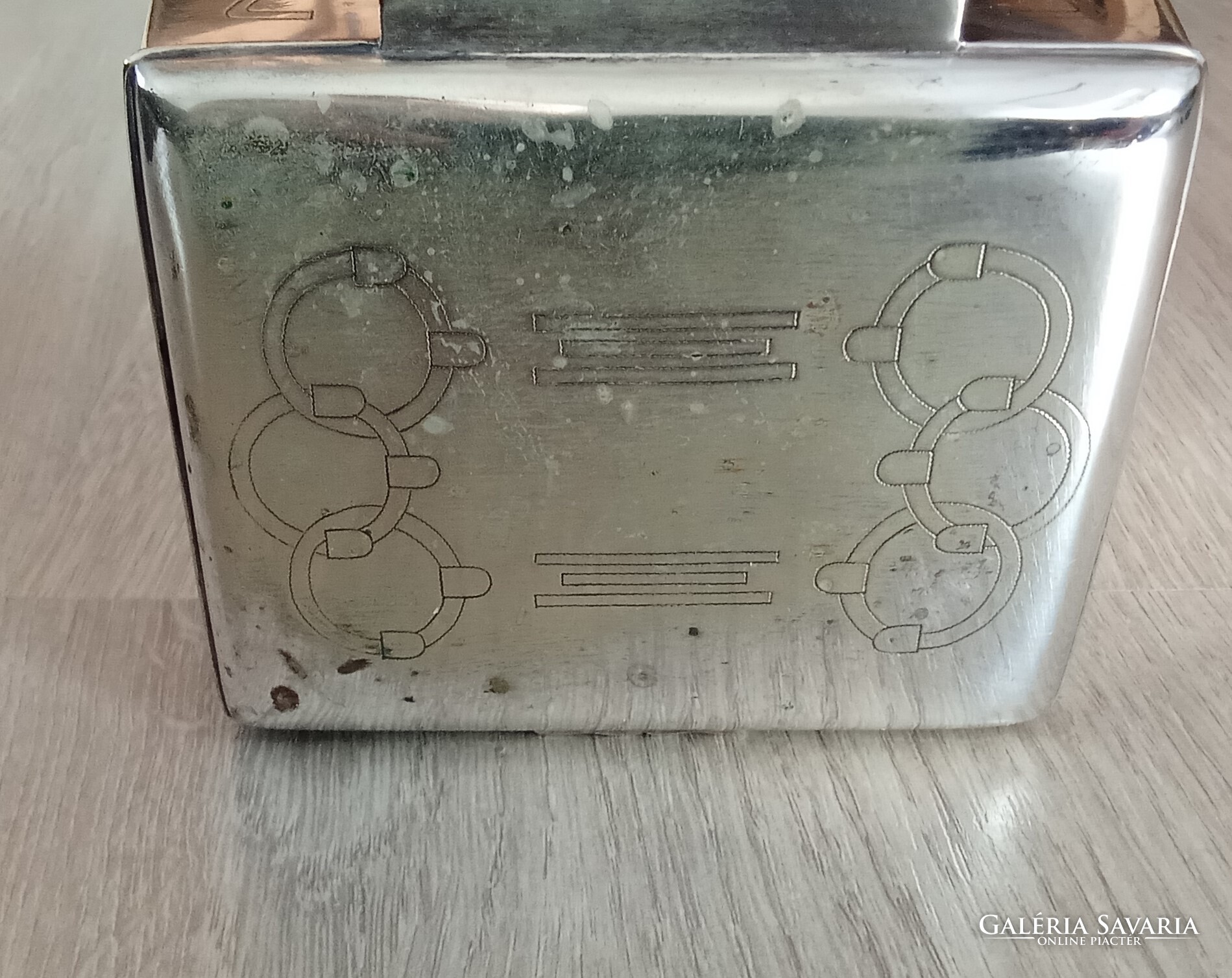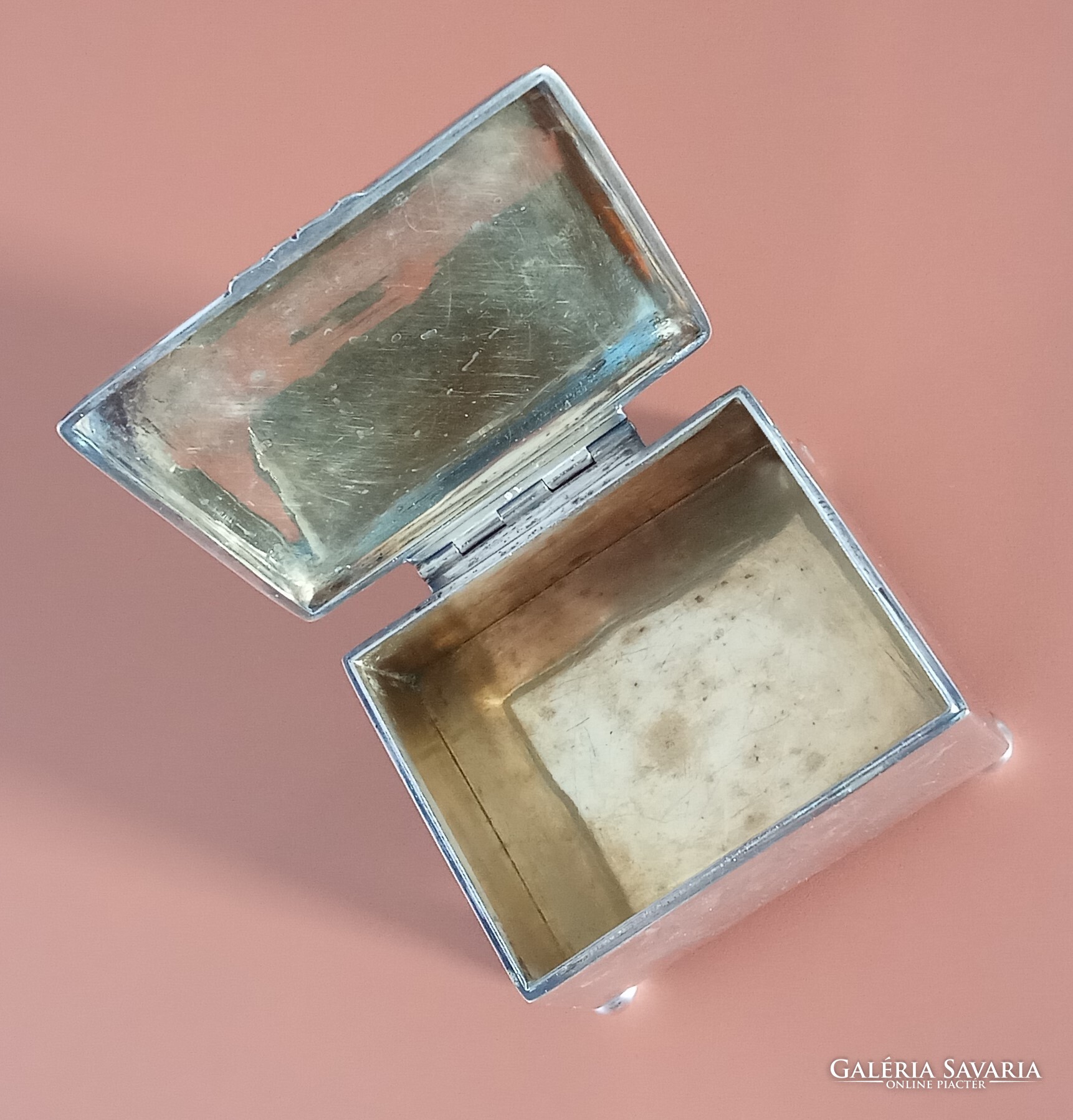 Sandrik-Szandrik Osztrák-Magyar Monarchia, szecessziós cukortartó, nikkelezüstből készült fedéllel, belül aranyozva, alján négy gömblábbal és rombuszban a "Sandrik AE" jelzéssel, alatta a "8184" modellszámmal, alatta egy másik jelzéssel, ez alatt pedig a "16" számmal, a hosszúsága felül: 10,5 cm ; alul 11,5 cm, a szélessége felül és alul is 9,3 cm, a magassága 9 cm, a súly 425 gramm, 1900-1910 körül, korhű, használt állapotban, törés, repedés vagy javítás mentes, a fedél jól záródik, az aranyozás jó állapotban van, nem volt tisztítva