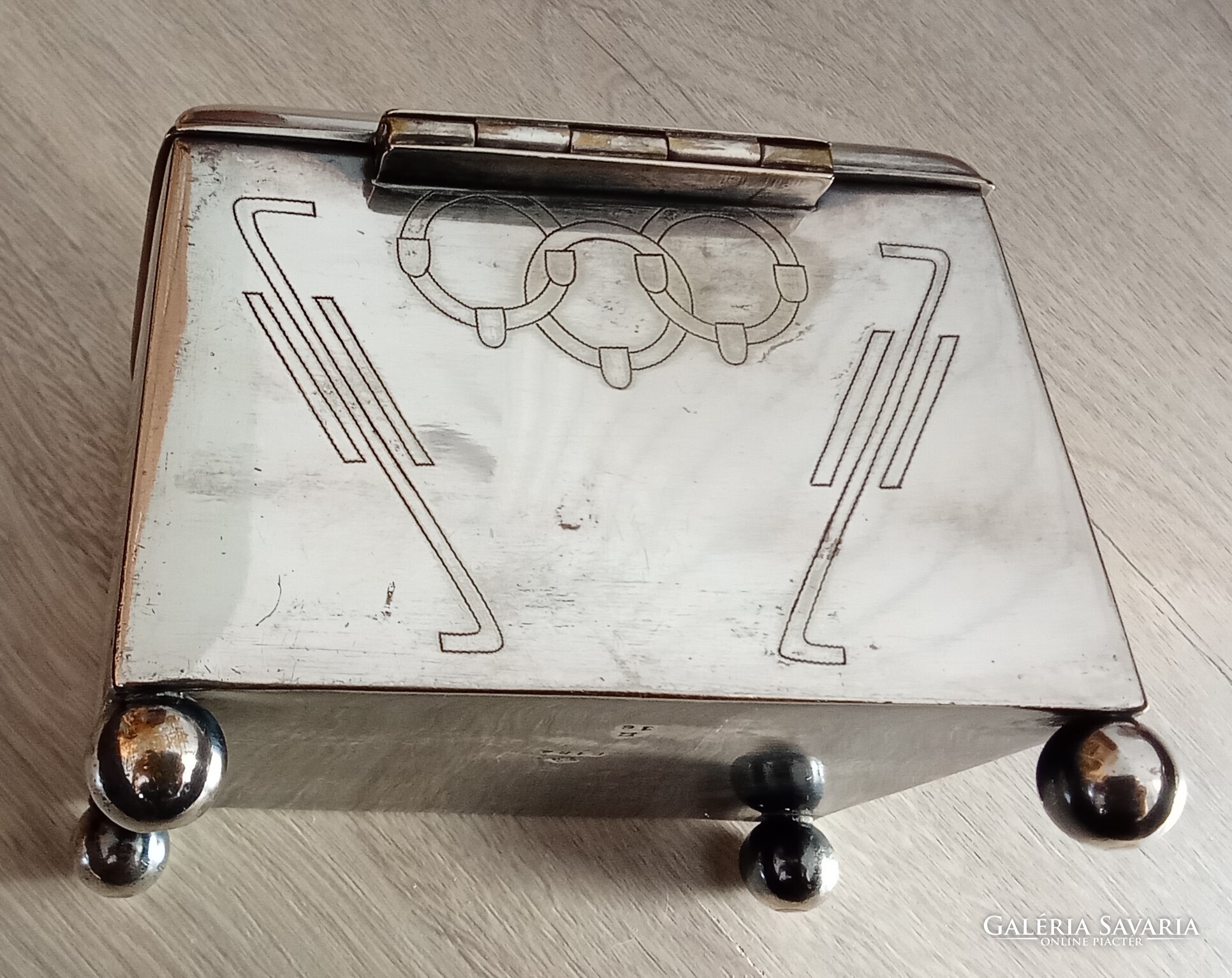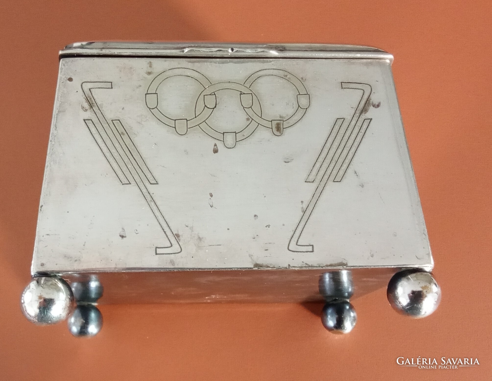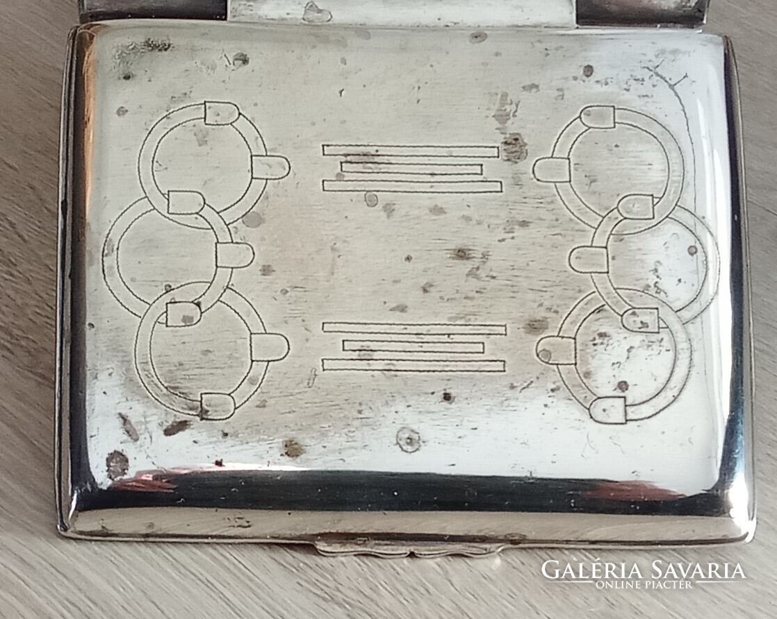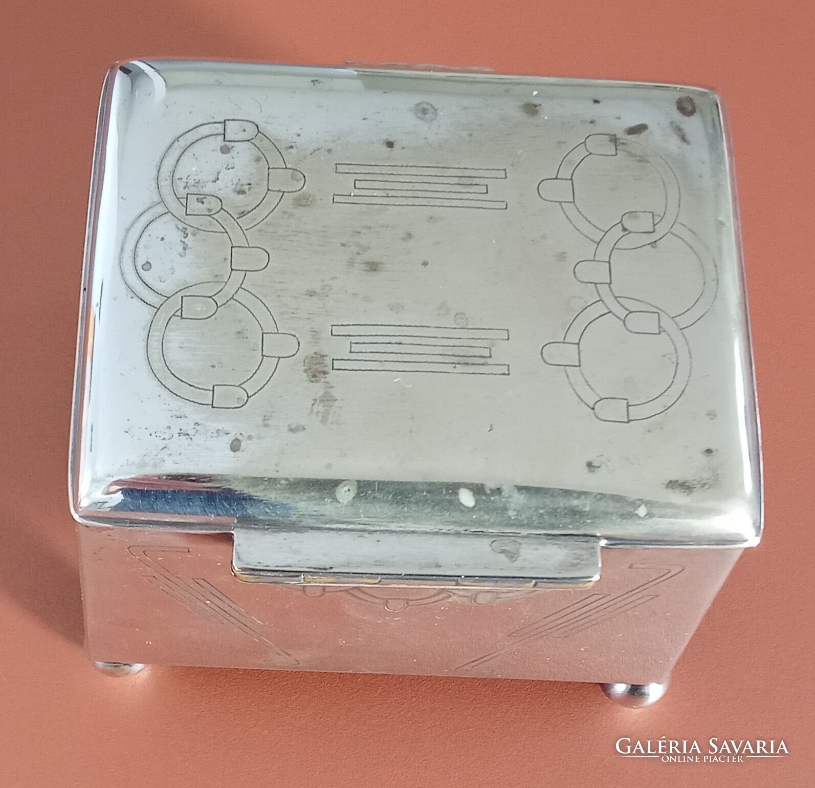 Sandrik-Szandrik Osztrák-Magyar Monarchia, szecessziós cukortartó, nikkelezüstből készült fedéllel, belül aranyozva, alján négy gömblábbal és rombuszban a "Sandrik AE" jelzéssel, alatta a "8184" modellszámmal, alatta egy másik jelzéssel, ez alatt pedig a "16" számmal, a hosszúsága felül: 10,5 cm ; alul 11,5 cm, a szélessége felül és alul is 9,3 cm, a magassága 9 cm, a súly 425 gramm, 1900-1910 körül, korhű, használt állapotban, törés, repedés vagy javítás mentes, a fedél jól záródik, az aranyozás jó állapotban van, nem volt tisztítva