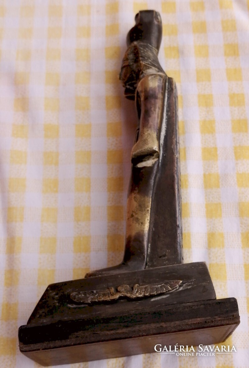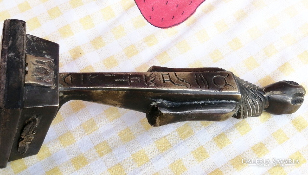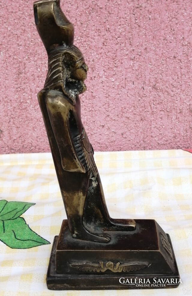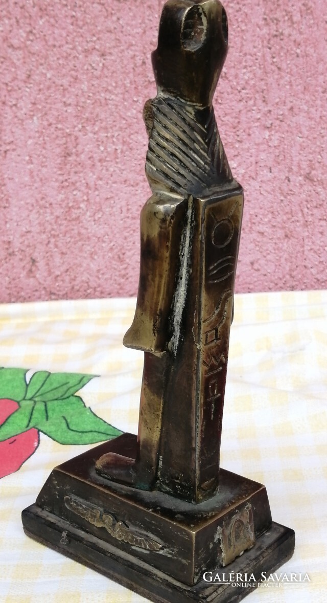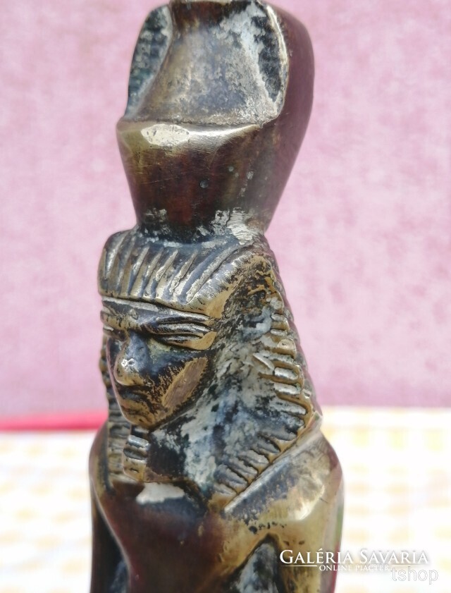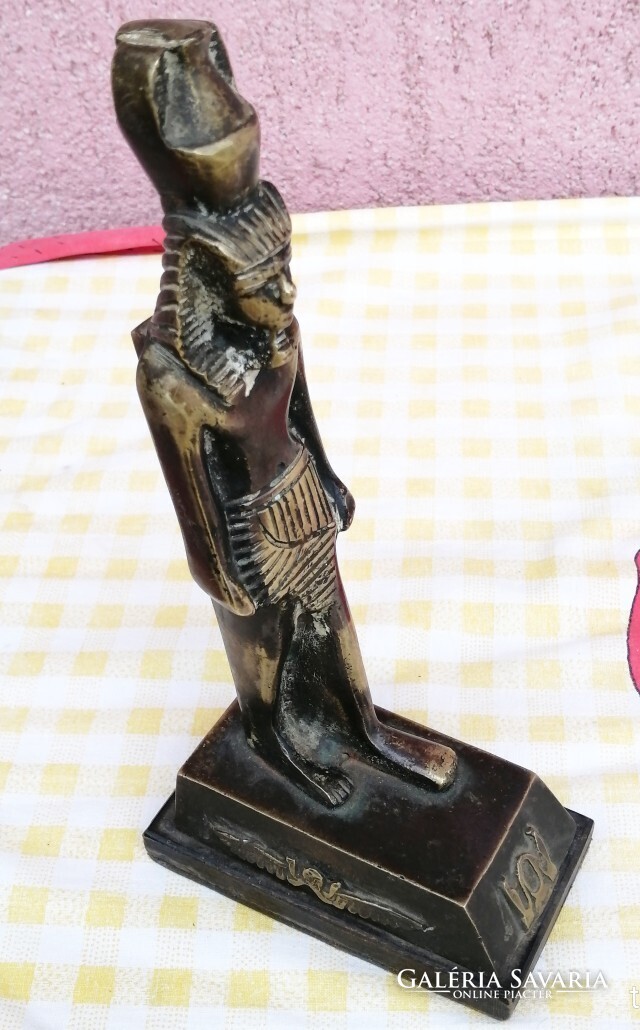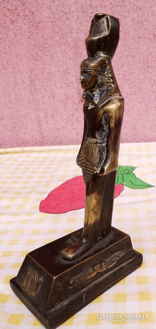 Gyönyörűen megmunkált aprólékos kézműves munkával tömör bronzból készült, Egyiptomi fáraót ábrázoló alkotás. A talapzaton körben egyiptomi szimbólumokkal, és a hátoldalán egyiptomi hieroglifákkal díszítve.