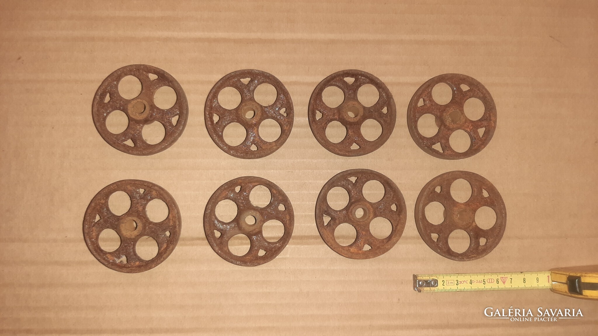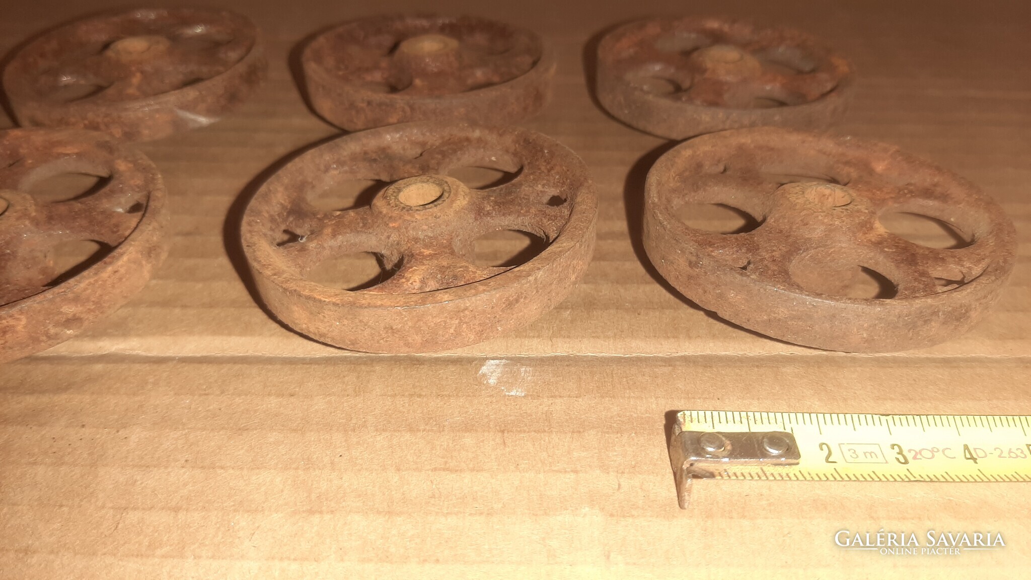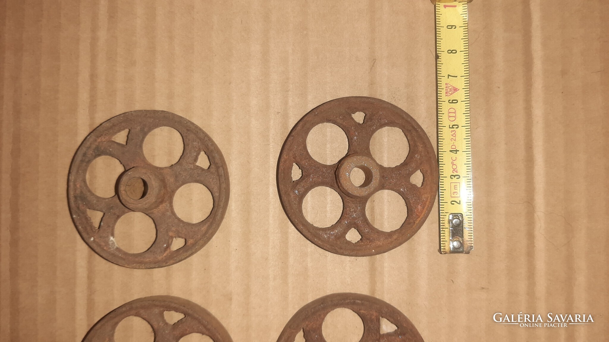 Eladó a képeken látható öntöttvas kerekek antik gurulós játékokhoz. Átmérője 63 mm.