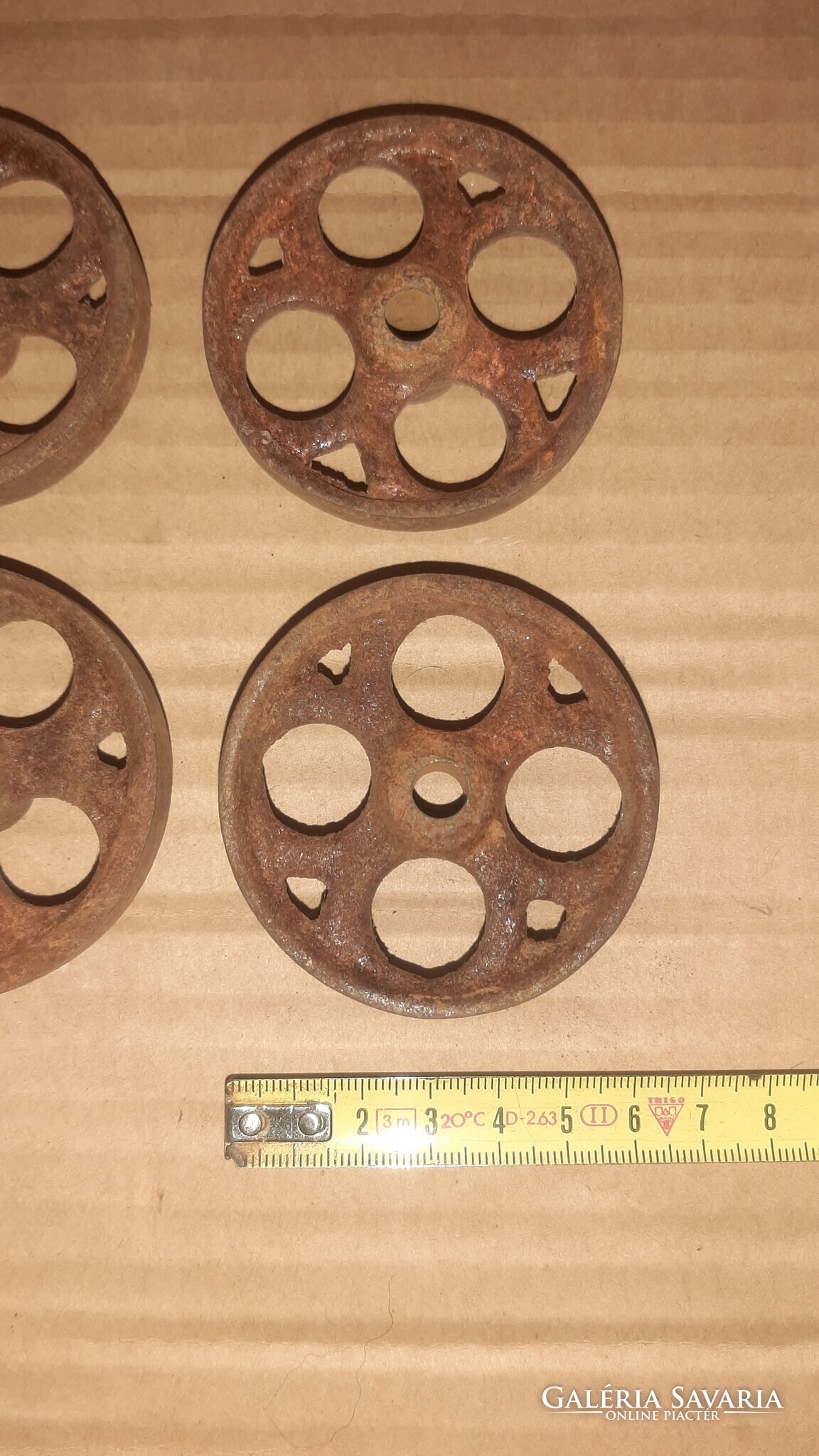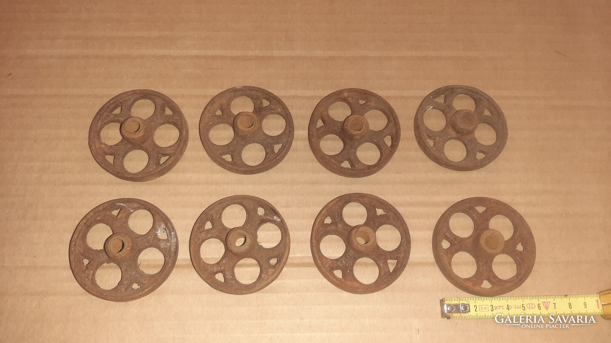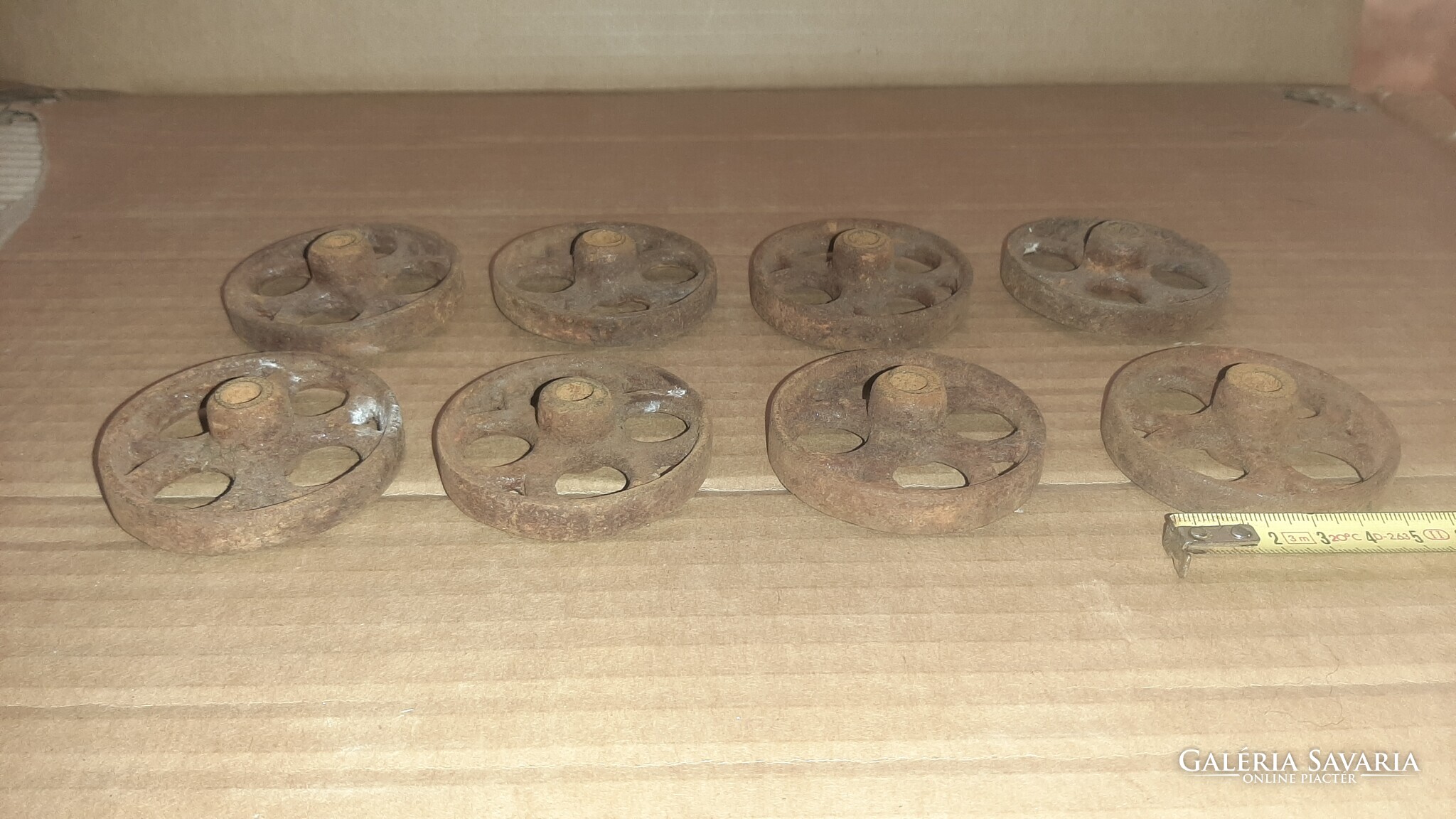 Eladó a képeken látható öntöttvas kerekek antik gurulós játékokhoz. Átmérője 63 mm.